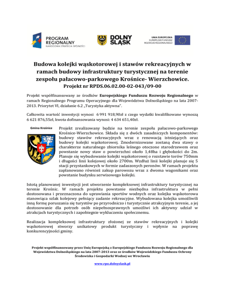 Budowa kolejki wąskotorowej i stawów rekreacyjnych w ramach budowy infrastruktury turystycznej na terenie zespołu pałacowo-parkowego Krośnice- Wierzchowice. Projekt nr RPDS.06.02.00-02-043/09-00 Projekt współfinansowany ze środków Europejskiego Funduszu Rozwoju Regionalnego w ramach Regionalnego Programu Operacyjnego dla Województwa Dolnośląskiego na lata 20072013. Priorytet VI, działanie 6.2 „Turystyka aktywna”. Całkowita wartość inwestycji wynosi 6 991 918,90zł z czego wydatki kwalifikowane wynoszą 6 621 876,55zł, kwota dofinansowania wynosi: 4 634 651,40zł. Gmina Krośnice Projekt zrealizowany będzie na terenie zespołu pałacowo-parkowego Krośnice-Wierzchowice. Składa się z dwóch zasadniczych komponentów: budowy stawów rekreacyjnych wraz z renowacją istniejących oraz budowy kolejki wąskotorowej. Zmodernizowane zostaną dwa stawy o charakterze naturalnego zbiornika leśnego otoczone starodrzewem oraz powstanie nowy staw o powierzchni około 1,48ha i głębokości do 2m. Planuje się wybudowanie kolejki wąskotorowej o rozstawie torów 750mm i długości linii kolejowej około 2700m. Wzdłuż linii kolejki planuje się 5 stacji przystankowych w formie zadaszonych peronów. W ramach projektu zaplanowano również zakup parowozu wraz z dwoma wagonikami oraz powstanie budynku serwisowego kolejki. Istotą planowanej inwestycji jest utworzenie kompleksowej infrastruktury turystycznej na terenie Krośnic. W ramach projektu powstanie niezbędna infrastruktura w pełni dostosowana i przeznaczona do uprawiania sportów wodnych oraz kolejka wąskotorowa stanowiąca szlak kolejowy pełniący zadanie rekreacyjne. Wybudowana kolejka umożliwili inną formę poruszania się turystów po przyrodniczo i turystycznie atrakcyjnym terenie, a jej dostosowanie dla potrzeb osób niepełnosprawnych umożliwi ich aktywny udział w atrakcjach turystycznych i zapobiegnie wykluczeniu społecznemu. Realizacja kompleksowej infrastruktury złożonej ze stawów rekreacyjnych i kolejki wąskotorowej stworzy unikatowy produkt turystyczny i wpłynie na poprawę konkurencyjności gminy. Projekt współfinansowany przez Unię Europejską z Europejskiego Funduszu Rozwoju Regionalnego dla Województwa Dolnośląskiego na lata 2007-2013 oraz ze środków Wojewódzkiego Funduszu Ochrony Środowiska i Gospodarki Wodnej we Wrocławiu www.rpo.dolnyslask.pl