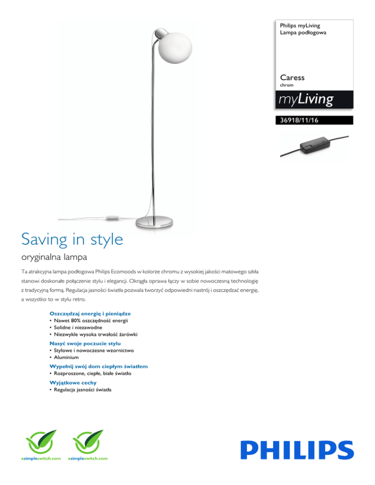 Philips myLiving Lampa podłogowa Caress chrom myLiving 36918/11/16 Saving in style oryginalna lampa Ta atrakcyjna lampa podłogowa Philips Ecomoods w kolorze chromu z wysokiej jakości matowego szkła stanowi doskonałe połączenie stylu i elegancji. Okrągła oprawa łączy w sobie nowoczesną technologię z tradycyjną formą. Regulacja jasności światła pozwala tworzyć odpowiedni nastrój i oszczędzać energię, a wszystko to w stylu retro. Oszczędzaj energię i pieniądze • Nawet 80% oszczędność energii • Solidne i niezawodne • Niezwykle wysoka trwałość żarówki Nasyć swoje poczucie stylu • Stylowe i nowoczesne wzornictwo • Aluminium Wypełnij swój dom ciepłym światłem • Rozproszone, ciepłe, białe światło Wyjątkowe cechy • Regulacja jasności światła 369181116 Lampa podłogowa Caress chrom Zalety Dane techniczne Nawet 80% oszczędność energii każdy ich moduł jest wykonany z wysokiej jakości części i materiałów. To doskonałe oprawy na wiele, wiele lat. Stylistyka i wykończenie Stylowe i nowoczesne wzornictwo Dodatkowe funkcje/akcesoria w zestawie Linia Ecomoods charakteryzuje się czystym, nowoczesnym wyglądem, który przełamuje stereotyp tradycyjnych produktów energooszczędnych — masywnych i nieatrakcyjnych. Jest smukła i stylowa — każda oryginalna lampa z tej kolekcji została starannie zaprojektowana jako idealne połączenie formy i funkcjonalności. Rozproszone, ciepłe, białe światło • Materiał: metal, szkło • Kolor: chrom • Regulator przyciemniania na przewodzie • Świetlówki w zestawie Wymiary i waga produktu • • • • Wysokość: 160,8 cm Długość: 28,5 cm Szerokość: 44,2 cm Waga netto: 9,700 kg Dane techniczne Dużą zaletą fluorescencyjnego oświetlenia jest jego energooszczędność. Świetlówka zużywa jedynie jedną piątą energii wykorzystywanej przez konwencjonalną żarówkę. To oznacza, że instalując oświetlenie fluorescencyjne firmy Philips w swoim domu zamiast standardowych żarówek, możesz obniżyć rachunki za prąd o około 80%! • • • • • • Niezwykle wysoka trwałość żarówki Ta lampa wykorzystuje najnowszą technologię opracowaną przez firmę Philips, która pozwala uzyskać ciepłe, naturalne, białe światło przy jednoczesnej oszczędności energii. Efekt rozproszonego światła rozjaśni pomieszczenie ciepłym, białym blaskiem. Produkt łączy w sobie funkcjonalność i dbałość o środowisko. Rozproszone światło nadaje się idealnie do ogólnego oświetlenia. Regulacja jasności światła W zestawie żarówka firmy Philips o niezwykłej trwałości — do 8000 godzin użytkowania. • • • • • • • • • • • Zasilanie sieciowe: Przedział 220–240 V, 50–60 Hz Technologia źródła światła: fluorescencyjne, 230 V Liczba źródeł światła: 1 Trzonek: E27 Moc źródła światła w zestawie: 20 W Maksymalna moc wymiennego źródła światła: 20 W Barwa światła: ciepła biel Maksymalna trwałość źródła światła: 10 000 godz. Oprawa z możliwością przyciemniania LED: Nie Wbudowane źródło światła LED: NIE Klasa energetyczna dołączonego źródła światła: A Oprawa jest zgodna ze źródłami światła klasy: A+ do E Współczynnik IP: IP20, ochrona przed przedmiotami powyżej 12,5 mm, brak ochrony przed wodą Klasa ochronności: II — podwójna izolacja Źródło światła odpowiadające tradycyjnej żarówce o mocy: 90 W Moc strumienia świetlnego dołączonego źródła światła w lumenach: 1220 lm Serwis • Gwarancja: 2 lata Solidne i niezawodne Wymiary i waga opakowania Lampa jest wyposażona w regulator przyciemniania umożliwiający ustawienie wybranej jasności światła. Aluminium Aluminium to bardzo nowoczesny, miękki, wytrzymały, lekki materiał o stonowanym srebrnym kolorze. Produkty oświetleniowe Ecomoods firmy Philips gwarantują trwałość przez długi czas, ponieważ Data wydania 2015-04-15 © 2015 Koninklijke Philips N.V. Wszelkie prawa zastrzeżone. Wersja: 1.0.2 Dane techniczne mogą ulec zmianie bez powiadomienia. Znaki towarowe są własnością Koninklijke Philips N.V. lub własnością odpowiednich firm. 12 NC: 9150 036 95801 EAN: 87 17943 77592 7 www.philips.com • • • • Wysokość: 66,9 cm Długość: 33,8 cm Szerokość: 33,8 cm Waga: 11,900 kg Różne • Opracowano z myślą o: Salon i sypialnia • Styl: Nowoczesne • Typ: Lampa podłogowa •