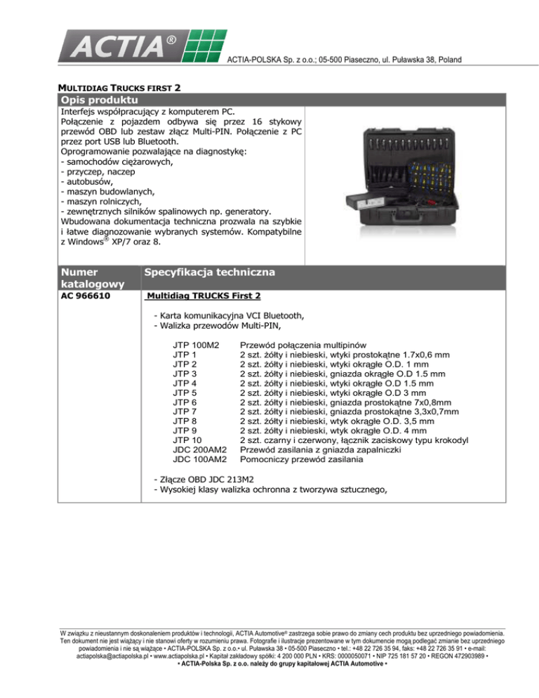 ACTIA-POLSKA Sp. z o.o.; 05-500 Piaseczno, ul. Puławska 38, Poland MULTIDIAG TRUCKS FIRST 2 Opis produktu Interfejs współpracujący z komputerem PC. Połączenie z pojazdem odbywa się przez 16 stykowy przewód OBD lub zestaw złącz Multi-PIN. Połączenie z PC przez port USB lub Bluetooth. Oprogramowanie pozwalające na diagnostykę: - samochodów cięŜarowych, - przyczep, naczep - autobusów, - maszyn budowlanych, - maszyn rolniczych, - zewnętrznych silników spalinowych np. generatory. Wbudowana dokumentacja techniczna prozwala na szybkie i łatwe diagnozowanie wybranych systemów. Kompatybilne z Windows® XP/7 oraz 8. Numer katalogowy Specyfikacja techniczna AC 966610 Multidiag TRUCKS First 2 - Karta komunikacyjna VCI Bluetooth, - Walizka przewodów Multi-PIN, JTP 100M2 JTP 1 JTP 2 JTP 3 JTP 4 JTP 5 JTP 6 JTP 7 JTP 8 JTP 9 JTP 10 JDC 200AM2 JDC 100AM2 Przewód połączenia multipinów 2 szt. Ŝółty i niebieski, wtyki prostokątne 1.7x0,6 mm 2 szt. Ŝółty i niebieski, wtyki okrągłe O.D. 1 mm 2 szt. Ŝółty i niebieski, gniazda okrągłe O.D 1.5 mm 2 szt. Ŝółty i niebieski, wtyki okrągłe O.D 1.5 mm 2 szt. Ŝółty i niebieski, wtyki okrągłe O.D 3 mm 2 szt. Ŝółty i niebieski, gniazda prostokątne 7x0,8mm 2 szt. Ŝółty i niebieski, gniazda prostokątne 3,3x0,7mm 2 szt. Ŝółty i niebieski, wtyk okrągłe O.D. 3,5 mm 2 szt. Ŝółty i niebieski, wtyk okrągłe O.D. 4 mm 2 szt. czarny i czerwony, łącznik zaciskowy typu krokodyl Przewód zasilania z gniazda zapalniczki Pomocniczy przewód zasilania - Złącze OBD JDC 213M2 - Wysokiej klasy walizka ochronna z tworzywa sztucznego, _______________________________________________________________________________________________________________________________________ W związku z nieustannym doskonaleniem produktów i technologii, ACTIA Automotive® zastrzega sobie prawo do zmiany cech produktu bez uprzedniego powiadomienia. Ten dokument nie jest wiąŜący i nie stanowi oferty w rozumieniu prawa. Fotografie i ilustracje prezentowane w tym dokumencie mogą podlegać zmianie bez uprzedniego powiadomienia i nie są wiąŜące • ACTIA-POLSKA Sp. z o.o.• ul. Puławska 38 • 05-500 Piaseczno • tel.: +48 22 726 35 94, faks: +48 22 726 35 91 • e-mail: [email protected] • www.actiapolska.pl • Kapitał zakładowy spółki: 4 200 000 PLN • KRS: 0000050071 • NIP 725 181 57 20 • REGON 472903989 • • ACTIA-Polska Sp. z o.o. naleŜy do grupy kapitałowej ACTIA Automotive •