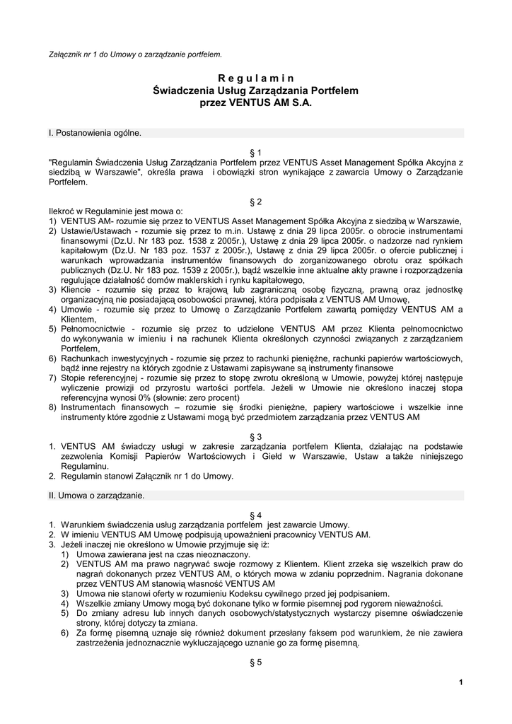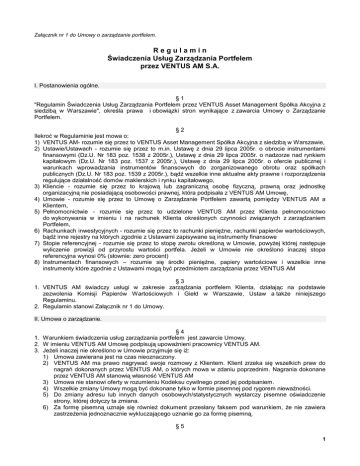 Załącznik nr 1 do Umowy o zarządzanie portfelem. Regulamin Świadczenia Usług Zarządzania Portfelem przez VENTUS AM S.A. I. Postanowienia ogólne. §1 "Regulamin Świadczenia Usług Zarządzania Portfelem przez VENTUS Asset Management Spółka Akcyjna z siedzibą w Warszawie", określa prawa i obowiązki stron wynikające z zawarcia Umowy o Zarządzanie Portfelem. §2 Ilekroć w Regulaminie jest mowa o: 1) VENTUS AM- rozumie się przez to VENTUS Asset Management Spółka Akcyjna z siedzibą w Warszawie, 2) Ustawie/Ustawach - rozumie się przez to m.in. Ustawę z dnia 29 lipca 2005r. o obrocie instrumentami finansowymi (Dz.U. Nr 183 poz. 1538 z 2005r.), Ustawę z dnia 29 lipca 2005r. o nadzorze nad rynkiem kapitałowym (Dz.U. Nr 183 poz. 1537 z 2005r.), Ustawę z dnia 29 lipca 2005r. o ofercie publicznej i warunkach wprowadzania instrumentów finansowych do zorganizowanego obrotu oraz spółkach publicznych (Dz.U. Nr 183 poz. 1539 z 2005r.), bądź wszelkie inne aktualne akty prawne i rozporządzenia regulujące działalność domów maklerskich i rynku kapitałowego, 3) Kliencie - rozumie się przez to krajową lub zagraniczną osobę fizyczną, prawną oraz jednostkę organizacyjną nie posiadającą osobowości prawnej, która podpisała z VENTUS AM Umowę, 4) Umowie - rozumie się przez to Umowę o Zarządzanie Portfelem zawartą pomiędzy VENTUS AM a Klientem, 5) Pełnomocnictwie - rozumie się przez to udzielone VENTUS AM przez Klienta pełnomocnictwo do wykonywania w imieniu i na rachunek Klienta określonych czynności związanych z zarządzaniem Portfelem, 6) Rachunkach inwestycyjnych - rozumie się przez to rachunki pieniężne, rachunki papierów wartościowych, bądź inne rejestry na których zgodnie z Ustawami zapisywane są instrumenty finansowe 7) Stopie referencyjnej - rozumie się przez to stopę zwrotu określoną w Umowie, powyżej której następuje wyliczenie prowizji od przyrostu wartości portfela. Jeżeli w Umowie nie określono inaczej stopa referencyjna wynosi 0% (słownie: zero procent) 8) Instrumentach finansowych – rozumie się środki pieniężne, papiery wartościowe i wszelkie inne instrumenty które zgodnie z Ustawami mogą być przedmiotem zarządzania przez VENTUS AM §3 1. VENTUS AM świadczy usługi w zakresie zarządzania portfelem Klienta, działając na podstawie zezwolenia Komisji Papierów Wartościowych i Giełd w Warszawie, Ustaw a także niniejszego Regulaminu. 2. Regulamin stanowi Załącznik nr 1 do Umowy. II. Umowa o zarządzanie. §4 1. Warunkiem świadczenia usług zarządzania portfelem jest zawarcie Umowy. 2. W imieniu VENTUS AM Umowę podpisują upoważnieni pracownicy VENTUS AM. 3. Jeżeli inaczej nie określono w Umowie przyjmuje się iż: 1) Umowa zawierana jest na czas nieoznaczony. 2) VENTUS AM ma prawo nagrywać swoje rozmowy z Klientem. Klient zrzeka się wszelkich praw do nagrań dokonanych przez VENTUS AM, o których mowa w zdaniu poprzednim. Nagrania dokonane przez VENTUS AM stanowią własność VENTUS AM 3) Umowa nie stanowi oferty w rozumieniu Kodeksu cywilnego przed jej podpisaniem. 4) Wszelkie zmiany Umowy mogą być dokonane tylko w formie pisemnej pod rygorem nieważności. 5) Do zmiany adresu lub innych danych osobowych/statystycznych wystarczy pisemne oświadczenie strony, której dotyczy ta zmiana. 6) Za formę pisemną uznaje się również dokument przesłany faksem pod warunkiem, że nie zawiera zastrzeżenia jednoznacznie wykluczającego uznanie go za formę pisemną. §5 1 Klient może posiadać jeden lub więcej rachunków inwestycyjnych objętych Umowami. §6 1. Przed podpisaniem Umowy Klient zapoznaje się z „Rodzajami Strategii Zarządzanych przez VENTUS AM” stanowiącymi Załącznik nr 1 do niniejszego Regulaminu. 2. Zawierając Umowę Klient określa, z zastrzeżeniem ust. 3, wybrany przez siebie rodzaj strategii według Załącznika nr 1 do Regulaminu pt. „Rodzaje Strategii zarządzanych przez VENTUS AM” 3. Klient może określić w Umowie dodatkowe warunki dotyczące strategii inwestycyjnej. 4. W przypadku wymagań Klienta niezgodnych z prawem, zasadami etyki zawodowej doradcy lub też niemożliwych albo szczególnie trudnych do zrealizowania, VENTUS AM ma prawo odmówić zawarcia Umowy. §7 1. Umowa może być rozwiązana przez każdą ze stron za pisemnym wypowiedzeniem. Termin wypowiedzenia Umowy wynosi 30 dni. 2. W przypadku naruszenia warunków Umowy bądź niniejszego Regulaminu, każda ze stron może rozwiązać Umowę bez zachowania terminu wypowiedzenia. 3. Możliwe jest też rozwiązanie Umowy bez zachowania terminu wypowiedzenia w trybie za porozumieniem stron. 4. W przypadku rozwiązania Umowy z przyczyn niezawinionych przez VENTUS AM, w trybie określonym w § 7 ust. 2 oraz § 15 ust. 3 podwyższa się należną opłatę za zarządzanie podwyższa się o 50%. 5. W przypadku utraty zezwolenia na zarządzanie Portfelem lub zezwolenia na prowadzenie działalności maklerskiej przez VENTUS AM dokonuje się wypowiedzenia wszystkich Umów w trybie przewidzianym w ust. 1. Warunki świadczenia usług w okresie trwania wypowiedzenia zależne będą od ewentualnych zaleceń Komisji Papierów Wartościowych i Giełd. 6. Wypowiedzenie umowy nie ma wpływu na ważność transakcji zawartych przed jej rozwiązaniem. III. Pełnomocnictwa. §8 1. Klient w momencie podpisania Umowy udziela VENTUS AM pisemnego Pełnomocnictwa, które stanowi załącznik nr 2 do Umowy. 2. Klient może udzielić pełnomocnictwa w zakresie szerszym od tego, o którym mowa w ust. 1, w tym do ustanawiania ograniczonych praw rzeczowych na papierach wartościowych i innych instrumentach finansowych, wchodzących w skład zarządzanego portfela. 3. Wszelkie rachunki inwestycyjne otwarte na podstawie Pełnomocnictwa uważa się za objęte Umową. §9 1. Pełnomocnictwo pozostaje w mocy w przypadku śmierci Klienta będącego osobą fizyczną, 2. W przypadku Klienta będącego osobą prawną Pełnomocnictwo wygasa z chw