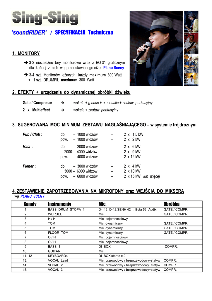 ‘soundRIDER’ / SPECYFIKACJA Techniczna 1. MONITORY 3-2 niezależne tory monitorowe wraz z EQ 31 graficznym dla każdej z nich wg przedstawionego niżej Planu Sceny 3-4 szt. Monitorów leżących, każdy maximum 300 Watt + 1 szt. DRUMFIL maximum 300 Watt 2. EFEKTY + urządzenia do dynamicznej obróbki dźwięku Gate / Compresor wokale + g.bass + g.acoustic + zestaw perkusyjny 2 x Multieffect wokale + zestaw perkusyjny 3. SUGEROWANA MOC MINIMUM ZESTAWU NAGŁAŚNIAJĄCEGO – w systemie trójdrożnym Pub / Club : do pow. – 1000 widzów – 1000 widzów – – 2 x 1,5 kW 2 x 2 kW Hala : do – 2000 widzów 2000 – 4000 widzów pow. – 4000 widzów – – – 2 x 6 kW 2 x 9 kW 2 x 12 kW Plener : do – 3000 widzów 3000 – 6000 widzów pow. – 6000 widzów – – – 2 x 4 kW 2 x 10 kW 2 x 15 kW lub więcej 4. ZESTAWIENIE ZAPOTRZEBOWANIA NA MIKROFONY oraz WEJŚCIA DO MIKSERA wg PLANU SCENY Kanały Instrumenty Mic. Obróbka 1. 2. 3. 4. 5. 6. 7. 8. 9. 10. 11.-12 13. 14. 15. BASS DRUM STOPA 1 WERBEL H/H TOM TOM FLOOR TOM O/H O/H BASS 1 GUITAR KEYBOARDs VOCAL Lead VOCAL 2 VOCAL 3 D-112, D-12,SENH 42 h, Beta 52, Audix Mic. Mic. pojemnościowy Mic. dynamiczny Mic. dynamiczny Mic. dynamiczny Mic. pojemnościowy Mic. pojemnościowy DI BOX Mic. DI BOX stereo x 2 Mic. przewodowy / bezprzewodowy+statyw Mic. przewodowy / bezprzewodowy+statyw Mic. przewodowy / bezprzewodowy+statyw GATE / COMPR. GATE / COMPR. GATE / COMPR. GATE / COMPR. GATE / COMPR. COMPR. COMPR. COMPR. COMPR. PLAN SCENY / STAGE PLAN 1 opcja MINIMUM / 2 tory monitorowe, tj.: 4 monitory leżące + Drumfil ( min. 200 Watt ) 2 opcja MAXIMUM / 3 tory monitorowe, tj.: 4 monitory leżące + Drumfil ( min. 200 Watt ) ML skrót oznaczenia / nazwy toru monitorowego , tj. MONITOR LINE Mic. / 1–8 Drumfil – ML Drumfil – ML Drums DI BOX x 2 11 - 12 Voc.2 KEYBOARDs Voc. 3 Mic. / 15 ML 3 odsłuch leżący BACK LINE g.Bass BACK LINE g.El. Mic. / 10 DI BOX 9 Mic. / 14 g.El. ML 2 odsłuch leżący g.Bass ML 1 ML 2 odsłuch leżący odsłuch leżący ML 2 odsłuch leżący ML 1 odsłuch leżący Lead Voc ML 2 odsłuch leżący Mic. / 13 ML 1 odsłuch leżący ML 1 odsłuch leżący ML 1 odsłuch leżący OŚWIETLENIE – efekty / STANDARD MINIMUM oświetlenie wielobarwne – zmieniające się w trakcie koncertu wraz ze zmianą brzmienia, charakteru, tempa wykonywanych utworów lub ich kontrastujących fragmentów. W trakcie wolnych utworów – prosimy o oświetlenie statyczne / nastrojowe ze światłami punktowymi skierowanymi na solistkę / -ów. W czasie trwania całego koncertu – prosimy bardzo o „oszczędne” i uzasadnione wykorzystywanie wytwornicy dymu w połączeniu z odpowiednimi efektami świateł – sugerując ich zastosowanie szczególnie w trakcie najbardziej dynamicznych utworów lub nastrojowych ballad. Z nadzieją sympatycznej współpracy – z góry DZIĘKUJEMY za wyrozumiałość dla w/w próśb ! KONTAKT : 666 506 999 ; 504 655 245 ; 607 219 140 0