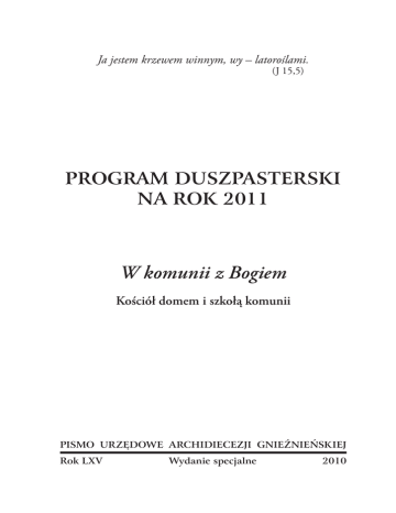 Ja jestem krzewem winnym, wy – latoroślami. (J 15,5) PROGRAM DUSZPASTERSKI NA ROK 2011 W komunii z Bogiem Kościół domem i szkołą komunii PISMO URZĘDOWE ARCHIDIECEZJI GNIEŹNIEŃSKIEJ Rok LXV Wydanie specjalne 2010 Redaktor: ks. Franciszek Jabłoński Program diecezjalny został przygotowany na podstawie informacji zawartych w ogólnopolskim programie duszpasterskim, W komunii z Bogiem. Kościół domem i szkołą komunii, Poznań 2010 Zdjęcia na okładce: 1. Mozaika z kaplicy Prymasowskiego Wyższego Seminarium Duchownego w Gnieźnie 2. Skan okładki ogólnopolskiego programu duszpasterskiego oraz proponowanych projektów duszpasterskich Wydawca: Wydział Duszpasterstw Specjalistycznych Kurii Metropolitalnej w Gnieźnie ul. J. Łaskiego 7, 62-200 Gniezno ISSN 0239-4510 Skład i druk: Prymasowskie Wydawnictwo Gaudentinum Sp. z o.o ul. Jana Łaskiego 7, 62-200 Gniezno www.gaudentinum.pl Spis treści Wprowadzenie...................................................................... 5 I. Listy pasterskie abp. Józefa Kowalczyka, Prymasa Polski, ............................................................. 9 1. Na rozpoczęcie Adwentu i nowego roku pracy duszpasterskiej w archidiecezji gnieźnieńskiej............................................................9 2. Z okazji ogłoszenia Roku Prymasa Stefana Wyszyńskiego w archidiecezji gnieźnieńskiej..........................................................14 II. Główne cele programu duszpasterskiego...................... 19 1. Cele programu duszpasterskiego na lata 2010-2013........................19 2. Cele programu duszpasterskiego na rok 2011.................................19 III. Realizowanie programu w Kościele i społeczeństwie.... 21 1. Kościół jako komunia.....................................................................21 2. Kapłani w komunii z wiernymi.......................................................21 3. Rodzina jako komunia....................................................................22 4. Człowiek w komunii z Bogiem.......................................................22 IV. Propozycje duszpasterskie ............................................ 23 1. Wskazania ogólne...........................................................................23 2. Rocznice w duszpasterskiej praktyce................................................24 3. Propozycje szczegółowe ..................................................................25 Zakończenie........................................................................ 31 Komunikat po posiedzeniu Archidiecezjalnej Rady Duszpasterskiej................................................................... 33 Terminarz 2011................................................................... 35 Wprowadzenie Tak jak w poprzednich latach, program diecezjalny 2010/2011 będzie stanowił adaptację programu ogólnopolskiego, szczególnie ważnej dla diecezji tematyki duszpasterskiej. Poszczególne kurialne wydziały i referaty podejmą realizację programu w ramach całorocznej pracy. I tak: referat rodzin swoją pracę realizować będzie pod hasłem: Komunia małżeńska w komunii z Bogiem, referat misyjny: Komunia kluczem do misji, referat młodzieżowy, zgodnie z hasłem XXVI Światowego Dnia Młodzieży: Zakorzenieni i zbudowani na Chrystusie, mocni w wierze (por. Kol 2,7). Wydział katechizacji i szkół katolickich podejmuje nieprzerwaną pracę formacyjną, która zawarta została w „Biuletynie Katechetycznym”. Z kolei w seminarium duchownym w roku akademickim 2010/11 towarzyszy hasło zaczerpnięte z Listu św. Pawła do Filipian (2,15) – Estote sicut luminaria in mundo („Jawicie się jako źródła światła w świecie”). Program skierowany jest do kapłanów zaangażowanych w duszpasterstwie, członków Parafialnych Rad Duszpasterskich i Ekonomicznych, katechetów oraz wiernych, którzy aktywnie włączają się w życie parafialne oraz partycypują w ruchach i grupach apostolskich (Akcja Katolicka, członkowie ruchów prorodzinnych, animatorzy misyjni, doradcy życia rodzinnego, członkowie Żywego Różańca, nadzwyczajni szafarze Komunii Świętej, animatorzy grup młodzieżowych, członkowie Odnowy w Duchu Świętym, Ruchu Światło Życie, itp.). Kluczem do właściwego ujęcia i zrozumienia programu jest łacińskie słowo communio, wywodzące się z greckiego słowa koinónia. Pojęcia communio czy koinonia są mocno zakorzenione w Piśmie świętym i mają wymiar religijny, a mówiąc ściślej ewangeliczny. Łaciński termin communio pochodzi od słów cum („razem z”) i manus („powinność”, „zadanie”) i oznacza „współuczestniczenie w powinności”. Grecki termin koinónia, pochodzący od przymiotnika koinós („wspólny”), wyraża ideę uczestnictwa, udziału, partycypacji. Koinónia i terminy pokrewne oznaczają rzeczywistość, która może być inaczej nazywana lub przedstawiana za pomocą innych obrazów. Są to takie zwroty, Program duszpasterski na rok 2011 jak: „być razem z Nim”, „podążać za”, „naśladować”, „upodobnić się do”, „gromadzić się”. Wszystkie istotne elementy chrześcijańskiego pojęcia communio zawiera sformułowanie z Pierwszego Listu św. Jana Apostoła, które można uznać za kryterium trafności chrześcijańskiego rozumienia communio: „oznajmiamy wam, cośmy ujrzeli i usłyszeli, abyście i wy mieli współuczestnictwo z nami. A mieć z nami współuczestnictwo znaczy: mieć je z Ojcem i z Jego Synem Jezusem Chrystusem” (1 J 1,3) (por. kard. J. Ratzinger, Watykan, 27 lutego 2000 r.). Chcąc uniknąć rozumienia kościelnej wspólnoty wyłącznie w wymiarze horyzontalnym, konsekwentnie zaczęto stosować łacińskie słowo communio na określenie szczególnego rodzaju wspólnoty, inne od czysto ziemskiego jej pojmowania. Odtąd owo łacińskie określenie jest stosowane we wszystkich dokumentach kościelnego nauczania. Słowo communio oznacza w pierwszym 