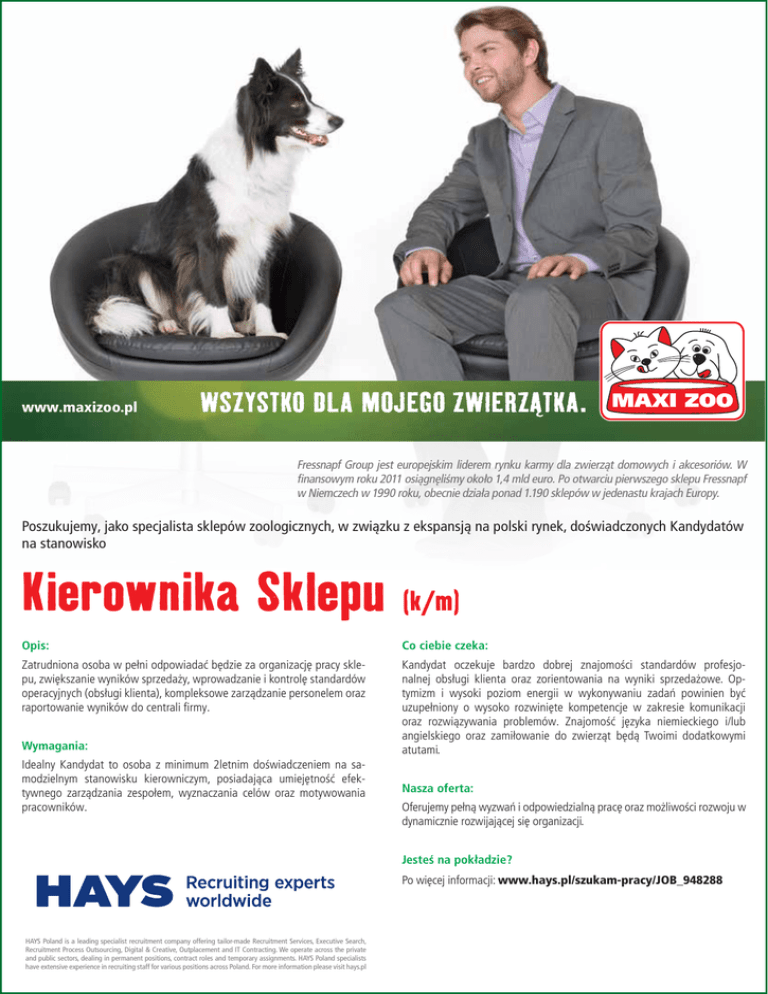 www.maxizoo.pl WSZYSTKO DLA MOJEGO ZWIERZĄTKA. Fressnapf Group jest europejskim liderem rynku karmy dla zwierząt domowych i akcesoriów. W finansowym roku 2011 osiągnęliśmy około 1,4 mld euro. Po otwarciu pierwszego sklepu Fressnapf w Niemczech w 1990 roku, obecnie działa ponad 1.190 sklepów w jedenastu krajach Europy. Poszukujemy, jako specjalista sklepów zoologicznych, w związku z ekspansją na polski rynek, doświadczonych Kandydatów na stanowisko Kierownika Sklepu (k/m) Opis: Co ciebie czeka: Zatrudniona osoba w pełni odpowiadać będzie za organizację pracy sklepu, zwiększanie wyników sprzedaży, wprowadzanie i kontrolę standardów operacyjnych (obsługi klienta), kompleksowe zarządzanie personelem oraz raportowanie wyników do centrali firmy. Kandydat oczekuje bardzo dobrej znajomości standardów profesjonalnej obsługi klienta oraz zorientowania na wyniki sprzedażowe. Optymizm i wysoki poziom energii w wykonywaniu zadań powinien być uzupełniony o wysoko rozwinięte kompetencje w zakresie komunikacji oraz rozwiązywania problemów. Znajomość języka niemieckiego i/lub angielskiego oraz zamiłowanie do zwierząt będą Twoimi dodatkowymi atutami. Wymagania: Idealny Kandydat to osoba z minimum 2letnim doświadczeniem na samodzielnym stanowisku kierowniczym, posiadająca umiejętność efektywnego zarządzania zespołem, wyznaczania celów oraz motywowania pracowników. Nasza oferta: Oferujemy pełną wyzwań i odpowiedzialną pracę oraz możliwości rozwoju w dynamicznie rozwijającej się organizacji. Jesteś na pokładzie? Po więcej informacji: www.hays.pl/szukam-pracy/JOB_948288 HAYS Poland is a leading specialist recruitment company offering tailor-made Recruitment Services, Executive Search, Recruitment Process Outsourcing, Digital & Creative, Outplacement and IT Contracting. We operate across the private and public sectors, dealing in permanent positions, contract roles and temporary assignments. HAYS Poland specialists have extensive experience in recruiting staff for various positions across Poland. For more information please visit hays.pl