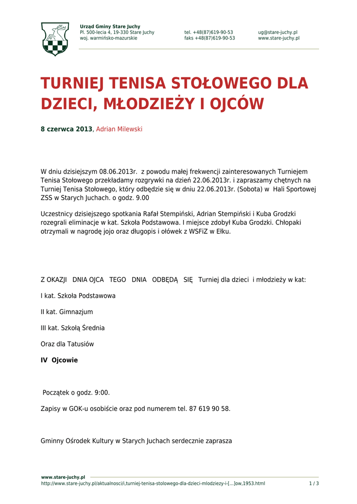 Urząd Gminy Stare Juchy Pl. 500-lecia 4, 19-330 Stare Juchy woj. warmińsko-mazurskie tel. +48(87)619-90-53 faks +48(87)619-90-53 [email protected] www.stare-juchy.pl TURNIEJ TENISA STOŁOWEGO DLA DZIECI, MŁODZIEŻY I OJCÓW 8 czerwca 2013, Adrian Milewski W dniu dzisiejszym 08.06.2013r. z powodu małej frekwencji zainteresowanych Turniejem Tenisa Stołowego przekładamy rozgrywki na dzień 22.06.2013r. i zapraszamy chętnych na Turniej Tenisa Stołowego, który odbędzie się w dniu 22.06.2013r. (Sobota) w Hali Sportowej ZSS w Starych Juchach. o godz. 9.00 Uczestnicy dzisiejszego spotkania Rafał Stempiński, Adrian Stempiński i Kuba Grodzki rozegrali eliminacje w kat. Szkoła Podstawowa. I miejsce zdobył Kuba Grodzki. Chłopaki otrzymali w nagrodę jojo oraz długopis i ołówek z WSFiZ w Ełku. Z OKAZJI DNIA OJCA TEGO DNIA ODBĘDĄ SIĘ Turniej dla dzieci i młodzieży w kat: I kat. Szkoła Podstawowa II kat. Gimnazjum III kat. Szkołą Średnia Oraz dla Tatusiów IV Ojcowie Początek o godz. 9:00. Zapisy w GOK-u osobiście oraz pod numerem tel. 87 619 90 58. Gminny Ośrodek Kultury w Starych Juchach serdecznie zaprasza www.stare-juchy.pl http://www.stare-juchy.pl/aktualnosci/i,turniej-tenisa-stolowego-dla-dzieci-mlodziezy-i-[...]ow,1953.html 1/3 Urząd Gminy Stare Juchy Pl. 500-lecia 4, 19-330 Stare Juchy woj. warmińsko-mazurskie tel. +48(87)619-90-53 faks +48(87)619-90-53 [email protected] www.stare-juchy.pl REGULAMIN TURNIEJU TENISA STOŁOWEGO 1.CEL: - popularyzacja tenisa stołowego wśród dzieci i młodzieży - zagospodarowanie czasu wolnego 2. ORGANIZATOR: - Gminny Ośrodek Kultury w Starych Juchach 3. MIEJSCE: - Hala sportowo – widowiskowa ul. Mazurska 11, 19-330 Stare Juchy 4. TERMIN I KATEGORIE WG HARMONOGRAMU ROZGRYWEK - Termin: 22.06.2013r. - Kategorie dla Szkół: Podstawowych, Gimnazjalnych, Średnich ora Ojcowie 5. SPOSÓB PRZEPROWADZENIA ZAWODÓW Zawody zostaną rozegrane zgodnie z przepisami PZTS – system: - do trzech wygranych do 11 punktów - po 2 serwy na przemian 6. WARUNKI UCZESTNICTWA - prawo startu mają uczniowie szkół podstawowych, gimnazjum i szkół średnich oraz ojcowie - dozwolony sprzęt własny 7. NAGRODY: - puchary, Dyplomy 8. UWAGI: - sprawy nie ujęte w regulaminie rozstrzyga sędzia zawodów - za rzeczy zgubione organizator nie ponosi odpowiedzialności www.stare-juchy.pl http://www.stare-juchy.pl/aktualnosci/i,turniej-tenisa-stolowego-dla-dzieci-mlodziezy-i-[...]ow,1953.html 2/3 Urząd Gminy Stare Juchy Pl. 500-lecia 4, 19-330 Stare Juchy woj. warmińsko-mazurskie tel. +48(87)619-90-53 faks +48(87)619-90-53 [email protected] www.stare-juchy.pl www.stare-juchy.pl http://www.stare-juchy.pl/aktualnosci/i,turniej-tenisa-stolowego-dla-dzieci-mlodziezy-i-[...]ow,1953.html 3/3