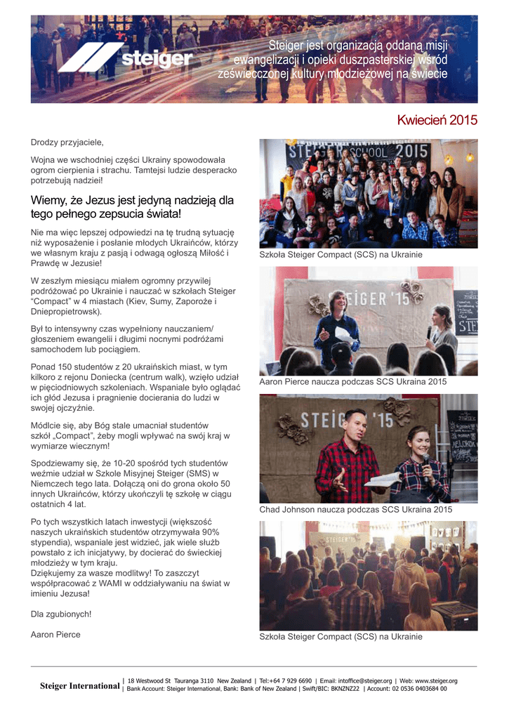 Steiger jest organizacją oddaną misji ewangelizacji i opieki duszpasterskiej wśród zeświecczonej kultury młodzieżowej na świecie Kwiecień 2015 Drodzy przyjaciele, Wojna we wschodniej części Ukrainy spowodowała ogrom cierpienia i strachu. Tamtejsi ludzie desperacko potrzebują nadziei! Wiemy, że Jezus jest jedyną nadzieją dla tego pełnego zepsucia świata! Nie ma więc lepszej odpowiedzi na tę trudną sytuację niż wyposażenie i posłanie młodych Ukraińców, którzy we własnym kraju z pasją i odwagą ogłoszą Miłość i Prawdę w Jezusie! Szkoła Steiger Compact (SCS) na Ukrainie W zeszłym miesiącu miałem ogromny przywilej podróżować po Ukrainie i nauczać w szkołach Steiger “Compact” w 4 miastach (Kiev, Sumy, Zaporoże i Dniepropietrowsk). Był to intensywny czas wypełniony nauczaniem/ głoszeniem ewangelii i długimi nocnymi podróżami samochodem lub pociągiem. Ponad 150 studentów z 20 ukraińskich miast, w tym kilkoro z rejonu Doniecka (centrum walk), wzięło udział w pięciodniowych szkoleniach. Wspaniale było oglądać ich głód Jezusa i pragnienie docierania do ludzi w swojej ojczyźnie. Aaron Pierce naucza podczas SCS Ukraina 2015 Módlcie się, aby Bóg stale umacniał studentów szkół „Compact”, żeby mogli wpływać na swój kraj w wymiarze wiecznym! Spodziewamy się, że 10-20 spośród tych studentów weźmie udział w Szkole Misyjnej Steiger (SMS) w Niemczech tego lata. Dołączą oni do grona około 50 innych Ukraińców, którzy ukończyli tę szkołę w ciągu ostatnich 4 lat. Chad Johnson naucza podczas SCS Ukraina 2015 Po tych wszystkich latach inwestycji (większość naszych ukraińskich studentów otrzymywała 90% stypendia), wspaniale jest widzieć, jak wiele służb powstało z ich inicjatywy, by docierać do świeckiej młodzieży w tym kraju. Dziękujemy za wasze modlitwy! To zaszczyt współpracować z WAMI w oddziaływaniu na świat w imieniu Jezusa! Dla zgubionych! Aaron Pierce Szkoła Steiger Compact (SCS) na Ukrainie | 18 Westwood St Tauranga 3110 New Zealand | Tel:+64 7 929 6690 | Email: [email protected] | Web: www.steiger.org Steiger International | Bank Account: Steiger International, Bank: Bank of New Zealand | Swift/BIC: BKNZNZ22 | Account: 02 0536 0403684 00 Wesprzyj trasę finansowo! Nasza działalność opiera się na dobrowolnych darowiznach od ludzi, którzy wierzą w to, co robi No Longer Music. Datek dowolnej wysokości można przekazać online na www.steiger.org/donate (z dopiskiem “NLM Tour”) lub w inny sposób. Aby dowiedzieć się więcej o finansowaniu koncertów, wejdź na www.steiger.org/nlmtour Dołącz do 24-godzinnego Łańcucha Modlitewnego No Longer Music Świat stoi w płomieniach. Od ciągnącej się wojny na Ukrainie, przez okropną przemoc na Bliskim Wschodzie, aż po zepsucie w naszym własnym kraju, wszystko to może wydawać się beznadziejne! Ale jest nadzieja! Ewangelia ma moc zmienić świat. Jak mają uwierzyć w tego, o którym nie słyszeli? A jak usłyszeć, jeśli nie ma tego, który zwiastuje? Pójdziemy! Czy poślesz nas? W tym roku nasze zespoły No Longer Music będą głosiły Ewangelię przed większą publicznością i w większej ilości krajów niż kiedykolwiek wcześniej! Wśród nich będą niektóre z najrzadziej ewangelizowanych krajów Islamskich, takich jak Turcja czy Liban, bardzo świeckie kraje zachodniej Europy, takie jak Hiszpania i Portugalia, a także kraje Europy Wschodniej, jak Rosja czy Ukraina. Aby dowiedzieć się więcej, wejdź na www.steiger.org/ nlmtour. Aby zobowiązać się do modlitwy za NLM przez 1 godzinę tygodniowo na cały okres trwania trasy koncertowej, wejdź na: www.steiger.org/nlmprayer Będziesz regularnie otrzymywać bieżące prośby modlitewne. W zeszłym roku NLM głosiło Ewangelię niedaleko rejonu konfliktu we wschodniej Ukrainie, w Albanii podczas Ramadanu, na ulicach Turcji i w wielu innych miejscach. Kliknij w poniższe linki, by zobaczyć krótkie filmy obrazujące naszą służbę: Ukraina - http://vimeo.com/steigerint/ukraine Albania - http://vimeo.com/steigerint/albania Turcja - https://vimeo.com/steigerint/turkey Jednak nie możemy zrobić tego wszystkiego sami! Potrzebujemy radykalnych wojowników modlitwy oraz hojnych dawców, którzy będą z nami współpracować w szerzeniu Nadziei Jezusa wśród tych, którym jej brak. CHCESZ NAS WESPRZEC? Skontaktuj sie z nami jesli chcialbys: • byc partnerem finansowym Steiger, zarowno przez regularne wsparcie jak i jednorazowy datek, oraz • otrzymac wiecej informacji o nas Przez e-mail: [email protected] lub poprzez nasza strone: www.steiger.org www.steiger.org All gifts made to Steiger International, Ltd. are under the control of its Board of Directors to be used for its exempt purposes. In the unlikely event a project or program is over-funded or is not able to be carried out, the board will redirect the funds for a similar purpose. Gifts may be preferenced to support the ministry of specific Steiger missionaries and/or their specific ministry efforts but these are not gifts to or for the individual but to Steiger for its exempt ministries. While the Steiger board endeavours to use funds preferenced for the ministry of specific Steiger missionaries and/or their specific ministry efforts in accordance with the donor’s preferences, at times the board may redirect the use of these gifts. No gifts are received by Steiger in exchange for goods or services.
