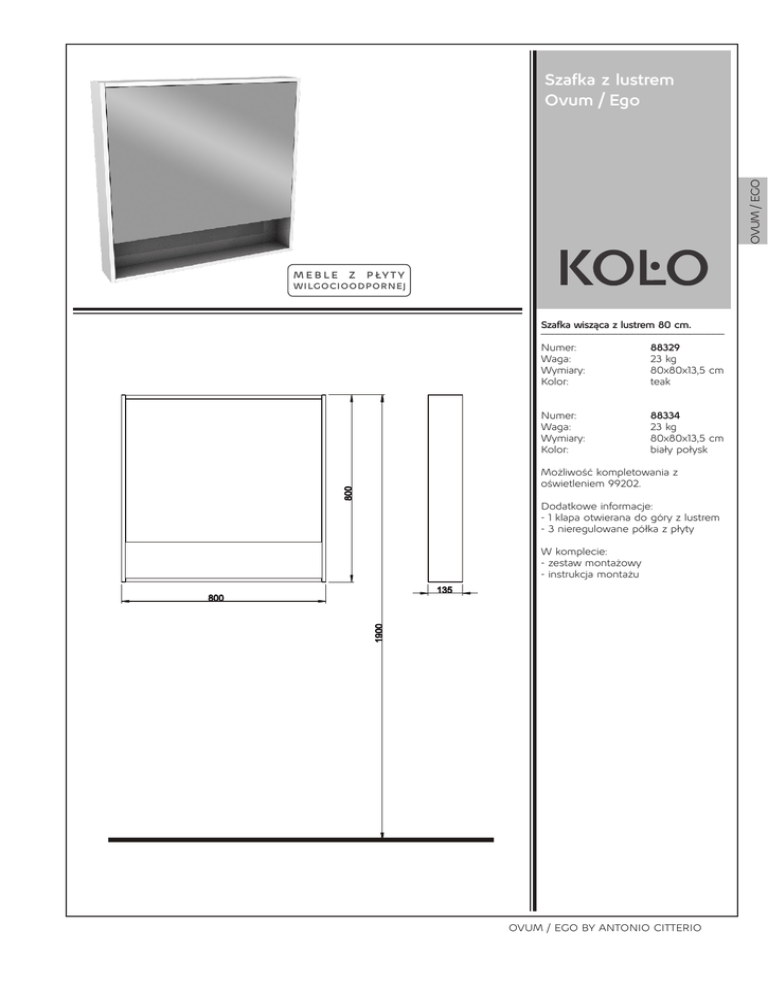 OVUM / EGO Szafka z lustrem Ovum / Ego MEBLE Z P ŁY T Y WILGOCIOODPORNEJ Szafka wisząca z lustrem 80 cm. ________________________________ Numer: Waga: Wymiary: Kolor: 88329 23 kg 80x80x13,5 cm teak Numer: Waga: Wymiary: Kolor: 88334 23 kg 80x80x13,5 cm biały połysk 800 Możliwość kompletowania z oświetleniem 99202. Dodatkowe informacje: - 1 klapa otwierana do góry z lustrem - 3 nieregulowane półka z płyty W komplecie: - zestaw montażowy - instrukcja montażu 135 1900 800 OVUM / EGO BY ANTONIO CITTERIO