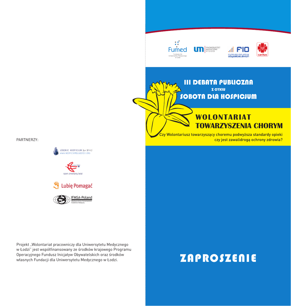 III DEBATA PUBLICZNA WOLONTARIAT TOWARZYSZENIA CHORYM Czy Wolontariusz towarzysz¹cy choremu podwy¿sza standardy opieki czy jest zawalidrog¹ ochrony zdrowia? PARTNERZY: IFMSA-Poland Miêdzynarodowe Stowarzyszenie Studentów Medycyny Projekt „Wolontariat pracowniczy dla Uniwersytetu Medycznego w £odzi” jest wspó³finansowany ze œrodków krajowego Programu Operacyjnego Fundusz Inicjatyw Obywatelskich oraz œrodków w³asnych Fundacji dla Uniwersytetu Medycznego w £odzi. ZAPROSZENIE Program: 10.00 - 10.30 - REJESTRACJA 10.30 - 11.00 - PRZYWITANIE GOŒCI w programie 11.00 - 11.15 - prof. dr hab. n. med. Krystyna de Walden Ga³uszko - Prezes Polskiego Towarzystwa Psychoonkologicznego » wyk³ad wprowadzaj¹cy 11.15 - 11.25 - dr n. hum. Barbara Olszewska - Wy¿sza Szko³a Pedagogiczna w £odzi » Wolontariat uczy sztuki pomagania innym i poznania siebie 11.25 - 11.35 - ks. dr Leszek Woroniecki - Prze³o¿ony Regionalny Regii Mi³osierdzia Bo¿ego SAC we Francji » Ruch hospicyjny w Europie - miejsce dla wolontariuszy w opiece domowej i stacjonarnej 11.35 - 11.45 - ks. dr Piotr Krakowiak - Uniwersytet Miko³aja Kopernika (UMK) w Toruniu; Papieski Uniwersytet Jana Paw³a II (UPJP2) w Krakowie » Wolontariat jako metoda zapobiegania wykluczeniu spo³ecznemu osób u kresu ¿ycia 11.45 - 11.55 - Marta Grabek-Niekraszewicz - Zakon Bonifratrów » Wolontariat w zespo³owej opiece duszpasterskiej 11.55 - 12.05 - prof. Józef Binnebesel - Wy¿sza Szko³a Edukacji Zdrowotnej i Nauk Spo³ecznych w £odzi » Wieloaspektowoœæ doœwiadczania ¿a³oby 12.05 - 12.15 - Krystyna Cywiñska-Serafin - Wolontariuszka Hospicjum im. ks. E. Dutkiewicza w Gdañsku » Œwiadectwo pracy wolontaryjnej 12.15 - 12.25 - dr Zbigniew Bohdan - Klinika Pediatrii, Gastroenterologii i Onkologii Akademii Medycznej w Gdañsku; Hospicjum im. ks. E. Dutkiewicza w Gdañsku » Wolontariat dla naszych dzieci 12.25 - 12.35 - Anna Seweryn - Wolontariuszka - £ódzkie Hospicjum dla Dzieci i Doros³ych » Œwiadectwo praktyki wolontaryjnej 12.35 - 12.45 - Anna Janowicz - Prezes Fundacji Lubiê Pomagaæ, Gdañsk » Rola koordynacji w zespo³owej opiece u kresu ¿ycia 12.45 - 13.15 - PRZERWA NA KAWÊ, LUNCH 13.15 - 13.25 - Przedstawiciel Fundacji Razem zmieniamy œwiat » za³o¿enia projektu Damy radê 13.25 - 14.30 - DYSKUSJA Uniwersytet Medyczny w £odzi oraz Caritas Archidiecezji £ódzkiej - Zespo³y Domowej Opieki Hospicyjnej maj¹ zaszczyt zaprosiæ na III DEBATÊ PUBLICZN¥ Z CYKLU SOBOTA DLA HOSPICJUM nt. „Wolontariat towarzyszenia chorym. Czy Wolontariusz towarzysz¹cy choremu podwy¿sza standardy opieki czy jest zawalidrog¹ ochrony zdrowia?”. Pod patronatem: J. M. Rektora Uniwersytetu Medycznego w £odzi - prof. dr. hab. n. med. Paw³a Górskiego, Dyrektora Caritas Archidiecezji £ódzkiej - ks. mgr. Jacka Ambroszczyka Debata odbêdzie siê 23 marca 2013 roku w Centrum Dydaktycznym UM w £odzi (sala1.27), przy ul. Pomorskiej 251