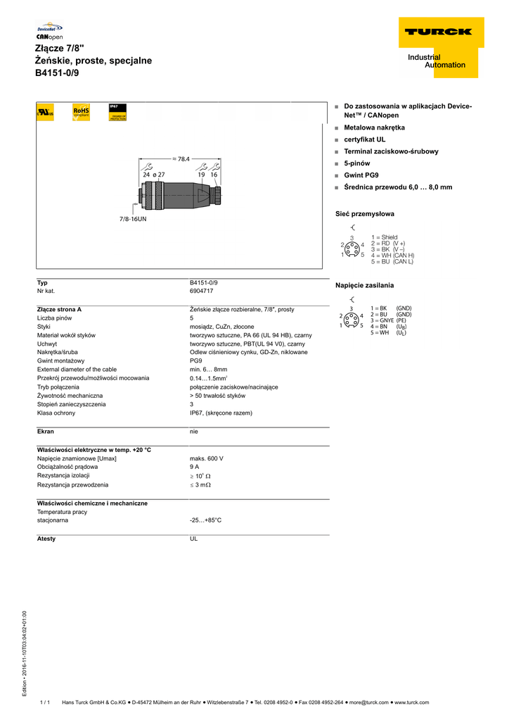 Złącze 7/8'' Żeńskie, proste, specjalne B4151-0/9 ■ Do zastosowania w aplikacjach DeviceNet™ / CANopen ■ Metalowa nakrętka ■ certyfikat UL ■ Terminal zaciskowo-śrubowy ■ 5-pinów ■ Gwint PG9 ■ Średnica przewodu 6,0 … 8,0 mm Sieć przemysłowa Typ Nr kat. B4151-0/9 6904717 Złącze strona A Liczba pinów Styki Materiał wokół styków Uchwyt Nakrętka/śruba Gwint montażowy External diameter of the cable Przekrój przewodu/możliwości mocowania Żeńskie złącze rozbieralne, 7/8″, prosty 5 mosiądz, CuZn, złocone tworzywo sztuczne, PA 66 (UL 94 HB), czarny tworzywo sztuczne, PBT(UL 94 V0), czarny Odlew ciśnieniowy cynku, GD-Zn, niklowane PG9 min. 6… 8mm Napięcie zasilania Tryb połączenia Żywotność mechaniczna Stopień zanieczyszczenia Klasa ochrony 0.14…1.5mm połączenie zaciskowe/nacinające > 50 trwałość styków 3 IP67, (skręcone razem) Ekran nie Właściwości elektryczne w temp. +20 °C Napięcie znamionowe [Umax] Obciążalność prądowa Rezystancja izolacji maks. 600 V 9A 2 Rezystancja przewodzenia ï 10 ò ð 3 mò Właściwości chemiczne i mechaniczne Temperatura pracy stacjonarna -25…+85°C Atesty UL Edition • 2016-11-10T03:04:02+01:00 8 1/1 Hans Turck GmbH & Co.KG ñ D-45472 Mülheim an der Ruhr ñ Witzlebenstraße 7 ñ Tel. 0208 4952-0 ñ Fax 0208 4952-264 ñ [email protected] ñ www.turck.com
