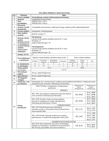 Lp. 1 2 3 4 5 6 7 Element Nazwa modułu Instytut Kod przedmiotu Kierunek, poziom i profil kształcenia Forma studiów Rok studiów, semestr Rodzaj i liczba godzin dydaktycznych wymagających bezpośredniego udziału nauczyciela i studentów Punkty ECTS Pracochłonność w godzinach 8 9 10 11 12 st. stacjonarne st. niestacjon. Suma godzin stac/niestac Prowadzący zajęcia Egzaminator/ Wymagania wstępne Założenia i cele przedmiotu SYLABUS MODUŁU KSZTAŁCENIA Opis Geograficzne systemy informacji przestrzennej Gospodarki Przestrzennej PPWSZ-GP-1-543-s PPWSZ-GP-1-542-n Gospodarka przestrzenna, studia pierwszego stopnia, profil ogólnoakademicki stacjonarne i niestacjonarne Rok III, semestr V Stacjonarne: Łączna liczba godzin dydaktycznych:45, w tym: Wykłady 15 Zajęcia laboratoryjne: 30 Niestacjonarne Łączna liczba godzin dydaktycznych:30, w tym: Wykłady 10 Zajęcia laboratoryjne: 20 4 Zajęcia z bezpośrednim udziałem nauczyciela 15 Ćwiczenia/ seminaria 30 10 20 Wykłady Konsultacje obowiązkowe 5 - Praca własna studenta 2 Projekty/ opracowania 30 Nauka własna 30 2 30 50 60/80 Egzaminy 52/32 Efekty kształcenia - 112/112 Dr inż. Jakub Wojkowski Dr inż. Jakub Wojkowski Brak Zapoznanie się z teoretycznymi i praktycznymi podstawami budowy i funkcjonowania geograficznych systemów informacji przestrzennej. Odniesienie do Odniesienie do Efekt (Wiedza, Umiejętności, Kompetencje efektów efektów społeczne) kierunkowych obszarowych WIEDZA SIG_W01 Zna podstawy funkcjonowania baz danych oraz systemów informacji przestrzennej 13 Inne SIG_W02 Posiada wiedzę na temat podstaw prawnych regulujących zasady udostępniania informacji przestrzennej w Polsce UMIEJĘTNOŚCI SIG_U01 Potrafi przetwarzać informacje przechowywane w relacyjnych bazach danych przy użyciu języka SQL SIG_U02 Potrafi wykonać podstawowe analizy przestrzenne w środowisku programów klasy GIS GP_W05 GP_W05 S1A_W06 P1A_W06 P1A_W07 S1A_W06 P1A_W06 P1A_W07 GP_U12 InzA_U03 T1A_U10 GP_U02 T1A_U09 InzA_U02 T1A_U08 InzA_U01 KOMPETENCJE SPOŁECZNE SIG_K01 Ma świadomość znaczenia swobodnego dostępu do informacji o charakterze przestrzennych GP_K10 dla rozwoju gospodarki oraz procesu budowy InzA_K01 T1A_K02 społeczeństwa informacyjnego SIG_K02 Potrafi współpracować w grupie przy tworzeniu opracowania o charakterze projektowym Efekt kształcenia 14 Forma i warunki potwierdzenia efektu kształcenia Znajomość podstaw funkcjonowania baz danych oraz systemów informacji przestrzennej Wiedza na temat podstaw prawnych regulujących zasady udostępniania informacji przestrzennej w Polsce Umiejętność przetwarzania informacji przechowywane w relacyjnych bazach danych przy użyciu języka SQL Umiejętność wykonania podstawowych analiz przestrzennych w środowisku programów klasy GIS GP_K02 P1A_K04 S1A_K04 S1A_K02 P1A_K02 T1A_K03 Sposób potwierdzenia (weryfikacji) Egzamin pisemny Egzamin pisemny Weryfikacja w postaci pozytywnej oceny efektów pracy na ćwiczeniach projektowych Weryfikacja w postaci pozytywnej oceny efektów pracy na ćwiczeniach projektowych Stosowane metody dydaktyczne Wykład informacyjny, wykład problemowy, ćwiczenia, dyskusja 16 Treści merytoryczne przedmiotu Wykłady Elementy teorii geograficznych systemów informacji przestrzennej (Geographical Information System) Relacyjne bazy danych Wektorowy i rastrowy model danych Zasady wiązania obiektów przestrzennych z danymi opisowymi Język SQL jako narzędzie przetwarzania informacji w relacyjnych bazach danych Uwarunkowania prawne związane z procesem udostępniania informacji przestrzennej w Polsce: Dyrektywa Inspire oraz Ustawa o infrastrukturze informacji przestrzennej Metody pozyskiwania i przetwarzania informacji z baz danych ewidencji gruntów i budynków, zdjęć lotniczych, satelitarnych oraz innych źródeł Ćwiczenia: Tworzenie podstawowych struktur bazodanowych Przetwarzanie informacji przechowywanych w relacyjnych bazach danych przy użyciu języka SQL Wykonywanie podstawowych analiz przestrzennych w środowisku oprogramowania typu GIS 17 Forma i warunki zaliczenia modułu, w tym zasady dopuszczenia do egzaminu 15 Egzamin pisemny Warunek dopuszczenia do egzaminu - pozytywny efekt (ocena) efektów pracy na ćwiczeniach o charakterze projektowym 18 Wykaz literatury podstawowej 19 Wykaz Bazy danych SQL, Teoria i praktyka. autor: Wiesław Dudek Wydawnictwo Helion Podstawowy kurs systemów baz danych. Jeffrey D. Ullman, Jennifer Widom. Wydawnictwo Helion J. Gaździcki; Systemy informacji przestrzennej, Państwowe Przedsiębiorstwo Wydawnictw kartograficznych, Warszawa 1990. Systemy Informacji Geograficznej. Zarządzanie danymi przestrzennymi w GIS, SIP, SIT, LIS” Leszek Litwin, Grzegorz Myrda Celko J.: SQL Zaawansowane techniki programowania. Mikom, Warszawa, literatury uzupełniającej (pomocniczej) 1999. Date, C.J. and H. Darwen: A Guide to SQL Standard. Addison-Wesley, 1994. Gruber M.: SQL. Wydawnictwo HELION Harrington, J.L.: SQL dla każdego. EDU-MIKOM, Warszawa Stephens, R.K. et al.: SQL w 3 tygodnie. LT&P, Warszawa, 1999. Milena Nowotarska. Wprowadzenia do Quantum GIS Bielecka E., 2006, Systemy Informacji Geograficznej. Teoria i zastosowania, Wyd. PJWSTK, Warszawa. Kwiecień J., 2004, Systemy Informacji Geograficznej. Podstawy, Wyd. Akademii Techn.-Rolniczej, Bydgoszcz. Litwin L., Myrda G., 2005, Systemy Informacji Geograficznej - Zarządzanie danymi przestrzennymi w GIS. Wyd. „Helion”. Urbański J., 1997. Zrozumieć GIS, Analiza informacji przestrzennej. Wyd. Naukowe PWN, Warszawa.