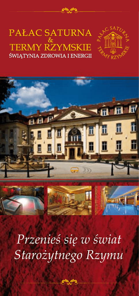 Pałac Saturna & Termy Rzymskie Świątynia zdrowia i energii Przenieś się w świat Przenieś świat Starożytnego Rzymu Starożytnego Rzymu spis treści TERMY RZYMSKIE Sauny Baseny Noce saunowe Seanse i rytuały saunowe Plan Term Rzymskich Cennik Strefa VIP ......................... 5 ........................................... 6 ......................................... 11 ......................................... 12 ......................................... 13 ......................................... 14 ......................................... 16 ......................................... 18 Centrum WellneSs & SPA Masaże Dotyk Orientu Ceremonie Hammam Kąpiele Okłady i zabiegi na ciało Zabiegi na twarz Pakiety Bony upominkowe Sklep Internetowy ....................... 20 ......................................... 21 ......................................... 24 ......................................... 26 ......................................... 29 ......................................... 30 ......................................... 32 ......................................... 35 ......................................... 37 ......................................... 37 Restauracja Pompeja ......................................... 37 Pałac Saturna Apartamenty Centrum Konferencyjne Sale Konferencyjne Biura Wirtualne Klub Fitness Łaźnie piwne BBB® Zapraszamy Państwa serdecznie do odwiedzenia niezwykle pięknego, jedynego w swoim rodzaju miejsca. Dołożyliśmy wszelkich starań, aby odrestaurowany budynek o ponad 100letniej historii, fascynował niepowtarzalną atmosferą oraz urzekał pięknem architektury. ....................... 38 ......................................... 38 ......................................... 45 ......................................... 46 ......................................... 48 ....................... 49 ....................... 50 Dziś Pałac Saturna łączy w sobie funkcje nowoczesnego Centrum Konferencyjnego, komfortowych Apartamentów, Biur Wirtualnych oraz unikalnego w Europie miejsca, jakim są Termy Rzymskie – Świątynia Zdrowia i Energii. Termy Rzymskie TERMY RZYMSKIE ŚWIĄTYNIA ZDROWIA I ENERGII To jedyne w swoim rodzaju miejsce, odbudowane w oparciu o starożytne ryciny Term z Pompei, w którym mogą Państwo skorzystać z dobroczynnego działania niezliczonej ilości saun, łaźni i basenów. Pobyt w Termach to samo zdrowie. Goście wychodząc czują się odprężeni i zrelaksowani. Warto podkreślić zdrowotny wpływ sauny, który poprawia nie tylko wygląd skóry, ale przede wszystkim wzmacnia cały nasz organizm. Podczas pobytu w saunie ciało zostaje poddane korzystnemu działaniu od układu odpornościowego po układ krwionośny. Pobyt w łaźniach (tężnia termalna, łaźnia ziołowa) wpływa oczyszczająco i udrażniająco na drogi oddechowe. Działanie koloroterapii, muzykoterapii i aromaterapii wzmaga zbawienny wpływ saun na organizm. Termy Rzymskie Świątynia Saturna 100°C Świątynia Wenus 70°C (seanse parowe) To sauna solno-kamienna o temperaturze 70°C i wilgotności 25%. Już w czasach starożytnych sól była uważana za naturalny specyfik o właściwościach zdrowotnych. Przebywając w saunie solnej chłoniemy minerały znajdujące się w soli, takie jak: jod, wapń, czy magnez. Minerały te odgrywają istotną rolę w profilaktyce zapalenia gardła, krtani, oskrzeli i płuc, a także różnych rodzajów alergii. Sauna ta jest w stanie pomieścić 34 osoby. Najpiękniejsza i prawdopodobnie największa sauna zewnętrzna w Europie, która jest w stanie pomieścić jednocześnie ponad 100 osób. Wspaniały relaks w Świątyni zapewnia kominek, znajdujący się w samym sercu sauny. W saunie tej odbywają się seanse i rytuały saunowe. To sauna sucha o wilgotności 10-15% i temperaturze 100°C. Zalecany czas przebywania 7-15 min. Sauna Cezara 95°C (seanse parowe) W tej saunie temperatura osiąga 95°C, a wilgotność wynosi 10-15%, zalecany czas przebywania w tej saunie to 7-15 minut. Dodatkowo, para wytworzona przez oblewanie gorących kamieni wodą z olejkami eterycznymi korzystnie jonizuje powietrze. Sauna Cezara jest w stanie pomieścić jednocześnie 45 osób. Sauna Kleopatry 75°C (koloroterapia) To sauna sucha o wilgotności 15-20%, oraz temperaturze 75°C, w której zalecany czas przebywania jest wydłużony ze względu na nieco niższą temperaturę i wynosi 10-20 minut. W tym miejscu z częstotliwością co 7 minut gorące kamienie skrapiane są olejkami zapachowymi. Sauna Kleopatry jest w stanie pomieścić jednocześnie 40 osób. Kwiaty umieszczone na suficie w płynny i delikatny sposób zmieniają kolory co wpływa bardzo kojąco i odprężająco na organizm. Sauna wrażeń 65°C Temperatura w tej saunie wynosi 65°C, a wilgotność 60%, można w niej przebywać od 15 do 25 minut. Lecznicze działanie sauny połączone z ekranem imitującym okno, za którym pojawiają się pejzaże i panoramy z najbardziej urokliwych miejsc na ziemi, wspomagane koloroterapią i aromaterapią. Niższa temperatura panująca w tej saunie pozwala na dłuższe w niej przebywanie. Bio Sauna jest w stanie jednocześnie pomieścić 22 osoby. Tepidarium - wypoczywalnia 37-39°C To rodzaj pomieszczenia wypoczynkowego, którego głównymi elementami wyposażenia są wyprofilowane, kamienne i podgrzewane leżanki, wyłożone ceramiką. W pomieszczeniu temperatura jest zbliżona do temperatury ludzkiego ciała i wynosi około 37-39°C. Przyjemne ciepło połączone z niską wilgotnością i aromatem działa odprężająco i regeneracyjnie. Pobyt w tepidarium zapobiega przeziębieniom i podnosi odporność organizmu. Termy Rzymskie Laconium - łaźnia sucha 45°C Rasul - łaźnie błotne 35-50°C Jest to kabina zbliżona wyglądem do łaźni parowej, w której jednak nie ma oddziaływania pary wodnej. Ciepło pochodzi z systemu ogrzewania umiejscowionego w ławeczkach i ścianach. Efekt relaksacyjny wzmacniany jest dawkowaniem es