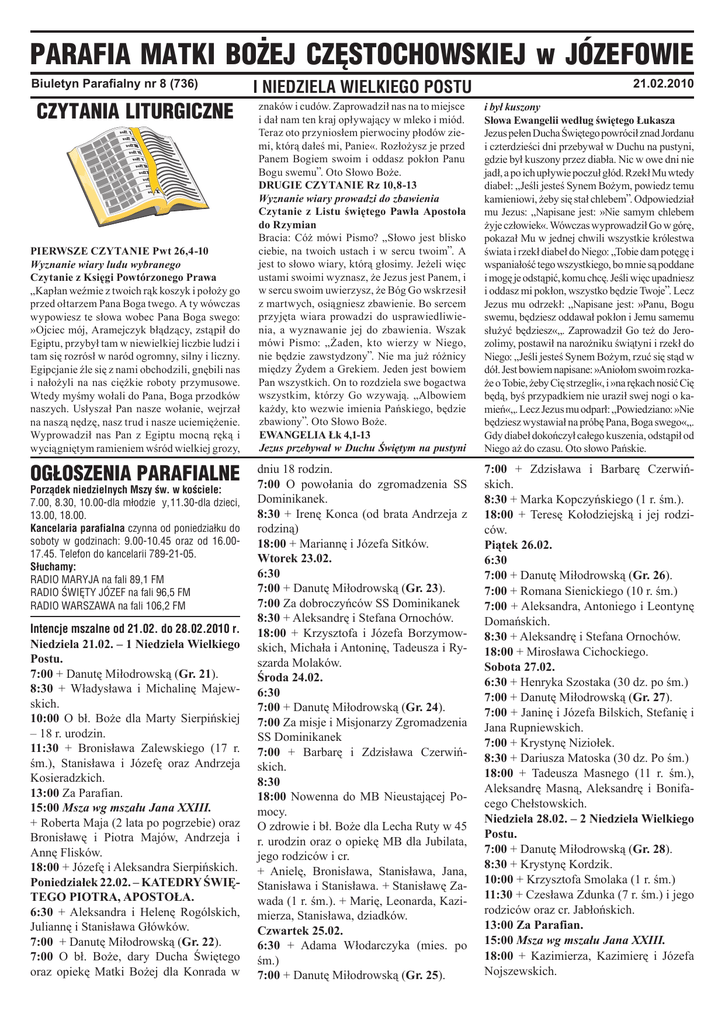PARAFIA MATKI BOŻEJ CZÊSTOCHOWSKIEJ w JÓZEFOWIE Biuletyn Parafialny nr 8 (736) CZYTANIA LITURGICZNE PIERWSZE CZYTANIE Pwt 26,4-10 Wyznanie wiary ludu wybranego Czytanie z Księgi Powtórzonego Prawa „Kapłan weźmie z twoich rąk koszyk i położy go przed ołtarzem Pana Boga twego. A ty wówczas wypowiesz te słowa wobec Pana Boga swego: »Ojciec mój, Aramejczyk błądzący, zstąpił do Egiptu, przybył tam w niewielkiej liczbie ludzi i tam się rozrósł w naród ogromny, silny i liczny. Egipcjanie źle się z nami obchodzili, gnębili nas i nałożyli na nas ciężkie roboty przymusowe. Wtedy myśmy wołali do Pana, Boga przodków naszych. Usłyszał Pan nasze wołanie, wejrzał na naszą nędzę, nasz trud i nasze uciemiężenie. Wyprowadził nas Pan z Egiptu mocną ręką i wyciągniętym ramieniem wśród wielkiej grozy, OG£OSZENIA PARAFIALNE Porz¹dek niedzielnych Mszy œw. w koœciele: 7.00, 8.30, 10.00-dla m³odzie¿y, 11.30-dla dzieci, 13.00, 18.00. Kancelaria parafialna czynna od poniedzia³ku do soboty w godzinach: 9.00-10.45 oraz od 16.0017.45. Telefon do kancelarii 789-21-05. S³uchamy: RADIO MARYJA na fali 89,1 FM RADIO ŒWIÊTY JÓZEF na fali 96,5 FM RADIO WARSZAWA na fali 106,2 FM Intencje mszalne od 21.02. do 28.02.2010 r. Niedziela 21.02. – 1 Niedziela Wielkiego Postu. 7:00 + Danutę Miłodrowską (Gr. 21). 8:30 + Władysława i Michalinę Majewskich. 10:00 O bł. Boże dla Marty Sierpińskiej – 18 r. urodzin. 11:30 + Bronisława Zalewskiego (17 r. śm.), Stanisława i Józefę oraz Andrzeja Kosieradzkich. 13:00 Za Parafian. 15:00 Msza wg mszału Jana XXIII. + Roberta Maja (2 lata po pogrzebie) oraz Bronisławę i Piotra Majów, Andrzeja i Annę Flisków. 18:00 + Józefę i Aleksandra Sierpińskich. Poniedziałek 22.02. – KATEDRY ŚWIĘTEGO PIOTRA, APOSTOŁA. 6:30 + Aleksandra i Helenę Rogólskich, Juliannę i Stanisława Główków. 7:00 + Danutę Miłodrowską (Gr. 22). 7:00 O bł. Boże, dary Ducha Świętego oraz opiekę Matki Bożej dla Konrada w I NIEDZIELA WIELKIEGO POSTU 21.02.2010 znaków i cudów. Zaprowadził nas na to miejsce i dał nam ten kraj opływający w mleko i miód. Teraz oto przyniosłem pierwociny płodów ziemi, którą dałeś mi, Panie«. Rozłożysz je przed Panem Bogiem swoim i oddasz pokłon Panu Bogu swemu”. Oto Słowo Boże. DRUGIE CZYTANIE Rz 10,8-13 Wyznanie wiary prowadzi do zbawienia Czytanie z Listu świętego Pawła Apostoła do Rzymian Bracia: Cóż mówi Pismo? „Słowo jest blisko ciebie, na twoich ustach i w sercu twoim”. A jest to słowo wiary, którą głosimy. Jeżeli więc ustami swoimi wyznasz, że Jezus jest Panem, i w sercu swoim uwierzysz, że Bóg Go wskrzesił z martwych, osiągniesz zbawienie. Bo sercem przyjęta wiara prowadzi do usprawiedliwienia, a wyznawanie jej do zbawienia. Wszak mówi Pismo: „Żaden, kto wierzy w Niego, nie będzie zawstydzony”. Nie ma już różnicy między Żydem a Grekiem. Jeden jest bowiem Pan wszystkich. On to rozdziela swe bogactwa wszystkim, którzy Go wzywają. „Albowiem każdy, kto wezwie imienia Pańskiego, będzie zbawiony”. Oto Słowo Boże. EWANGELIA Łk 4,1-13 Jezus przebywał w Duchu Świętym na pustyni i był kuszony Słowa Ewangelii według świętego Łukasza Jezus pełen Ducha Świętego powrócił znad Jordanu i czterdzieści dni przebywał w Duchu na pustyni, gdzie był kuszony przez diabła. Nic w owe dni nie jadł, a po ich upływie poczuł głód. Rzekł Mu wtedy diabeł: „Jeśli jesteś Synem Bożym, powiedz temu kamieniowi, żeby się stał chlebem”. Odpowiedział mu Jezus: „Napisane jest: »Nie samym chlebem żyje człowiek«. Wówczas wyprowadził Go w górę, pokazał Mu w jednej chwili wszystkie królestwa świata i rzekł diabeł do Niego: „Tobie dam potęgę i wspaniałość tego wszystkiego, bo mnie są poddane i mogę je odstąpić, komu chcę. Jeśli więc upadniesz i oddasz mi pokłon, wszystko będzie Twoje”. Lecz Jezus mu odrzekł: „Napisane jest: »Panu, Bogu swemu, będziesz oddawał pokłon i Jemu samemu służyć będziesz«„. Zaprowadził Go też do Jerozolimy, postawił na narożniku świątyni i rzekł do Niego: „Jeśli jesteś Synem Bożym, rzuć się stąd w dół. Jest bowiem napisane: »Aniołom swoim rozkaże o Tobie, żeby Cię strzegli«, i »na rękach nosić Cię będą, byś przypadkiem nie uraził swej nogi o kamień«„. Lecz Jezus mu odparł: „Powiedziano: »Nie będziesz wystawiał na próbę Pana, Boga swego«„. Gdy diabeł dokończył całego kuszenia, odstąpił od Niego aż do czasu. Oto słowo Pańskie. dniu 18 rodzin. 7:00 O powołania do zgromadzenia SS Dominikanek. 8:30 + Irenę Konca (od brata Andrzeja z rodziną) 18:00 + Mariannę i Józefa Sitków. Wtorek 23.02. 6:30 7:00 + Danutę Miłodrowską (Gr. 23). 7:00 Za dobroczyńców SS Dominikanek 8:30 + Aleksandrę i Stefana Ornochów. 18:00 + Krzysztofa i Józefa Borzymowskich, Michała i Antoninę, Tadeusza i Ryszarda Molaków. Środa 24.02. 6:30 7:00 + Danutę Miłodrowską (Gr. 24). 7:00 Za misje i Misjonarzy Zgromadzenia SS Dominikanek 7:00 + Barbarę i Zdzisława Czerwińskich. 8:30 18:00 Nowenna do MB Nieustającej Pomocy. O zdrowie i bł. Boże dla Lecha Ruty w 45 r. urodzin oraz o opiekę MB dla Jubilata, jego rodziców i cr. + Anielę, Bronisława, Stanisława, Jana, Stanisława i Stanisława. + Stanisławę Zawada (1 r. śm.). + Marię, Leonarda, Kazimierza, Stanisława, dziadków. Czwartek 25.02. 6:30 + Adama Włodarczyka (mies. po śm.) 7:00 + Danutę Miłodrowską (Gr. 25). 7:00 + Zdzisława i Barbarę Czerwińskich. 8:30 + Marka Kopczyńskiego (1 r. śm.). 18:00 + Teresę Kołodziejską i jej rodziców. Piątek 26.02. 6:30 7:00 + Danutę Miłodrowską (Gr. 26). 7:00 + Romana Sienickiego (10 r. śm.) 7:00 + Aleksandra, Antoniego i Leontynę Domańskich. 8:30 + Aleksandrę i Stefana Ornochów. 18:00 + Mirosława Cichockiego. Sobota 27.02. 6:30 + Henryka Szostaka (30 dz. po śm.) 7:00 + Danutę Miłodrowską (Gr. 27). 