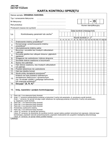 JRG NR …….. KM PSP POZNAŃ KARTA KONTROLI SPRZĘTU Nazwa sprzętu: DRABINA HAKOWA Typ / oznaczenie fabryczne: …………………………………… Nr fabryczny: …………………………………… Rok produkcji: …………………………………… – D Numer identyfikacyjny Producent (nazwa lub symbol): …………………………………… Data kontroli (miesiąc/rok) Kontrolowany parametr lub cecha1) Lp. Wynik kontroli (+ -)2) 1 1. 2. 3. 4. 5. 6. 7. 8. 9. 10. 11. 12. 13. 2 Znakowanie drabiny prawidłowe3) Konserwacja i przechowywanie drabiny prawidłowe4) Ukompletowanie drabiny pełne Bocznice i szczeble bez trwałych odkształceń i pęknięć Szczeble gładkie bez odłupań drewna i głębokich wgnieceń Ściągacze nie uszkodzone i dobrze skręcone Szczeble dobrze osadzone w bocznicach Spawy bez pęknbięć Hak dobrze osadzony, bez trwałych odkształceń lub pęknięć Powłoki lakiernicze nie uszkodzone Hak bez śladów korozji Wynik próby obciążenia pozytywne5) Drabina nie była poddana nadmiernym obciążeniom statycznym i dynamicznym (np. na skutek upadku z jadącego samochodu lub znacznej wysokości6) 14. Decyzja7) (S, R, K)8) 15. Imię, nazwisko i podpis kontrolującego 1) 2) 3) 4) 5) 6) 7) 8) 3 4 5 6 7 8 9 10 11 12 13 14 15 16 17 18 19 Patrz pkt. 3 na odwrocie Karty Kontroli. Znak „+” oznacza potwierdzenie podanej w kolumnie 2 cechy lub parametru, tj. pozytywny wynik kontroli. Znak „-” oznacza, że sprzęt lub jego część składowa nie wykazują podanej w kolumnie 2 cechy lub parametru, tj. negatywny wynik kontroli. Patrz pkt. 1 na odwrocie Karty Kontroli. Patrz pkt. 2 na odwrocie Karty Kontroli. Patrz pkt. 4 na odwrocie Karty Kontroli. Potwierdza użytkownik drabiny. Patrz pkt. 3 na odwrocie Karty Kontroli. Litera „S” oznacza, że sprzęt jest sprawny. Litera „R” oznacza, że stosownie do wyników kontroli, sprzęt należy poddać remontowi lub naprawie, dokonać jego konserwacji, poprawić warunki przechowywania, poprawić znakowanie lub uzupełnić niezbędną dokumentację. Litera „K” oznacza, że sprzęt należy poddać kasacji. UWAGI: 1. ZNAKOWANIE Drabina powinna być trwale i czytelnie oznakowana numerem identyfikacyjnym (inwentarzowym lub serwisowym). Znakowanie powinno być wykonane w sposób nie utrudniający odczytu znakowania producenta. Znakowanie nie powinno pogarszać cech użytkowych drabiny. 2. KONSERWACJA I PRZECHOWYWANIE Jeżeli producent nie zalecił inaczej, konserwację i przechowywanie należy prowadzić według podanych niżej zasad. Konserwację bieżącą drabiny należy przeprowadzać po każdym użyciu, podczas którego doszło do jej zabrudzenia lub zawilgocenia. Drabinę należy oczyścić, a następnie starannie wytrzeć miękką szmatą do sucha. Konserwację okresową należy przeprowadzać co 12 miesięcy, niezależnie od warunków, w których drabina była używana. W ramach konserwacji okresowej należy: • oczyścić szczeble papierem ściernym, • nasycić szczeble gorącym pokostem, • malować szczeble lakierem bezbarwnym wodoodpornym, po wniknięciu w nie pokostu, • oczyścić i natłuścić olejem maszynowym lub smarem ŁT-4S hak. Drabiny nie będące w użytkowaniu, prawidłowo zakonserwowane i magazynowane (tj. przechowywane w suchych i przewiewnych pomieszczeniach, w stanie zabezpieczonym przed działaniem światła słonecznego o dużym natężeniu, źródeł ciepła i wpływami czynników chemicznych) nie wymagają ponownej konserwacji. 3. KONTROLA 3.1. Kontrola okresowa Kontrolę okresową wykonuje jednostka PSP, w której posiadaniu jest drabina. Kontrola obejmuje drabiny będące w użytkowaniu oraz drabiny znajdujące się w magazynie. Kontrolę należy wykonywać co 12 miesięcy. Kontrola polega na sprawdzeniu kolejno wszystkich parametrów lub cech podanych w Karcie Kontroli i dokonaniu każdorazowo zapisów w Karcie zgodnie z podanymi w niej wskazówkami. Decyzja „S” powinna być podejmowana w przypadku, gdy wyniki wszystkich kontroli podanych w lp. 1 – 13 Karty są pozytywne. Decyzja „R” powinna być podejmowana, gdy negatywne są wyniki choć jednej z kontroli według lp. 1 – 3, 4 i 5 (w odniesieniu do szczebli, które można wymienić), lp. 6 – 7 i 9 – 11 – jeżeli nie stwierdzono uszkodzeń mogących pogorszyć bezpieczeństwo użytkowania drabiny. Jeżeli na podstawie wyników kontroli podjęto decyzję „R”, to bezpośrednio po usunięciu jej przyczyn (np. w wyniku wykonanej naprawy) należy dokonać kontroli co najmniej tych parametrów lub cech, które spowodowały tę decyzję. Ponownie zapisać wyniki kontroli i podjętą decyzję. Decyzja „K” powinna być podejmowana, gdy negatywne są wyniki choć jednej z kontroli według lp. 4 i 5 (w odniesieniu do bocznic), lp. 8, 12 i 13 – jeśli stwierdzono uszkodzenia mogące pogorszyć bezpieczeństwo użytkowania drabiny. Decyzję tę należy również podejmować w przypadku, gdy remont drabiny wymaga zbyt dużych nakładów pracy lub nie daje gwarancji odtworzenia wymaganych cech bez pogorszenia innych jej cech użytkowych. 3.2. Kontrola bieżąca Kontrolę bieżącą wykonuje użytkownik drabiny. Kontrola obejmuje wyłącznie drabiny będące w użytkowaniu. Kontrolę należy przeprowadzać po każdym użyciu drabiny. Kontrola polega na sprawdzeniu parametrów i cech podanych w lp. 3 – 11 i 13 Karty. Zapisy i podejmowanie decyzji powinny odbywać się na zasadach, jak dla kontroli okresowej według pkt. 3.1. W przypadku, gdy wszystkie wyniki kontroli bieżącej są pozytywne, można nie dokonywać jej zapisów. 4. PRÓBA OBCIĄŻENIA DRABINY Próby obciążenia drabiny należy wykonać w dwóch pozycjach: A i B na stanowisku według normy PN-87/M-51205. 4.1. Pozycja A Drabinę zawieszoną pionowo na pierwszym zębie haka obciążyć masą 100 kg zawieszoną na środku pierwszego szczebla. Czas trwania próby: 3 minuty. 4.2. Pozycja B Drabinę zawieszoną pionowo na całej dług