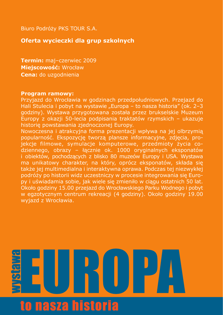 Biuro Podróży PKS TOUR S.A. Oferta wycieczki dla grup szkolnych Termin: maj–czerwiec 2009 Miejscowość: Wrocław Cena: do uzgodnienia Program ramowy: Przyjazd do Wrocławia w godzinach przedpołudniowych. Przejazd do Hali Stulecia i pobyt na wystawie „Europa – to nasza historia” (ok. 2–3 godziny). Wystawa przygotowana została przez brukselskie Muzeum Europy z okazji 50-lecia podpisania traktatów rzymskich – ukazuje historię powstawania zjednoczonej Europy. Nowoczesna i atrakcyjna forma prezentacji wpływa na jej olbrzymią popularność. Ekspozycję tworzą plansze informacyjne, zdjęcia, projekcje filmowe, symulacje komputerowe, przedmioty życia codziennego, obrazy – łącznie ok. 1000 oryginalnych eksponatów i obiektów, pochodzących z blisko 80 muzeów Europy i USA. Wystawa ma unikatowy charakter, na który, oprócz eksponatów, składa się także jej multimedialna i interaktywna oprawa. Podczas tej niezwykłej podróży po historii widz uczestniczy w procesie integrowania się Europy i uświadamia sobie, jak wiele się zmieniło w ciągu ostatnich 50 lat. Około godziny 15.00 przejazd do Wrocławskiego Parku Wodnego i pobyt w egzotycznym centrum rekreacji (4 godziny). Około godziny 19.00 wyjazd z Wrocławia. Świadczenia: przejazd autokarem ubezpieczenie NW i KL Bilety wstępu: Bilet wstępu do Wrocławskiego Parku Wodnego na 4 godziny Bilet wstępu do Wrocławskiego Parku Wodnego na 4 godziny + obiad na terenie WPW Bilet obejmuje wstęp do strefęy basenów rekreacyjnych. W grupach zorganizowanych (do 18 roku życia) na każde 10 osób musi przypadać 1 opiekun. Istnieje mozliwość wynajęcia opiekuna WPW. Koszt wynajęcia opiekuna na godzinę Bilety wstępu na wystawę Zamówienia: Biuro Podróży PKS TOUR S.A. ul. Sucha 1–11 50-086 Wrocław tel. (071) 336-63-10 fax (071) 367-00-51 www.pks-tour.com.pl www.polbus.pl – 25 zł – 38 zł – 16 zł – 5 zł