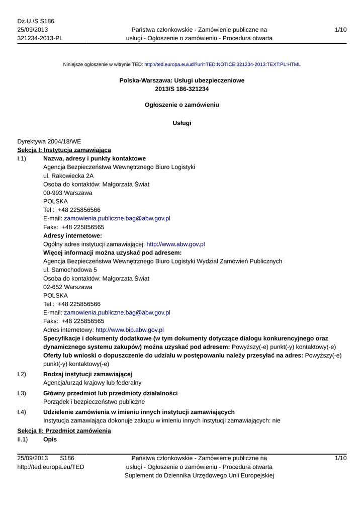 Dz.U./S S186 25/09/2013 321234-2013-PL Państwa członkowskie - Zamówienie publiczne na usługi - Ogłoszenie o zamówieniu - Procedura otwarta 1/10 Niniejsze ogłoszenie w witrynie TED: http://ted.europa.eu/udl?uri=TED:NOTICE:321234-2013:TEXT:PL:HTML Polska-Warszawa: Usługi ubezpieczeniowe 2013/S 186-321234 Ogłoszenie o zamówieniu Usługi Dyrektywa 2004/18/WE Sekcja I: Instytucja zamawiająca I.1) Nazwa, adresy i punkty kontaktowe Agencja Bezpieczeństwa Wewnętrznego Biuro Logistyki ul. Rakowiecka 2A Osoba do kontaktów: Małgorzata Świat 00-993 Warszawa POLSKA Tel.: +48 225856566 E-mail: [email protected] Faks: +48 225856565 Adresy internetowe: Ogólny adres instytucji zamawiającej: http://www.abw.gov.pl Więcej informacji można uzyskać pod adresem: Agencja Bezpieczeństwa Wewnętrznego Biuro Logistyki Wydział Zamówień Publicznych ul. Samochodowa 5 Osoba do kontaktów: Małgorzata Świat 02-652 Warszawa POLSKA Tel.: +48 225856566 E-mail: [email protected] Faks: +48 225856565 Adres internetowy: http://www.bip.abw.gov.pl Specyfikacje i dokumenty dodatkowe (w tym dokumenty dotyczące dialogu konkurencyjnego oraz dynamicznego systemu zakupów) można uzyskać pod adresem: Powyższy(-e) punkt(-y) kontaktowy(-e) Oferty lub wnioski o dopuszczenie do udziału w postępowaniu należy przesyłać na adres: Powyższy(-e) punkt(-y) kontaktowy(-e) I.2) Rodzaj instytucji zamawiającej Agencja/urząd krajowy lub federalny I.3) Główny przedmiot lub przedmioty działalności Porządek i bezpieczeństwo publiczne I.4) Udzielenie zamówienia w imieniu innych instytucji zamawiających Instytucja zamawiająca dokonuje zakupu w imieniu innych instytucji zamawiających: nie Sekcja II: Przedmiot zamówienia II.1) Opis 25/09/2013 S186 http://ted.europa.eu/TED Państwa członkowskie - Zamówienie publiczne na usługi - Ogłoszenie o zamówieniu - Procedura otwarta Suplement do Dziennika Urzędowego Unii Europejskiej 1/10 Dz.U./S S186 25/09/2013 321234-2013-PL Państwa członkowskie - Zamówienie publiczne na usługi - Ogłoszenie o zamówieniu - Procedura otwarta 2/10 II.1.1) Nazwa nadana zamówieniu przez instytucję zamawiającą: Zakup usługi ubezpieczeń komunikacyjnych pojazdów będących w dyspozycji Agencji Bezpieczeństwa Wewnętrznego. II.1.2) Rodzaj zamówienia oraz lokalizacja robót budowlanych, miejsce realizacji dostawy lub świadczenia usług Usługi Kategoria usług: nr 6: Usługi finansowe a) Usługi ubezpieczeniowe b) Usługi bankowe i inwestycyjne Główne miejsce lub lokalizacja robót budowlanych, miejsce realizacji dostawy lub świadczenia usług: Warszawa Kod NUTS PL127 II.1.3) Informacje na temat zamówienia publicznego, umowy ramowej lub dynamicznego systemu zakupów (DSZ) Ogłoszenie dotyczy zamówienia publicznego II.1.4) Informacje na temat umowy ramowej II.1.5) Krótki opis zamówienia lub zakupu Zakup usługi ubezpieczeń komunikacyjnych pojazdów będących w dyspozycji Agencji Bezpieczeństwa Wewnętrznego: 1) obowiązkowe ubezpieczenie od odpowiedzialności cywilnej (OC) za szkody powstałe w związku z ruchem pojazdów mechanicznych będących w posiadaniu jednostek organizacyjnych Agencji Bezpieczeństwa Wewnętrznego, 2) ubezpieczenie wszystkich pojazdów będących w posiadaniu jednostek organizacyjnych Agencji Bezpieczeństwa Wewnętrznego od uszkodzeń autocasco (AC) w niepełnym zakresie, 3) ubezpieczenie sześciu pojazdów Agencji Bezpieczeństwa Wewnętrznego od uszkodzeń (AC), od kradzieży (KR) i następstw nieszczęśliwych wypadków (NW) oraz jednej tablicy badawczej od uszkodzeń (AC) i następstw nieszczęśliwych wypadków (NW). Szczegółowe wymagania w zakresie przedmiotu zamówienia zawarte są w załączniku nr 1 – formularz oferty oraz w załączniku nr 2 – istotne postanowienia umowy. II.1.6) Wspólny Słownik Zamówień (CPV) 66510000, 66512100, 66514110, 66516100 II.1.7) Informacje na temat Porozumienia w sprawie zamówień rządowych (GPA) Zamówienie jest objęte Porozumieniem w sprawie zamówień rządowych (GPA): tak II.1.8) Części To zamówienie podzielone jest na części: nie II.1.9) Informacje o ofertach wariantowych Dopuszcza się składanie ofert wariantowych: nie II.2) Wielkość lub zakres zamówienia II.2.1) Całkowita wielkość lub zakres: powyżej 130 000 EUR. Szacunkowa wartość bez VAT: 1 580 000 PLN II.2.2) Informacje o opcjach Opcje: nie II.2.3) Informacje o wznowieniach 25/09/2013 S186 http://ted.europa.eu/TED Państwa członkowskie - Zamówienie publiczne na usługi - Ogłoszenie o zamówieniu - Procedura otwarta Suplement do Dziennika Urzędowego Unii Europejskiej 2/10 Dz.U./S S186 25/09/2013 321234-2013-PL Państwa członkowskie - Zamówienie publiczne na usługi - Ogłoszenie o zamówieniu - Procedura otwarta 3/10 Jest to zamówienie podlegające wznowieniu: nie II.3) Czas trwania zamówienia lub termin realizacji Rozpoczęcie 1.1.2014. Zakończenie 31.12.2015 Sekcja III: Informacje o charakterze prawnym, ekonomicznym, finansowym i technicznym III.1) Warunki dotyczące zamówienia III.1.1) Wymagane wadia i gwarancje: 1) Wykonawca przystępujący do przetargu jest zobowiązany wnieść wadium w wysokości 30 000 zł do dnia 04.11.2013 roku do godz. 10:00. 2) Wadium musi być wniesione przed upływem terminu składania ofert; 3) Wadium może być wnoszone w jednej lub kilku następujących formach: a) w pieniądzu wpłaconym przelewem na rachunek bankowy: Agencja Bezpieczeństwa Wewnętrznego, Biuro Logistyki, NBP O/O Warszawa, nr konta 15 1010 1010 0092 6313 9120 0000, z adnotacją „wadium w postępowaniu nr 11/IV/2013”; b) poręczeniach bankowych lub poręczeniach spółdzielczej kasy oszczędnościowo-kredytowej, z tym że poręczenie kasy jest zawsze poręczeniem pieniężnym; c) gwarancjach bankowych; d) gwarancjach ubezpieczeniowych; e) poręczeniach udzielanych przez podmioty, o których mowa w art. 6b ust. 5 pkt 2 ustawy z 9 listopada 2000 r. o utworzeniu Polskiej Agencji Rozwoju Przedsiębiorczo