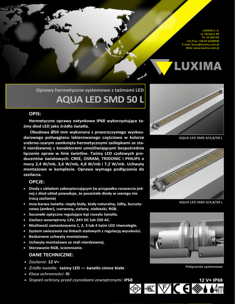 LUXIMA S. A. ul. Okrężna 4B PL 19-300 Ełk Tel./Fax: +48 87 6200930 E-mail: [email protected] Web: www.luxima.com.pl Oprawy hermetyczne systemowe z taśmami LED AQUA LED SMD 50 L OPIS: Hermetyczne oprawy natynkowe IP68 wykorzystujące taśmy diod LED jako źródło światła. Obudowa Ø50 mm wykonana z przezroczystego wyskoudarowego poliwęglanu lakierowanego częściowo w kolorze srebrno-szarym zamknięta hermetycznymi zaślepkami ze stali nierdzewnej z konektorami umożliwiającymi bezpośrednie łączenie opraw w linie świetlne. Taśmy LED czołowych producentów światowych: CREE, OSRAM, TRIDONIC i PHILIPS o mocy 2,4 W/mb, 3,6 W/mb, 4,8 W/mb i 7,2 W/mb. Uchwyty montażowe w komplecie. Oprawa wymaga podłączenia do zasilacza. AQUA LED SMD 4/4,8/50 L OPCJE: Diody z układem zabezpieczającym (w przypadku rozwarcia jednej z diod układ powoduje, że pozostałe diody w szeregu nie tracą zasilania) Inna barwa światła: ciepły biały, biały naturalny, żółty, bursztynowy (amber), czerwony, zielony, niebieski, RGB. Soczewki optyczne regulujące kąt rozsyłu światła. Zasilacz wewnętrzny 12V, 24V DC lub 230 AC. Możliwośd zamontowania 1, 2, 3 lub 4 taśm LED równolegle. System zwieszania na linkach stalowych z regulacją wysokości. Bezbarwne uchwyty montażowe. Uchwyty montażowe ze stali nierdzewnej. Sterowanie RGB, ściemnianie. AQUA LED SMD 4/4,8/50 L DANE TECHNICZNE: Zasilanie: 12 V= Źródło światła: taśmy LED — światło zimne białe Klasa ochronności: III Stopieo ochrony przed czynnikami zewnętrznymi: IP68 Połączenie systemowe 12 V= IP68 LUXIMA S. A. ul. Okrężna 4B PL 19-300 Ełk Tel./Fax: +48 87 6200930 E-mail: [email protected] Web: www.luxima.com.pl Nazwa Kod Aqua LED SMD 4/4.8/50 L OL-LED-4SMD-4.8/50/1000/hl Wymiary SxD [mm] Ø50x1094 Moc [W] Waga [kg] 19,2 0,5 OL-LED-NSMD-M/S/D/hl— N-liczba taśm LED (1-4), M-moc taśmy LED dł. 1 m (2,4; 3,6; 4,8 lub 7,2 W/mb), S-średnica obudowy (20, 30, 38, 50), D-długośd lampy AQUA LED SMD L są oprawami systemowymi, przystosowanymi do łączenia w ciągi świetlne. Montaż systemowy jest możliwy poprzez zastosowanie szeregowego systemu połączeo (oprawy łączone bezpośrednio ze sobą) z zachowaniem szczelności połączeo IP68. Oferujemy możliwośd wykonania opraw o dowolnej długości do maksymalnie 2 m, z ilością LED zapewniającą uzyskanie wymaganego przez odbiorcę strumienia światła (od 100 lm/mb do 450 lm/mb) i kąta świecenia. LUXIMA S. A. zastrzega sobie prawo do wprowadzania zmian konstrukcyjnych nie zmieniających funkcjonalności i podstawowych parametrów opraw. Krzywe rozsyłu wszystkich opraw w wersji elektronicznej dla programów DIALux™ i ilumiCAD™ dostępne do pobrania na stronie internetowej www.luxima.com.pl. © LUXIMA S. A.