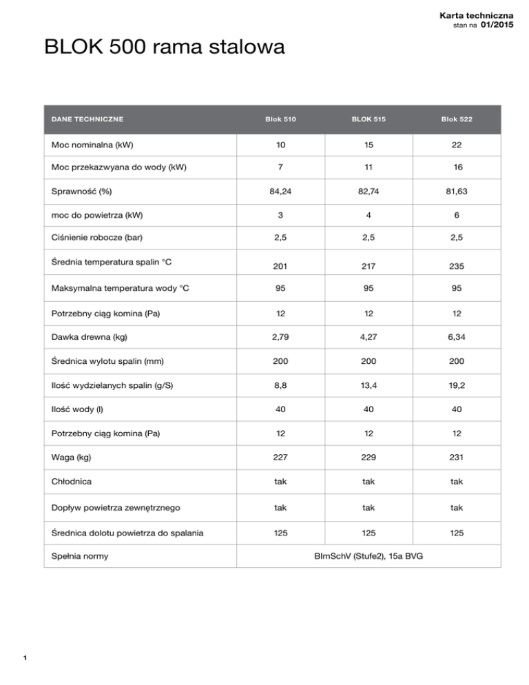 Karta techniczna stan na 01/2015 BLOK 500 rama stalowa DANE TECHNICZNE Blok 510 BLOK 515 Blok 522 Moc nominalna (kW) 10 15 22 Moc przekazwyana do wody (kW) 7 11 16 84,24 82,74 81,63 moc do powietrza (kW) 3 4 6 Ciśnienie robocze (bar) 2,5 2,5 2,5 201 217 235 Maksymalna temperatura wody °C 95 95 95 Potrzebny ciąg komina (Pa) 12 12 12 Dawka drewna (kg) 2,79 4,27 6,34 Średnica wylotu spalin (mm) 200 200 200 Ilość wydzielanych spalin (g/S) 8,8 13,4 19,2 Ilość wody (l) 40 40 40 Potrzebny ciąg komina (Pa) 12 12 12 Waga (kg) 227 229 231 Chłodnica tak tak tak Dopływ powietrza zewnętrznego tak tak tak Średnica dolotu powietrza do spalania 125 125 125 Sprawność (%) Średnia temperatura spalin °C Spełnia normy 1 BImSchV (Stufe2), 15a BVG BLOK 500 rama stalowa 2 Karta techniczna stan na 01/2015