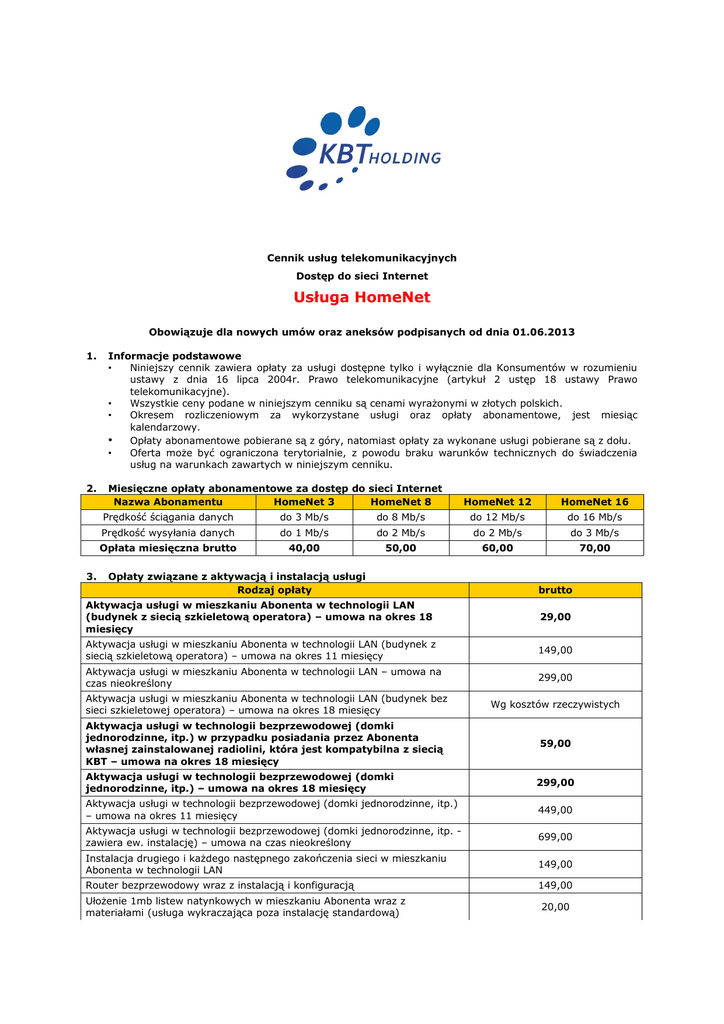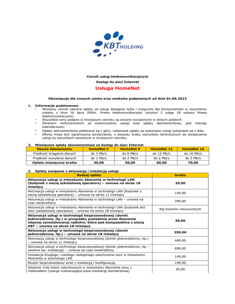 Cennik usług telekomunikacyjnych Dostęp do sieci Internet Usługa HomeNet Obowiązuje dla nowych umów oraz aneksów podpisanych od dnia 01.06.2013 1. Informacje podstawowe • Niniejszy cennik zawiera opłaty za usługi dostępne tylko i wyłącznie dla Konsumentów w rozumieniu ustawy z dnia 16 lipca 2004r. Prawo telekomunikacyjne (artykuł 2 ustęp 18 ustawy Prawo telekomunikacyjne). • Wszystkie ceny podane w niniejszym cenniku są cenami wyrażonymi w złotych polskich. • Okresem rozliczeniowym za wykorzystane usługi oraz opłaty abonamentowe, jest miesiąc kalendarzowy. • Opłaty abonamentowe pobierane są z góry, natomiast opłaty za wykonane usługi pobierane są z dołu. • Oferta może być ograniczona terytorialnie, z powodu braku warunków technicznych do świadczenia usług na warunkach zawartych w niniejszym cenniku. 2. Miesięczne opłaty abonamentowe za dostęp do sieci Internet Nazwa Abonamentu HomeNet 3 HomeNet 8 3. HomeNet 12 HomeNet 16 Prędkość ściągania danych do 3 Mb/s do 8 Mb/s do 12 Mb/s do 16 Mb/s Prędkość wysyłania danych do 1 Mb/s do 2 Mb/s do 2 Mb/s do 3 Mb/s Opłata miesięczna brutto 40,00 50,00 60,00 70,00 Opłaty związane z aktywacją i instalacją usługi Rodzaj opłaty brutto Aktywacja usługi w mieszkaniu Abonenta w technologii LAN (budynek z siecią szkieletową operatora) – umowa na okres 18 miesięcy 29,00 Aktywacja usługi w mieszkaniu Abonenta w technologii LAN (budynek z siecią szkieletową operatora) – umowa na okres 11 miesięcy 149,00 Aktywacja usługi w mieszkaniu Abonenta w technologii LAN – umowa na czas nieokreślony 299,00 Aktywacja usługi w mieszkaniu Abonenta w technologii LAN (budynek bez sieci szkieletowej operatora) – umowa na okres 18 miesięcy Wg kosztów rzeczywistych Aktywacja usługi w technologii bezprzewodowej (domki jednorodzinne, itp.) w przypadku posiadania przez Abonenta własnej zainstalowanej radiolini, która jest kompatybilna z siecią KBT – umowa na okres 18 miesięcy 59,00 Aktywacja usługi w technologii bezprzewodowej (domki jednorodzinne, itp.) – umowa na okres 18 miesięcy 299,00 Aktywacja usługi w technologii bezprzewodowej (domki jednorodzinne, itp.) – umowa na okres 11 miesięcy 449,00 Aktywacja usługi w technologii bezprzewodowej (domki jednorodzinne, itp. zawiera ew. instalację) – umowa na czas nieokreślony 699,00 Instalacja drugiego i każdego następnego zakończenia sieci w mieszkaniu Abonenta w technologii LAN 149,00 Router bezprzewodowy wraz z instalacją i konfiguracją 149,00 Ułożenie 1mb listew natynkowych w mieszkaniu Abonenta wraz z materiałami (usługa wykraczająca poza instalację standardową) 20,00 4. Opłaty związane z obsługą konta Abonenta Rodzaj usługi netto VAT Zmiana abonamentu na abonament o niższej wartości* brutto Bez opłat Zmiana abonamentu na abonament o wyższej wartości* Publiczny adres IP – na życzenie abonenta, przyznawany w miarę możliwości technicznych – abonament miesięczny 5,00 Przywrócenie pełnego zakresu usług po czasowym odłączeniu z powodu nieuregulowania należnych płatności 20,00 Kara umowna za udostępnienie usługi poza lokal Abonenta, za komercyjne wykorzystanie udostępnionego łącza internetowego oraz za wykorzystanie wykupionej usługi celem świadczenia usług osobom trzecim (Operator odstępuje od zgłoszenia przestępstwa wyznaczonym organom) 9.000,00 Kara umowna za niezwrócenie przez i na koszt Abonenta w terminie 10 dni od daty wygaśnięcia umowy urządzeń będących własnością Operatora 2.000,00 Czasowe zawieszenie usługi i/lub umowy terminowej na wniosek Abonenta, płatne jednorazowo na kolejne 3 miesiące trwania umowy (w przypadku umów terminowych istnieje tylko jedna możliwość skorzystania z zawieszenia usług na 3 miesiące, która wpływa na czas trwania umowy o jej przedłużenie o okres 3 miesięcy) 20,00 Opłata za przejęcie uprawnień do korzystania z usługi w wyniku umowy cesji Bez opłat Wystawienie duplikatu rachunku/faktury – za każdy dokument 5,00 Wystawienie wezwania do zapłaty Nie podlega 20,00 * zgłoszenie zmiany będzie obowiązywało od następnego okresu rozliczeniowego po okresie, w którym taką zmianę zgłoszono 5. Opłaty dodatkowe - instalacja i eksploatacja urządzeń telekomunikacyjnych Rodzaj usługi* netto VAT Przeniesienie jednego zakończenia sieci w ramach lokalu brutto 90,00 Przeniesienie jednego zakończenia sieci poza lokal Wg kosztów rzeczywistych Usuwanie uszkodzenia zakończenia sieciowego, powstałego z winy klienta Wg kosztów rzeczywistych Konfiguracja komputera: konfiguracja programu pocztowego, konfiguracja TCP/IP, podstawowa konfiguracja przeglądarki internetowej np. Internet Explorer (opłata za każdą rozpoczętą godzinę pracy) 90,00 Czynności wymagające pracy techników w lokalizacji Abonenta, a niewymienione w niniejszym cenniku – za każda rozpoczętą godzinę pracy 90,00 Koszt każdej rozpoczętej godziny pracy jednego, bądź dwóch techników KBT, uwzględniany przy szacowaniu kosztów rzeczywistych, bądź przy pracach wymagających indywidualnej wyceny 90,00 Nieuzasadnione wezwanie technika Prace i czynności specjalne *Usługi dostępne w miarę możliwości technicznych 6. 90,00 Wg kosztów rzeczywistych Charakterystyka usługi • Stały, nielimitowany dostęp do sieci Internet dla odbiorców domowych • Brak limitów przesyłania danych • Brak limitów podłączonych komputerów w mieszkaniu Abonenta • Podane prędkości są prędkościami maksymalnymi, jakie może osiągnąć Abonent, do najbliższego • • routera brzegowego Operatora (EIR), gwarantowana przepustowość łącza (CIR) wynosi 25% EIR Brak możliwości prowadzenia działalności komercyjnej przy wykorzystaniu Usługi Brak możliwości udostępniania Usługi osobom trzecim