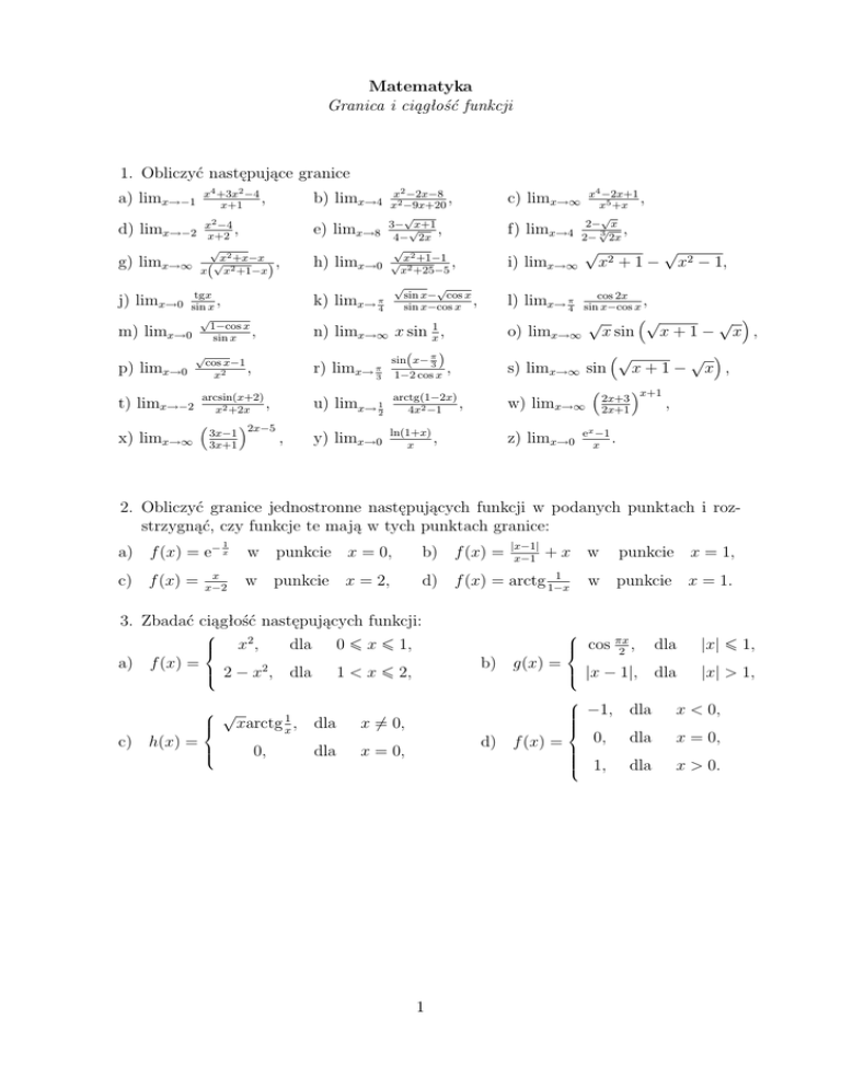 Matematyka Granica i ciągłość funkcji 1. Obliczyć następujące granice x4 +3x2 −4 , x+1 x2 −2x−8 , x2 −9x+20 √ √x+1 , limx→8 3− 4− 2x √ 2 +1−1 limx→0 √xx2 +25−5 , x4 −2x+1 , x5 +x √ 2− x √ limx→4 2− , 3 2x b) limx→4 c) limx→∞ d) limx→−2 e) f) g) h) a) limx→−1 x2 −4 , x+2 √ 2 , limx→∞ x √xx2+x−x ( +1−x) tgx , sin x √ x , limx→0 1−cos sin x √ √ sin x− cos x , sin x−cos x j) limx→0 k) limx→ π4 m) n) limx→∞ x sin x1 , p) limx→0 √ cos x−1 , x2 t) limx→−2 arcsin(x+2) , x2 +2x x) limx→∞ 3x−1 3x+1 2x−5 √ l) limx→ π4 cos 2x , sin x−cos x x2 + 1 − √ o) limx→∞ x sin r) limx→ π3 sin(x− π3 ) , 1−2 cos x s) limx→∞ sin u) limx→ 1 arctg(1−2x) , 4x2 −1 w) limx→∞ y) limx→0 ln(1+x) , x z) limx→0 2 , i) limx→∞ √ 2x+3 2x+1 √ √ x2 − 1, x+1− x+1− x+1 √ x , √ x , , ex −1 . x 2. Obliczyć granice jednostronne następujących funkcji w podanych punktach i rozstrzygnąć, czy funkcje te mają w tych punktach granice: a) f (x) = e− x 1 w punkcie x = 0, b) f (x) = c) f (x) = x x−2 w punkcie x = 2, 1 d) f (x) = arctg 1−x |x−1| x−1 +x w punkcie x = 1, w punkcie x = 1. 3. Zbadać ciągłość następujących funkcji: x2 , a) f (x) = 2 2−x , dla 0 ¬ x ¬ 1, dla 1 < x ¬ 2, √ 1 xarctg x , c) h(x) = 0, dla x 6= 0, dla x = 0, cos πx , 2 dla |x| ¬ 1, |x − 1|, dla |x| > 1, b) g(x) = −1, d) f (x) = 0, 1, 1 dla x < 0, dla x = 0, dla x > 0. 4. Wyznaczyć punkty nieciągłości podanych funkcji i określić ich rodzaj − log 1 (x + 3), 2 π a) f (x) = b) g(x) = 2 , arctg x1 , dla −3 < x ¬ −2, dla −2 < x ¬ 0, dla 0 < x, x+1 1 , 2 x2 + 1 + π2 x − x ¬ 1, dla −1 < x < π2 , ¬ x ¬ π, ctgx, dla 0, dla π < x < 2π, | sin x|, dla 2π ¬ x, arctg x+ cos x, c) h(x) = π , 2 dla π 2 , dla dla −tgx, dla 1, dla π 2 x < − π2 , − π2 ¬ x ¬ π2 , π 2 < x < π, π ¬ x. 5. Niech h : R → R będzie funkcją określoną wzorem h(x) = ax + 1, x < −1, x2 + b, −1 ¬ x < 1, (x + a)2 , x 1. Dobrać parametry a i b tak, aby funkcja h była ciągła w zbiorze R. 2