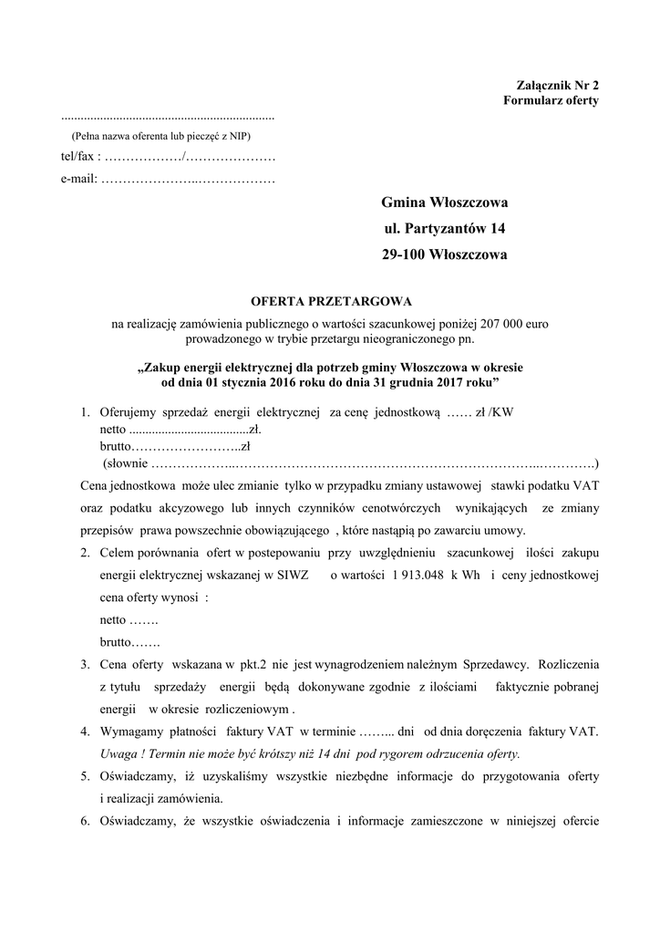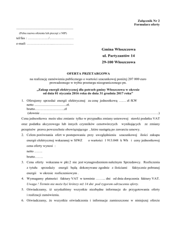 Załącznik Nr 2 Formularz oferty .................................................................. (Pełna nazwa oferenta lub pieczęć z NIP) tel/fax : ………………/………………… e-mail: …………………..……………… Gmina Włoszczowa ul. Partyzantów 14 29-100 Włoszczowa OFERTA PRZETARGOWA na realizację zamówienia publicznego o wartości szacunkowej poniżej 207 000 euro prowadzonego w trybie przetargu nieograniczonego pn. „Zakup energii elektrycznej dla potrzeb gminy Włoszczowa w okresie od dnia 01 stycznia 2016 roku do dnia 31 grudnia 2017 roku” 1. Oferujemy sprzedaż energii elektrycznej za cenę jednostkową …… zł /KW netto .....................................zł. brutto……………………..zł (słownie ………………..……………………………………………………………..………….) Cena jednostkowa może ulec zmianie tylko w przypadku zmiany ustawowej stawki podatku VAT oraz podatku akcyzowego lub innych czynników cenotwórczych wynikających ze zmiany przepisów prawa powszechnie obowiązującego , które nastąpią po zawarciu umowy. 2. Celem porównania ofert w postepowaniu przy uwzględnieniu szacunkowej ilości zakupu energii elektrycznej wskazanej w SIWZ o wartości 1 913.048 k Wh i ceny jednostkowej cena oferty wynosi : netto ……. brutto……. 3. Cena oferty wskazana w pkt.2 nie jest wynagrodzeniem należnym Sprzedawcy. Rozliczenia z tytułu sprzedaży energii będą dokonywane zgodnie z ilościami faktycznie pobranej energii w okresie rozliczeniowym . 4. Wymagamy płatności faktury VAT w terminie ……... dni od dnia doręczenia faktury VAT. Uwaga ! Termin nie może być krótszy niż 14 dni pod rygorem odrzucenia oferty. 5. Oświadczamy, iż uzyskaliśmy wszystkie niezbędne informacje do przygotowania oferty i realizacji zamówienia. 6. Oświadczamy, że wszystkie oświadczenia i informacje zamieszczone w niniejszej ofercie są kompletne, prawdziwe i rzetelne. 7. Oświadczamy, że posiadamy podpisaną z PGE Obrót S.A. umowę umożliwiającą realizację przedmiotu zamówienia , tj. dostawę energii elektrycznej do punktów na potrzeby socjalne, mieszkaniowe i komunalne zgodnie z SIWZ 8. Oświadczam, że zgodnie z art.26 ust.2b ustawy Pzp, będę korzystał / nie będę korzystał (niepotrzebne skreślić) z zasobów następujących podmiotów…………………………………… 9. Oświadczam, że uważamy się za związanych niniejszą ofertą przez okres 30 dni od terminu składania ofert. 10. Oświadczam, że załączony do Specyfikacji Istotnych Warunków Zamówienia wzór umowy został przez nas zaakceptowany i zobowiązujemy się w przypadku wyboru oferty do jej zawarcia w miejscu i terminie wyznaczonym przez Zamawiającego. 11. Przedmiot zamówienia wykonamy sami/przy udziale podwykonawcy (niepotrzebne skreślić) − zakres prac powierzony podwykonawcy: ....................................................................................................................................................... 12. Oświadczam, iż w przypadku wyboru mojej oferty należności z tytułu realizacji umowy należy przekazywać na konto w Banku ........................................................., Nr rachunku ....................................................................................................................................................... 13. Oferta zawiera .............. ponumerowanych stron wraz załącznikami (wymienić załączniki wg kolejności): 1. ........................... 2. ........................... 3. ............................ 4. ............................ 5. ............................ ......................................................... miejscowość, data .......................................................................................... Podpis (osoba upoważniona do reprezentowania oferenta) Załącznik Nr 3 OŚWIADCZENIE o spełnieniu warunków udziału w postępowaniu Przystępując do postępowania o udzielenie zamówienia publicznego o wartości szacunkowej poniżej 207 000 euro prowadzonego w trybie przetargu nieograniczonego na zadanie pn. „Zakup energii elektrycznej dla potrzeb gminy Włoszczowa w okresie od dnia 01 stycznia 2016 roku do dnia 31 grudnia 2017 roku” ja, niżej podpisany ………………………………….……………...……………………………………… (imię i nazwisko) reprezentujący firmę ……………………………...……………………………………………………….. (nazwa firmy) ……………………………………………………………………………………………………………… ……………………………………………………………………………………………………………… jako …………………………………...……………………………………………………………………. (pełniona funkcja) w imieniu swoim i reprezentowanej przez mnie firmy oświadczam zgodnie z art. 44 ustawy - Prawo zamówień publicznych, że spełniam/y warunki udziału w postępowaniu, o którym mowa w art. 22 ust. 1 ustawy z dnia 29 stycznia 2004 r. – Prawo zamówień publicznych (tj. Dz. U. z 2013 r., poz. 907 ze. zm.), dotyczące: 1. posiadania uprawnień do wykonywania określonej działalności lub czynności, jeżeli przepisy prawa nakładają obowiązek ich posiadania (dotyczy/nie dotyczy*), 2. posiadania wiedzy i doświadczenia, 3. dysponowania odpowiednim potencjałem technicznym oraz osobami zdolnymi do wykonania zamówienia, 4. sytuacji ekonomicznej i finansowej zapewniającej wykonanie zamówienia, Miejscowość ………………….., dnia…………. ……………………………………………………. (podpis/y osoby/osób upoważnionych do reprezentowania Wykonawcy) Załącznik Nr 4 OŚWIADCZENIE Wykonawcy o braku podstaw do wykluczeniu z postępowania Przystępując do post