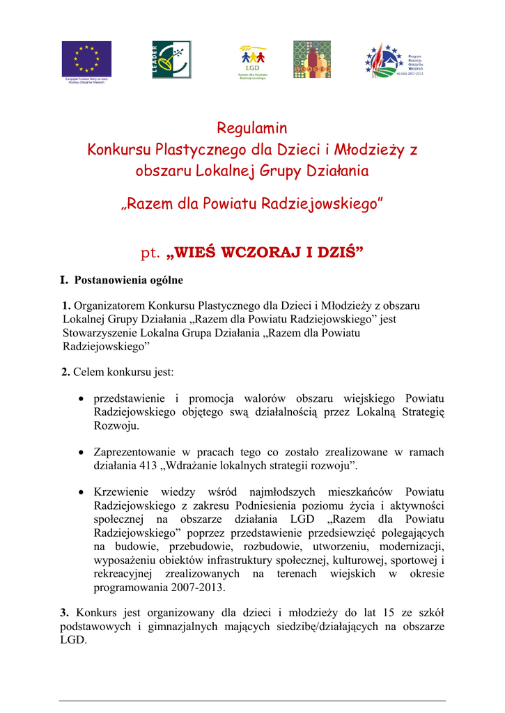 Europejski Fundusz Rolny na rzecz Rozwoju Obszarów Wiejskich Regulamin Konkursu Plastycznego dla Dzieci i Młodzieży z obszaru Lokalnej Grupy Działania „Razem dla Powiatu Radziejowskiego” pt. „WIEŚ WCZORAJ I DZIŚ” I. Postanowienia ogólne 1. Organizatorem Konkursu Plastycznego dla Dzieci i Młodzieży z obszaru Lokalnej Grupy Działania „Razem dla Powiatu Radziejowskiego” jest Stowarzyszenie Lokalna Grupa Działania „Razem dla Powiatu Radziejowskiego” 2. Celem konkursu jest: przedstawienie i promocja walorów obszaru wiejskiego Powiatu Radziejowskiego objętego swą działalnością przez Lokalną Strategię Rozwoju. Zaprezentowanie w pracach tego co zostało zrealizowane w ramach działania 413 „Wdrażanie lokalnych strategii rozwoju”. Krzewienie wiedzy wśród najmłodszych mieszkańców Powiatu Radziejowskiego z zakresu Podniesienia poziomu życia i aktywności społecznej na obszarze działania LGD „Razem dla Powiatu Radziejowskiego” poprzez przedstawienie przedsiewzięć polegających na budowie, przebudowie, rozbudowie, utworzeniu, modernizacji, wyposażeniu obiektów infrastruktury społecznej, kulturowej, sportowej i rekreacyjnej zrealizowanych na terenach wiejskich w okresie programowania 2007-2013. 3. Konkurs jest organizowany dla dzieci i młodzieży do lat 15 ze szkół podstawowych i gimnazjalnych mających siedzibę/działających na obszarze LGD. II. Przepisy dotyczące prac 1. Prace powinny być związane tematycznie z powstałymi zmianami na obszarze wiejskim Powiatu Radziejowskiego tj., świtlice wiejskie, place zabaw, przedstawienie atrakcji turystycznych oraz miejsc atrakcyjnych turystycznie. 2. Prace będą oceniane w 3 kategoriach wiekowych: - dzieci w wieku od 6 do 9 lat ze Szkół Podstawowych - dzieci w wieku od 9 do 12 lat ze Szkół Podstawowych - oraz w kategorii wiekowej od 13 do 15 lat młodzież gimnazjalna 3. Każdy uczestnik może złożyć 1 pracę konkursową. 4. Praca powinna być wykonana na bloku rysunkowym lub technicznym w formacje A3, w dowolnej technice plastycznej (np. kredki, farby, ołówek, mazaki, wyklejanka itp.) 5. Każda praca powinna być podpisana: imię i nazwisko autora, nr telefonu, klasa, nazwa szkoły, miejscowość, tytuł, nazwę obiektu/miejsca, którego dotyczy praca. 6. Prace zbiorczo z danej szkoły należy złożyć lub nadesłać pocztą na adres Lokalna Grupa Działania „Razem dla Powiatu Radziejowskiego” ul. Kościuszki 58, 88-200 Radziejów 7. Organizator zastrzega sobie prawo do wyłączenia z udziału w konkursie prac niespełniających kryteriów tematycznych oraz niespełniających wyżej wymienionych wymogów. 8. Organizator zastrzega sobie również prawo do wykorzystania nadesłanych prac. III. Terminarz 1. Termin nadsyłania prac trwa do 9 marca 2015 r. (liczy się termin dostarczenia prac do biura LGD). 2. Prace nadesłane po terminie nie będą brane pod uwagę. 3. Oceny nadesłanych prac dokona komisja konkursowa powołana przez Organizatora. 4. Kryteriami oceny będą: trafność doboru tematu pracy, walory artystyczne: kompozycja, technika wykonania. 5. Zwycięzcy konkursu zostaną powiadomieni przez organizatora telefonicznie. 6. Wyniki konkursu zostaną ogłoszone na uroczystości podsumowania konkursu. IV. Nagrody 1. Organizator przewiduje atrakcyjne nagrody rzeczowe w każdej z kategorii wiekowej za zajęcie I, II i III miejsca oraz nagrody specjalne-wyróżnienia a także dla szkół biorących udział w konkursie – gra planszowa Flagi-Memory. 2. Odbiór nagród nastąpi osobiście podczas uroczystego podsumowania konkursu, które odbędzie się 31 marca 2015 roku w Szkole Podstawowej w Bieganowie (sala gimnastyczna) Gmina Radziejów. V. Wykorzystanie prac 1. Organizator zastrzega sobie prawo do wykorzystania nadesłanych prac umieszczenia fotokopii na stronie internetowej. 2. Organizator uzyskuje nieodpłatne prawo do prezentowania prac na okolicznościowych wystawach, materiałach promujących oraz w artykułach pokonkursowych i lokalnej prasie, celem promowania i prezentowania działań zrealizowanych przez LGD. 3. Nadesłanie prac na konkurs jest równoznaczne ze zgodą na przetwarzanie danych osobowych dla celów konkursowych oraz promujących Organizatora, oświadczeniem osobistego wykonania pracy, oświadczeniem posiadania praw autorskich do prac i akceptację niniejszego regulaminu oraz zgody na publikacje fotografii z przebiegu konkursu i wręczania nagród (w tym wizerunku fotografowanych osób).