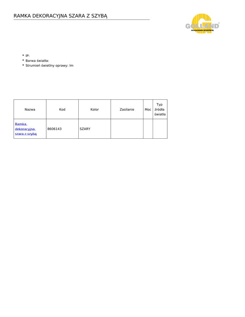 RAMKA DEKORACYJNA SZARA Z SZYBĄ IP: Barwa światła: Strumień świetlny oprawy: lm Typ Nazwa Kod Kolor Zasilanie Moc źródła światła Ramka dekoracyjna szara z szybą 8606143 SZARY
