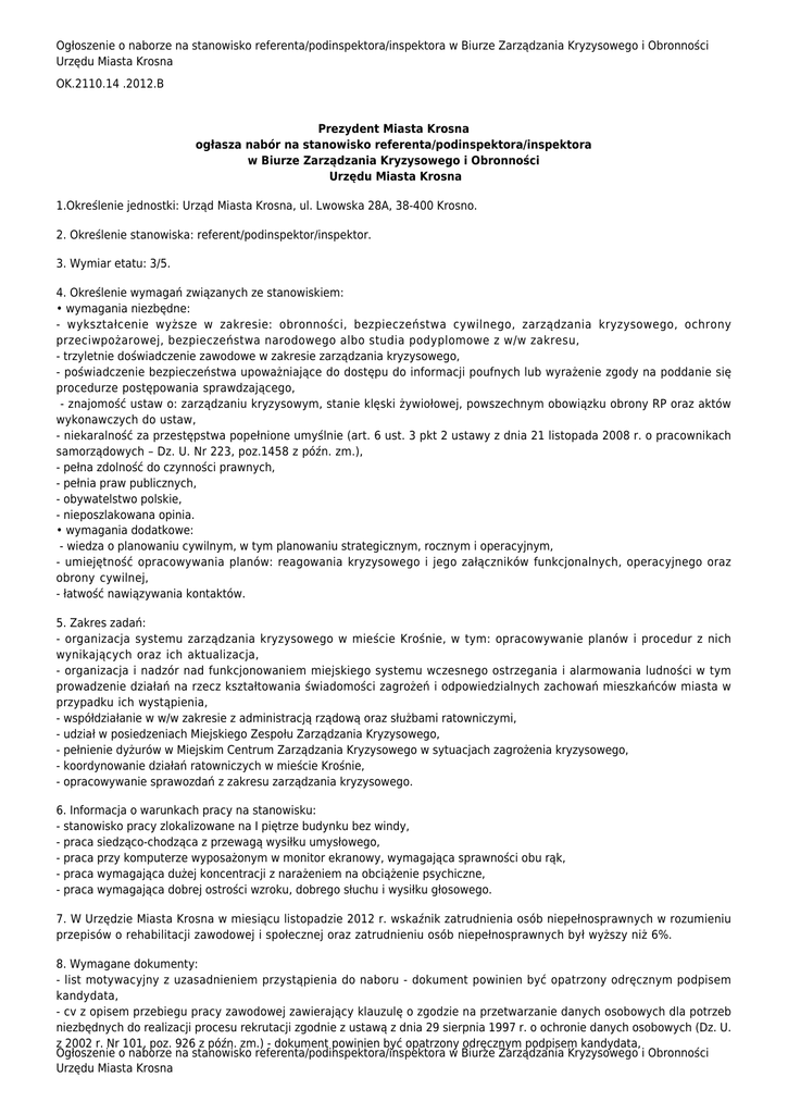 Ogłoszenie o naborze na stanowisko referenta/podinspektora/inspektora w Biurze Zarządzania Kryzysowego i Obronności Urzędu Miasta Krosna OK.2110.14 .2012.B Prezydent Miasta Krosna ogłasza nabór na stanowisko referenta/podinspektora/inspektora w Biurze Zarządzania Kryzysowego i Obronności Urzędu Miasta Krosna 1.Określenie jednostki: Urząd Miasta Krosna, ul. Lwowska 28A, 38-400 Krosno. 2. Określenie stanowiska: referent/podinspektor/inspektor. 3. Wymiar etatu: 3/5. 4. Określenie wymagań związanych ze stanowiskiem: • wymagania niezbędne: - wykształcenie wyższe w zakresie: obronności, bezpieczeństwa cywilnego, zarządzania kryzysowego, ochrony przeciwpożarowej, bezpieczeństwa narodowego albo studia podyplomowe z w/w zakresu, - trzyletnie doświadczenie zawodowe w zakresie zarządzania kryzysowego, - poświadczenie bezpieczeństwa upoważniające do dostępu do informacji poufnych lub wyrażenie zgody na poddanie się procedurze postępowania sprawdzającego, - znajomość ustaw o: zarządzaniu kryzysowym, stanie klęski żywiołowej, powszechnym obowiązku obrony RP oraz aktów wykonawczych do ustaw, - niekaralność za przestępstwa popełnione umyślnie (art. 6 ust. 3 pkt 2 ustawy z dnia 21 listopada 2008 r. o pracownikach samorządowych – Dz. U. Nr 223, poz.1458 z późn. zm.), - pełna zdolność do czynności prawnych, - pełnia praw publicznych, - obywatelstwo polskie, - nieposzlakowana opinia. • wymagania dodatkowe: - wiedza o planowaniu cywilnym, w tym planowaniu strategicznym, rocznym i operacyjnym, - umiejętność opracowywania planów: reagowania kryzysowego i jego załączników funkcjonalnych, operacyjnego oraz obrony cywilnej, - łatwość nawiązywania kontaktów. 5. Zakres zadań: - organizacja systemu zarządzania kryzysowego w mieście Krośnie, w tym: opracowywanie planów i procedur z nich wynikających oraz ich aktualizacja, - organizacja i nadzór nad funkcjonowaniem miejskiego systemu wczesnego ostrzegania i alarmowania ludności w tym prowadzenie działań na rzecz kształtowania świadomości zagrożeń i odpowiedzialnych zachowań mieszkańców miasta w przypadku ich wystąpienia, - współdziałanie w w/w zakresie z administracją rządową oraz służbami ratowniczymi, - udział w posiedzeniach Miejskiego Zespołu Zarządzania Kryzysowego, - pełnienie dyżurów w Miejskim Centrum Zarządzania Kryzysowego w sytuacjach zagrożenia kryzysowego, - koordynowanie działań ratowniczych w mieście Krośnie, - opracowywanie sprawozdań z zakresu zarządzania kryzysowego. 6. Informacja o warunkach pracy na stanowisku: - stanowisko pracy zlokalizowane na I piętrze budynku bez windy, - praca siedząco-chodząca z przewagą wysiłku umysłowego, - praca przy komputerze wyposażonym w monitor ekranowy, wymagająca sprawności obu rąk, - praca wymagająca dużej koncentracji z narażeniem na obciążenie psychiczne, - praca wymagająca dobrej ostrości wzroku, dobrego słuchu i wysiłku głosowego. 7. W Urzędzie Miasta Krosna w miesiącu listopadzie 2012 r. wskaźnik zatrudnienia osób niepełnosprawnych w rozumieniu przepisów o rehabilitacji zawodowej i społecznej oraz zatrudnieniu osób niepełnosprawnych był wyższy niż 6%. 8. Wymagane dokumenty: - list motywacyjny z uzasadnieniem przystąpienia do naboru - dokument powinien być opatrzony odręcznym podpisem kandydata, - cv z opisem przebiegu pracy zawodowej zawierający klauzulę o zgodzie na przetwarzanie danych osobowych dla potrzeb niezbędnych do realizacji procesu rekrutacji zgodnie z ustawą z dnia 29 sierpnia 1997 r. o ochronie danych osobowych (Dz. U. z 2002 r. Nr 101, poz. 926 z późn. zm.) - dokument powinien być opatrzony odręcznym podpisem kandydata, Ogłoszenie o naborze na stanowisko referenta/podinspektora/inspektora w Biurze Zarządzania Kryzysowego i Obronności Urzędu Miasta Krosna Ogłoszenie o naborze na stanowisko referenta/podinspektora/inspektora w Biurze Zarządzania Kryzysowego i Obronności Urzędu Miasta Krosna - kserokopie dokumentów potwierdzających: wykształcenie, doświadczenie zawodowe, staż pracy w tym w zakresie zarządzania kryzysowego, opinie, referencje, poświadczenie bezpieczeństwa upoważniające do dostępu do informacji poufnych lub pisemne oświadczenie o wyrażeniu zgody na poddanie się procedurze postępowania sprawdzającego, - oświadczenie o niekaralności, posiadaniu pełnej zdolności do czynności prawnych i korzystaniu z pełni praw publicznych (zgodnie z załączonym wzorem), - kserokopia dokumentu potwierdzającego posiadanie obywatelstwa polskiego (dowód osobisty lub paszport). Postępowanie kwalifikacyjne przeprowadzone zostanie w oparciu o przepisy ustawy z dnia 21 listopada 2008 r. o pracownikach samorządowych (Dz. U. z 2008 r., Nr 223, poz. 1458 z późn zm.). Wymagane dokumenty należy składać w Kancelarii Urzędu Miasta Krosna, ul. Lwowska 28A, 38-400 Krosno w terminie do dnia 17 grudnia 2012 roku włącznie – decyduje data wpływu, w zamkniętej kopercie z napisem “Nabór na stanowisko referenta/podinspektora/inspektora w Biurze Zarządzania Kryzysowego i Obronności”. Kandydaci zostaną telefonicznie powiadomieni o terminie rozmowy kwalifikacyjnej. Dodatkowych informacji udzielała będzie Katarzyna Bielawska – Wydział Organizacyjny, Zarządzania Kadrami i Kontroli tel. 013 47 43 315. Krosno, dnia 6 grudnia 2012 r. …………………………….. Imię i nazwisko ………………………………… Miejscowość, data …………………………….. Adres Oświadczenia Ja niżej podpisany/a ……………………………………………………………………………. (imię i nazwisko) zamieszkały/a …………………………………………………………………………………... (adres zamieszkania) legitymujący/a się dowodem osobistym………………………………………………………... wydanym przez ………………………………………