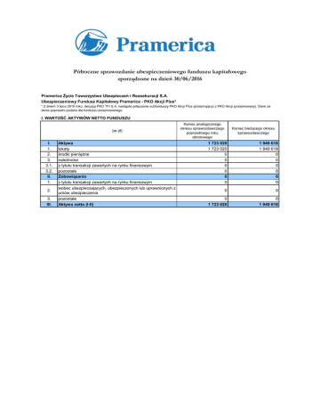 Półroczne sprawozdanie ubezpieczeniowego funduszu kapitałowego sporządzone na dzień 30/06/2016 Pramerica Życie Towarzystwo Ubezpieczeń i Reasekuracji S.A. Ubezpieczeniowy Fundusz Kapitałowy Pramerica - PKO Akcji Plus* * Z dniem 3 lipca 2015 roku, decyzją PKO TFI S.A. nastąpiło połączenie subfunduszy PKO Akcji Plus (przejmujący) z PKO Akcji (przejmowany). Dane za okres poprzedni podano dla funduszu przejmowanego. I. WARTOŚĆ AKTYWÓW NETTO FUNDUSZU (w zł) I. 1. 2. 3. 3.1. 3.2. II. 1. Aktywa lokaty środki pieniężne należności z tytułu transakcji zawartych na rynku finansowym pozostałe Zobowiązania z tytułu transakcji zawartych na rynku finansowym 2. wobec ubezpieczających, ubezpieczonych lub uprawnionych z umów ubezpieczenia 3. III. pozostałe Aktywa netto (I-II) Koniec analogicznego okresu sprawozdawczego poprzedniego roku obrotowego Koniec bieżącego okresu sprawozdawczego 1 723 020 1 723 020 0 0 0 0 0 0 1 949 618 1 949 618 0 0 0 0 0 0 0 0 0 1 723 020 0 1 949 618 Półroczne sprawozdanie ubezpieczeniowego funduszu kapitałowego sporządzone na dzień 30/06/2016 Pramerica Życie Towarzystwo Ubezpieczeń i Reasekuracji S.A. Ubezpieczeniowy Fundusz Kapitałowy Pramerica - PKO Akcji Plus* * Z dniem 3 lipca 2015 roku, decyzją PKO TFI S.A. nastąpiło połączenie subfunduszy PKO Akcji Plus (przejmujący) z PKO Akcji (przejmowany). Dane za okres poprzedni podano dla funduszu przejmowanego. II. ZMIANY WARTOŚCI AKTYWÓW NETTO FUNDUSZU (w zł) Analogiczny okres sprawozdawczy poprzedniego roku obrotowego Bieżący okres sprawozdawczy B. I. 1. 2. 3. II. 1. Aktywa netto funduszu na początek okresu sprawozdawczego Wynik netto z działalności operacyjnej (I-II) Zwiększenia funduszu tytułem składek zwiększających wartość funduszu pozostałe przychody pozostałe zwiększenia Zmniejszenia funduszu tytułem wykupu 2. tytułem wypłat pozostałych świadczeń ubezpieczeniowych 0 0 3. tytułem opłat za ryzyko ubezpieczeniowe oraz innych opłat potrącanych z funduszu 130 557 140 312 A. 1 429 175 1 777 832 260 885 438 755 311 617 0 127 138 177 870 42 057 313 249 524 144 425 950 0 98 194 210 895 65 769 4. tytułem zwrotu składek ubezpieczeniowych 0 0 5. tytułem opłat za zarządzanie funduszem oraz innych opłat tytułem administrowania funduszem 0 0 0 5 256 32 960 0 4 814 -141 462 1 723 020 1 949 618 6. 7. C. D. pozostałe koszty pozostałe zmniejszenia Wynik netto z działalności inwestycyjnej Aktywa netto funduszu na koniec okresu sprawozdawczego III. LICZBA I WARTOŚĆ JEDNOSTEK UCZESTNICTWA FUNDUSZU Pozycja I. 1. 2. II. 1. Liczba jednostek uczestnictwa funduszu: na początek okresu sprawozdawczego na koniec okresu sprawozdawczego Wartość jednostki uczestnictwa funduszu: na początek okresu sprawozdawczego 2. minimalna wartość jednostki uczestnictwa funduszu w okresie sprawozdawczym 3. 4. Analogiczny okres sprawozdawczy poprzedniego roku obrotowego Bieżący okres sprawozdawczy 4 298,6582 4 899,1190 23 647,6711 26 721,7397 332,4700 75,1800 328,6500 68,6800 maksymalna wartość jednostki uczestnictwa funduszu w okresie sprawozdawczym 370,3600 78,2000 na koniec okresu sprawozdawczego 351,7000 72,9600 Półroczne sprawozdanie ubezpieczeniowego funduszu kapitałowego sporządzone na dzień 30/06/2016 Pramerica Życie Towarzystwo Ubezpieczeń i Reasekuracji S.A. Ubezpieczeniowy Fundusz Kapitałowy Pramerica - PKO Akcji Plus* * Z dniem 3 lipca 2015 roku, decyzją PKO TFI S.A. nastąpiło połączenie subfunduszy PKO Akcji Plus (przejmujący) z PKO Akcji (przejmowany). Dane za okres poprzedni podano dla funduszu przejmowanego. IV. ZESTAWIENIE AKTYWÓW NETTO FUNDUSZU 1 I. Lokaty (suma 1-12) Wartość bilansowa (w zł) Udział w aktywach netto funduszu (w %) 2 3 1 949 618 100,00% 1. papiery wartościowe emitowane, poręczone lub gwarantowane przez Skarb Państwa lub organizacje międzynarodowe, których członkiem jest Rzeczpospolita Polska 0 0,00% 2. obligacje emitowane lub poręczone przez jednostki samorządu terytorialnego lub związki jednostek samorządu terytorialnego 0 0,00% 3. 4. 5. inne dłużne papiery wartościowe o stałej stopie dochodu akcje udziały 0 0 0 0,00% 0,00% 0,00% 6. jednostki uczestnictwa i certyfikaty inwestycyjne w funduszach inwestycyjnych 1 949 618 100,00% 7. instrumenty pochodne 0 0,00% 8. 9. 10. 11. 12. II. III. IV. V. 1. 2. 3. inne papiery wartościowe o zmiennej kwocie dochodu pożyczki nieruchomości depozyty bankowe pozostałe lokaty Środki pieniężne Należności Zobowiązania Aktywa netto (w tym) krajowe zagraniczne - państwa UE zagraniczne - państwa poza UE 0 0 0 0 0 0 0 0 1 949 618 1 949 618 0 0 0,00% 0,00% 0,00% 0,00% 0,00% 0,00% 0,00% 0,00% 100,00% 100,00% 0,00% 0,00%