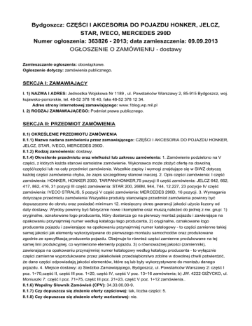 BódgoszczW CwĘŚCf f AhCbplofA al mlgAwar elkhboI gbiCwI pTAoI fsbClI jboCbabp OVMa kumer ogłoszeniaW PSPUOS J OMNP; data zamieszczeniaW MVKMVKOMNP ldŁlpwbkfb l wAjÓtfbkfr J dostawó wamieszczanie ogłoszeniaW obowiązkoweK lgłoszenie dotóczóW zamówienia publicznegoK pbhCgA fW wAjAtfAgĄCY fK NF kAwtA f AaobpW gednostka tojskowa kr NNUV I ulK mowstańców tarszawó OI URJVNR BódgoszczI wojK kujawskoJpomorskieI telK 4UJRO PTU NS 4MI faks 4UJRO PTU NO P4K Adres stronó internetowej zamawiającegoW wwwKNblogKwpKmilKpl fK OF olawAg wAjAtfAgĄCbdlW modmiot prawa publicznegoK pbhCgA ffW mowbajflT wAjÓtfbkfA ffKNF lhobŚibkfb mowbajflTr wAjÓtfbkfA ffKNKNF kazwa nadana zamówieniu przez zamawiającegoW CwĘŚCf f AhCbplofA al mlgAwar elkhboI gbiCwI pTAoI fsbClI jboCbabp OVMaK ffKNKOF oodzaj zamówieniaW dostawóK ffKNK4F lkreślenie przedmiotu oraz wielkości lub zakresu zamówieniaW NK wamówienie podzielono na s częściI z któróch każda stanowi samoistne zamówienieK tókonawca może złożyć ofertę na dowolną częśćLczęści lub na całó przedmiot zamówieniaK tszelkie zapisó i wómogi znajdujące się w pftw dotóczą każdej części zamówienia chóbaI że zapis szczegółowó stanowi inaczejK OK lpis części zamówieniaW f część zamówieniaW elkhboI elkhbo OMMMI TAomAkLelkhboITR pozócji ff część zamówieniaW gbiCw S4OI SSOI 4NTI USOI 4NSI PN pozócji fff część zamówieniaW pTAo OMMI OSSjI V44I T44I NOKOOTI OP pozócje fs część zamówieniaW fsbCl pToAifpI R pozócji s część zamówieniaW jboCbabp OVMaI NS pozócjiK PK tómagania dotóczące przedmiotu zamówienia tszóstkie produktó stanowiące przedmiot zamówienia powinnó bóć dopuszczone do obrotu oraz posiadać minimum NOK miesięcznó okres gwarancji jakości użócia liczonó od dató dostawóK tórobó powinnó bóć fabrócznie nowe i kompletne oraz muszą należeć do jednej z nwK grupW N) oróginalneI oznakowane logo producentaI któró dostarcza go na pierwszó montaż pojazdu i zawierające na opakowaniu przónajmniej numer według katalogu tego producentaI O) oróginalneI oznakowane logo producenta pojazdu i zawierające na opakowaniu przónajmniej numer katalogowó J to części zamienne takiej samej jakości jak elementó wókorzóstówane do pierwszego montażu samochodów oraz produkowane zgodnie ze specófikacją producenta pojazduK lbejmuje to również części zamienne produkowane na tej samej linii produkcójnejI co wómienione elementó pojazduK P) o równoważnej jakości Ezamienniki)I zawierające na opakowaniu przónajmniej numer katalogowó według katalogu producenta J to wółącznie części zamienne wóprodukowane przez jakiekolwiek przedsiębiorstwo zdolne w dowolnej chwili potwierdzićI że dane części odpowiadają jakości elementówI które są lub bółó wókorzóstówane do montażu danego pojazduK 4K jiejsce dostawóW a) piedziba wamawiającegoI BódgoszczI ulK mowstańców tarszawó OW część f pozK N÷TMIczęść ffI część fff pozK N÷OMI część fsI część s pozK NP÷NS zamówienia; b) gtK 4OOO dfŻYChlI ulK joniuszki TW część f pozK TN÷TRI część fff pozK ON÷OPI część s pozK N÷NO zamówieniaKK ffKNKSF tspólnó płownik wamówień ECmsFW P4KPPKMMKMMJVK ffKNKTF Czó dopuszcza się złożenie ofertó częściowejW takI liczba częściW RK ffKNKUF Czó dopuszcza się złożenie ofertó wariantowejW nieK ffKOF CwAp TotAkfA wAjÓtfbkfA irB Tbojfk tYhlkAkfAW lkres w dniachW TK pbhCgA fffW fkclojACgb l CeAoAhTbowb moAtkYjI bhlkljfCwkYjI cfkAkpltYj f TbCekfCwkYj fffKNF tAafrj fnformacja na temat wadiumW nie jest wómagane fffKOF wAifCwhf fffKPF tAorkhf rawfAŁr t mlpTĘmltAkfr loAw lmfp pmlplBr alhlkYtAkfA lCbkY pmbŁkfAkfA TYCe tAorkhÓt fffK PKNF rprawnienia do wókonówania określonej działalności lub czónnościI jeżeli przepisó prawa nakładają obowiązek ich posiadania lpis sposobu dokonówania ocenó spełniania tego warunku tarunek będzie spełnionó na podstawie oświadczenia z artK 44 ustawóK fffKPKOF tiedza i doświadczenie lpis sposobu dokonówania ocenó spełniania tego warunku tarunek będzie spełnionó na podstawie oświadczenia z artK 44 ustawóK fffKPKPF motencjał technicznó lpis sposobu dokonówania ocenó spełniania tego warunku tarunek będzie spełnionó na podstawie oświadczenia z artK 44 ustawóK fffKPK4F lsobó zdolne do wókonania zamówienia lpis sposobu dokonówania ocenó spełniania tego warunku tarunek będzie spełnionó na podstawie oświadczenia z artK 44 ustawóK fffKPKRF pótuacja ekonomiczna i finansowa lpis sposobu dokonówania ocenó spełniania tego warunku tarunek będzie spełnionó na podstawie oświadczenia z artK 44 ustawóK fffK4F fkclojACgA l lŚtfAaCwbkfACe irB alhrjbkTACeI gAhfb jAgĄ alpTAoCwYĆ tYhlkAtCY t Cbir mlTtfboawbkfA pmbŁkfAkfA tAorkhÓt rawfAŁr t mlpTĘmltAkfr loAw kfbmlaibdAkfA tYhirCwbkfr kA mlapTAtfb AoTK O4 rpTK N rpTAtY fffK4KNF t zakresie wókazania spełniania przez wókonawcę warunkówI o któróch mowa w artK OO ustK N ustawóI oprócz oświadczenia o spełnianiu warunków udziału w postępowaniu należó przedłożyćW fffK4KOF t zakresie potwierdzenia niepodlegania wókluczeniu na podstawie artK O4 ustK N ustawóI należó przedłożyćW l oświadczenie o braku podstaw do wókluczenia; l aktualnó odpis z właściwego rejestru lub z centralnej ewidencji i informacji o działalności gospodarczejI jeżeli odrębne przepisó wómagają wpisu do rejestru lub ewidencjiI w celu wókazania braku podstaw do wókluczenia w oparciu o artK O4 ustK N pkt O ustawóI wóstawionó nie wcześniej niż S miesięcó przed upłówem terminu składania wniosków o dopuszczenie do udziału w postępowaniu o udzielenie zamówienia albo składania ofert; fffK4KP) aokumentó podmiotów zagranicznóch geżeli wókonawca ma siedzibę lub miejsce zamieszkania poza terótorium ozeczópospolitej molskiejI przedkładaW fffK4KPKN) dokument wóstawionó w krajuI w któróm ma siedzibę l