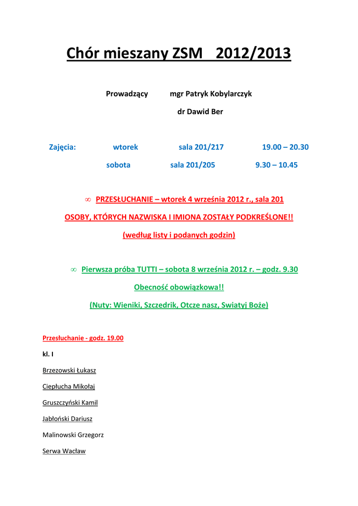 Chór mieszany ZSM 2012/2013 Prowadzący mgr Patryk Kobylarczyk dr Dawid Ber Zajęcia: wtorek sobota sala 201/217 sala 201/205 19.00 – 20.30 9.30 – 10.45 • PRZESŁUCHANIE – wtorek 4 września 2012 r., sala 201 OSOBY, KTÓRYCH NAZWISKA I IMIONA ZOSTAŁY PODKREŚLONE!! (według listy i podanych godzin) • Pierwsza próba TUTTI – sobota 8 września 2012 r. – godz. 9.30 Obecność obowiązkowa!! (Nuty: Wieniki, Szczedrik, Otcze nasz, Swiatyj Boże) Przesłuchanie - godz. 19.00 kl. I Brzezowski Łukasz Ciepłucha Mikołaj Gruszczyński Kamil Jabłoński Dariusz Malinowski Grzegorz Serwa Wacław Szydlarek Kamil Węgrzynek Szymon Wiśniewski Michał Przesłuchanie - godz. 19.20. Kl. II Afifi Marcelina Fischer Michał Jarmuszczak Filip Kosztowny Karolina Krześlak Karolina Morawska Martyna Napora Joanna Nowakowska Lena Siennicka Natalia Wrona Justyna Zawadzka Karolina Przesłuchanie - godz. 19.40 Caban Zuzanna Cieślak Magdalena Cybulska Maria Ibata Betty Janicki Michał Łęczycka Ewelina Modrzejewska Izabela Sikora Paulina Sobczak Sylwia Sobolczyk Marzena Stasiak Magdalena Stefanowska Matylda Przesłuchanie - godz. 20.00 Kl. III Baranowska Amelia Chiżyński Michał Dobroń Agnieszka Dudek Piotr Gonciarz Anna Janczewski Przemysław Jerzak Karolina Jędrzejczak Natalia Koneczny Damian Lewandowska Lidia Lewandowski Jakub Mospinek Anna Nowacki Zbigniew Pawlak Katarzyna Soszyńska Gabriela Walczak Justyna Wysocka Katarzyna Zieliński Maciej Karbowiak Anna Kosiński Michał Skrzypczyk Tomasz Kl. IV Bednarek Adam Biliński Jakub Ciećko Adam Derska Paulina Głowacka Aleksandra Jankowski Michał Murgrabia Agnieszka Pawlak Aleksandra Plisiecka Martyna Ross Małgorzata Sędkiewicz Karolina Sierant Tomasz Sobutkowski Szymon Sus Monika Urbaniak Antoni Kl. V Dziuba Przemysław Gniazdowska Agata Grzegorzewska Zofia Jagodzińska Iga Kaczorowska Maria Lipiec Krzysztof Luciński Jędrzej Orzechowska Julianna Pekasiewicz Joanna Smulik Marcelina Stachowski Aleksander Staroń Weronika Sułek Julia Sus Agnieszka Tkaczuk Paulina Wincek Piotr Winkler Katarzyna Wyrzykowski Damian Kl. VI Gibus Klaudia Jerzykowska Katarzyna Kępińska Joanna Marciniak Hubert Pawelec Jagoda Pijanowski Arkadiusz Powalski Marcin Różycka Anna Wesołek Julia Woźniak Patrycja Wrzesińska Angelika Wasążnik Michał Marjański Piotr Kuźmiński Szymon Burzyński Łukasz Przesłuchanie - godz. 20.20 SM I st. cykl 4-letni Kl. II Bogusławska Anna Chmielewski Jan Gaczkowski Grzegorz Herczyńska Adrianna Joachimiak Karol Kurzawiński Michał Nowacki Maciej Parol Maria Peryt Gabriel Skąpski Jan Kl. III Kręcisz Klaudia Lipski Piotr Pawłowicz Weronika Sadowska India Wojnarowski Adam Kl. IV Kucemba Michał Włodarczyk Mateusz