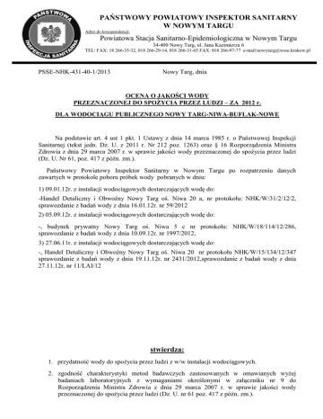 PAŃSTWOWY POWIATOWY INSPEKTOR SANITARNY W NOWYM TARGU Adres do korespondencji: Powiatowa Stacja Sanitarno-Epidemiologiczna w Nowym Targu 34-400 Nowy Targ, ul. Jana Kazimierza 6 TEL/ FAX: 18 266-35-32, 018 266-29-14, 018 266-31-65 FAX: 018 266-97-77 e-mail:[email protected] PSSE-NHK-431-40-1/2013 Nowy Targ, dnia OCENA O JAKOŚCI WODY PRZEZNACZONEJ DO SPOŻYCIA PRZEZ LUDZI – ZA 2012 r. DLA WODOCIĄGU PUBLICZNEGO NOWY TARG-NIWA-BUFLAK-NOWE Na podstawie art. 4 ust 1 pkt. 1 Ustawy z dnia 14 marca 1985 r. o Państwowej Inspekcji Sanitarnej (tekst jedn. Dz. U. z 2011 r. Nr 212 poz. 1263) oraz § 16 Rozporządzenia Ministra Zdrowia z dnia 29 marca 2007 r. w sprawie jakości wody przeznaczonej do spożycia przez ludzi (Dz. U. Nr 61, poz. 417 z późn. zm.). Państwowy Powiatowy Inspektor Sanitarny w Nowym Targu po rozpatrzeniu danych zawartych w protokole poboru próbek wody pobranych w dniu: 1) 09.01.12r. z instalacji wodociągowych dostarczających wodę do: -Handel Detaliczny i Obwoźny Nowy Targ oś. Niwa 20 a, nr protokołu: NHK/W/31/2/12/2, sprawozdanie z badań wody z dnia 16.01.12r. nr 59/2012 2) 05.09.12r. z instalacji wodociągowych dostarczających wodę do: -, budynek prywatny Nowy Targ oś. Niwa 5 c nr protokołu: NHK/W/18/114/12/286, sprawozdanie z badań wody z dnia 10.09.12r. nr 1997/2012, 3) 27.06.11r. z instalacji wodociągowych dostarczających wodę do: -, Handel Detaliczny i Obwoźny Nowy Targ oś. Niwa 20 nr protokołu NHK/W/15/134/12/347 sprawozdanie z badań wody z dnia 19.11.12r. nr 2431/2012,sprawozdanie z badań wody z dnia 27.11.12r. nr 11/LAI/12 stwierdza: 1. przydatność wody do spożycia przez ludzi z w/w instalacji wodociągowych. 2. zgodność charakterystyki metod badawczych zastosowanych w omawianych wyżej badaniach laboratoryjnych z wymaganiami określonymi w załączniku nr 9 do Rozporządzenia Ministra Zdrowia z dnia 29 marca 2007 r. w sprawie jakości wody przeznaczonej do spożycia przez ludzi (Dz. U. nr 61 poz. 417 z późn. zm.). UZASADNIENIE W ramach bieżącego nadzoru sanitarnego przedstawiciele Państwowego Powiatowego Inspektora Sanitarnego w Nowym Targu pobrali próbki wody z w/w instalacji wodociągowych dostarczających wodę przeznaczoną do spożycia przez ludzi, które wykazały zgodność z wymogami Rozporządzenia Ministra Zdrowia z dnia 29 marca 2007 r. w sprawie jakości wody przeznaczonej do spożycia przez ludzi (Dz. U. nr 61 poz.417 z późn. zm.). instalacji wodociągowej Państwowy Powiatowy Inspektor Ocenę o jakości wody z w/w Sanitarny w Nowym Targu wydał celem podejmowania bieżących działań naprawczych oraz poinformowania konsumentów. Państwowy Powiatowy Inspektor Sanitarny w Nowym Targu /+/ mgr inż. Jolanta Bakalarz Otrzymują: 1.Burmistrz Miasta Nowy Targ, ul. Krzywa 1 2.Spółka Wodna „Niwa- Buflak-Nowe” w Nowym Targu oś. Niwa 28 3. a/a.wyk. js tel. 182663165 wew. 303