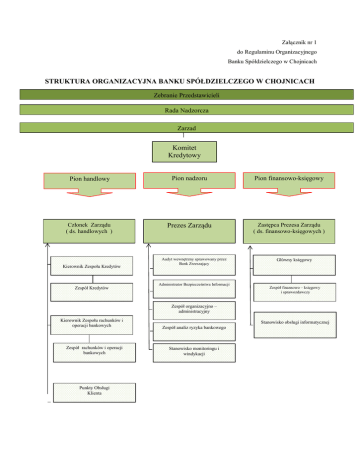 Załącznik nr 1 do Regulaminu Organizacyjnego Banku Spółdzielczego w Chojnicach STRUKTURA ORGANIZACYJNA BANKU SPÓŁDZIELCZEGO W CHOJNICACH SCHEMAT ORGANIZACYJNY SPÓŁDZIELCZEGO W ..... ZebranieBANKU Przedstawicieli Rada Nadzorcza Zarząd Komitet Kredytowy Pion handlowy Pion nadzoru Pion finansowo-księgowy Członek Zarządu ( ds. handlowych ) Prezes Zarządu Z-1 Zastępca Prezesa Zarządu ( ds. finansowo-księgowych ) Kierownik Zespołu Kredytów Zespół Kredytów Audyt wewnętrzny sprawowany przez Bank Zrzeszający Administrator Bezpieczeństwa Informacji Główny księgowy Zespół finansowo – księgowy i sprawozdawczy Zespół organizacyjno – administracyjny Kierownik Zespołu rachunków i operacji bankowych Zespół rachunków i operacji bankowych Punkty Obsługi Klienta Stanowisko obsługi informatycznej Zespół analiz ryzyka bankowego Stanowisko monitoringu i windykacji