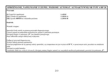 OPRÓśNIANIE, NAPEŁNIANIE I UZUPEŁ. POZIOMU AUTOMAT. AUTOAKTYWNEJ SB TYPU 4 HP 20 Przyrządy [1] Zespół do napełniania [1a] Cylinder do napełniania [2b] Łącznik 4HP20 bez wskaźnika poziomu : (-).0341 : (-).0341-A : (-).0341-B Kontrola Warunki wstępne: Sprawdzić brak usterki za pomocą przyrządu diagnostycznego. Ustawić pojazd na podnośniku pomostowym, pojazd w połoŜeniu poziomym. Dźwignia biegów w połoŜeniu „P”, bez hamulca postojowego. DuŜe odbiorniki energii elektrycznej wyłączone. Podłączyć przyrząd diagnostyczny. Wybrać funkcję pomiaru parametrów. Przed przystąpieniem do tej operacji naleŜy sprawdzić, czy temperatura nie jest wyŜsza od 55 °C, w przeciwnym razie, poczekać na ostudzenie oleju. Nacisnąć na pedał hamulca. Uruchomić silnik (na wolnych obrotach), dźwignię zmiany biegów ustawić we wszystkich moŜliwych połoŜeniach, powrócić do połoŜenia „P”. 213 OPRÓśNIANIE, NAPEŁNIANIE I UZUPEŁ. POZIOMU AUTOMAT. AUTOAKTYWNEJ SB TYPU 4 HP 20 Przy pracującym silniku i temperaturze 55 ± 1 °C, odkręcić korek poziomu (3). Poczekać na osiągnięcie temperatury : 60° ± 1°C 1. moŜliwość: Olej wypływa, poziom jest prawidłowy. Wkręcić korek otworu poziomu oleju (3), dokręcić : 2,5 ± 0,2 2. moŜliwość: Olej nie wypływa. Wkręcić korek otworu poziomu oleju (3). Dolać dodatkowo 0,5 litra oleju (patrz rozdział: napełnianie). Powtórzyć procedurę sprawdzania poziomu oleju. Zamontować część metalową odpowietrznika (2), za pomocą wybijaka ślusarskiego Ø 18 mm i młotka. Przypiąć część plastykową odpowietrznika (2). OpróŜnianie Warunki wstępne: OpróŜnianie naleŜy przeprowadzić na ciepło, w celu usunięcia zanieczyszczeń zawieszonych w oleju. OpróŜniona zostaje tylko część oleju, poniewaŜ nie moŜna całkowicie opróŜnić przekładni hydrokinetycznej. Podczas opróŜniania wypływa około : 3 litry Korek spustowy (1). Dokręcić korek (1) : 4,5 ± 0,4 B2CK0JQC B2CK17KC 214 OPRÓśNIANIE, NAPEŁNIANIE I UZUPEŁ. POZIOMU AUTOMAT. AUTOAKTYWNEJ SB TYPU 4 HP 20 Napełnianie Ustawić pojazd na podnośniku pomostowym. Odsunąć zespół filtra powietrza. WAśNE: Pozostawić podłączony czujnik temperatury powietrza. Zdemontować: Zespół odpowietrznika (2), za pomocą przyrządu [3]. Podnieść pojazd. Wykręcić korek otworu poziomu oleju (3). Nalać nowy olej przez otwór odpowietrznika, aŜ do jego wypłynięcia przez otwór poziomu za pomocą przyrządu [1]. Nacisnąć na pedał hamulca. Uruchomić silnik (na wolnych obrotach), dźwignię zmiany biegów ustawić we wszystkich moŜliwych połoŜeniach, powrócić do połoŜenia „P”. Dolać olej, aŜ do jego wypłynięcia przez otwór poziomu. Zakręcić otwór poziomu. Zatrzymać silnik. WAśNE: Sprawdzić poziom oleju (patrz odpowiednia operacja). B2CK0JPC B2CK0JQC 215