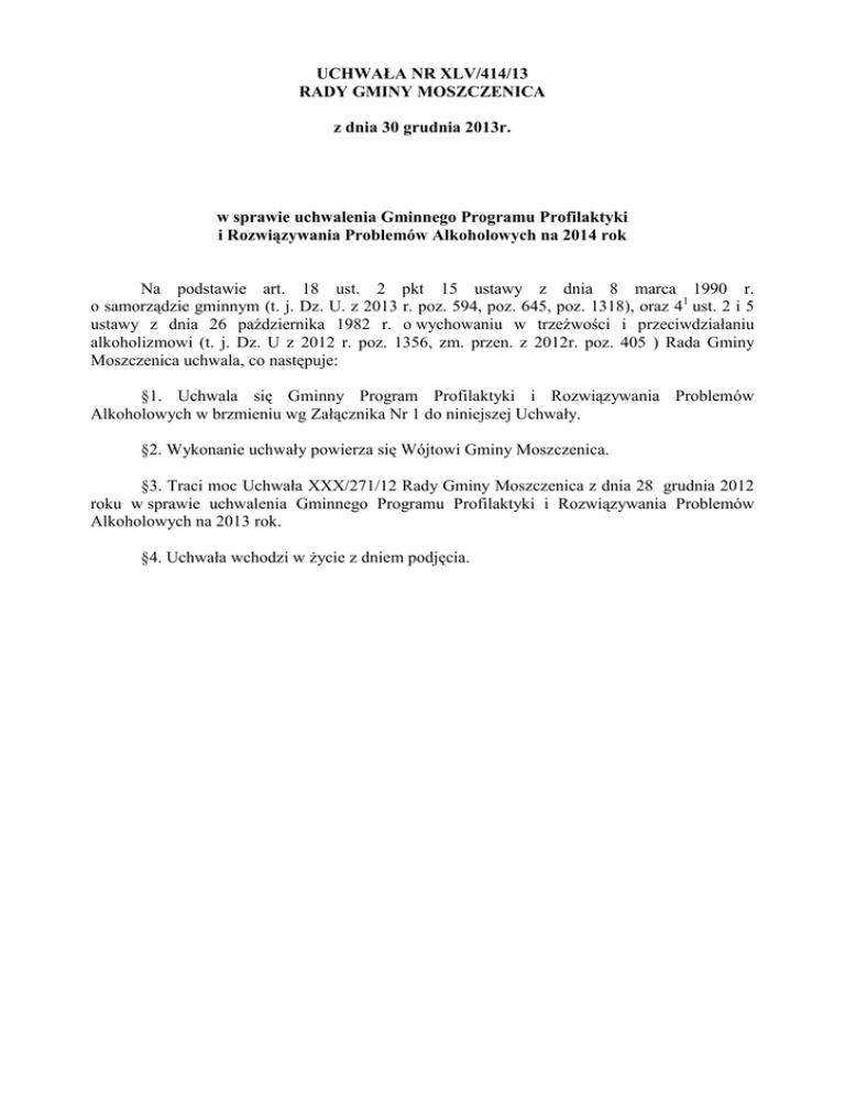UCHWAŁA NR XLV/414/13 RADY GMINY MOSZCZENICA z dnia 30 grudnia 2013r. w sprawie uchwalenia Gminnego Programu Profilaktyki i Rozwiązywania Problemów Alkoholowych na 2014 rok Na podstawie art. 18 ust. 2 pkt 15 ustawy z dnia 8 marca 1990 r. o samorządzie gminnym (t. j. Dz. U. z 2013 r. poz. 594, poz. 645, poz. 1318), oraz 41 ust. 2 i 5 ustawy z dnia 26 października 1982 r. o wychowaniu w trzeźwości i przeciwdziałaniu alkoholizmowi (t. j. Dz. U z 2012 r. poz. 1356, zm. przen. z 2012r. poz. 405 ) Rada Gminy Moszczenica uchwala, co następuje: §1. Uchwala się Gminny Program Profilaktyki i Rozwiązywania Problemów Alkoholowych w brzmieniu wg Załącznika Nr 1 do niniejszej Uchwały. §2. Wykonanie uchwały powierza się Wójtowi Gminy Moszczenica. §3. Traci moc Uchwała XXX/271/12 Rady Gminy Moszczenica z dnia 28 grudnia 2012 roku w sprawie uchwalenia Gminnego Programu Profilaktyki i Rozwiązywania Problemów Alkoholowych na 2013 rok. §4. Uchwała wchodzi w życie z dniem podjęcia. Załącznik Nr 1 do uchwały Nr XLV/414/13 Rady Gminy Moszczenica z dnia 30 grudnia 2013r. GMINNY PROGRAM PROFILAKTYKI I ROZWIĄZYWANIA PROBLEMÓW ALKOHOLOWYCH GMINY MOSZCZENICA NA 2014 ROK 2 §1 Postanowienia ogólne Art. 1.1. Ustawy z dnia 26 października 1982 r. o wychowaniu w trzeźwości i przeciwdziałaniu alkoholizmowi (tekst jednolity Dz. U. z 2007r. Nr 70 poz. 473, Nr 115, poz. 793,Nr 176, poz. 1238, z 2008 r. Nr 227, poz. 1505, z 2009 r. Nr 18,poz. 97, Nr 144, poz.1175, z 2010 r. Nr 47,poz. 278, Nr 127, poz.857, z 2011 Nr 120 poz. 690, Nr 106 poz. 622, Nr 112 poz. 654, Dz. U. z 2012 poz. 1356, zm. przen. z 2012r. poz. 405 ) stanowi, iż „organy administracji rządowej i jednostek samorządu terytorialnego są obowiązane do podejmowania działań zmierzających do ograniczenia spożycia napojów alkoholowych oraz zmiany struktury ich spożywania, inicjowania i wspierania przedsięwzięć mających na celu zmianę obyczajów w zakresie sposobu spożywania tych napojów, działania na rzecz trzeźwości w miejscu pracy, przeciwdziałania powstawaniu i usuwaniu następstw nadużywania alkoholu, a także wspierania działalności w tym zakresie organizacji społecznych i zakładów pracy”. Realizacja zadań, o którym mowa wyżej jest prowadzona w postaci gminnego programu profilaktyki i rozwiązywania problemów alkoholowych, stanowiącego część strategii integracji i polityki społecznej. Należy zwrócić szczególną uwagę, że zadania ukierunkowane na wczesną profilaktykę uzależnień. Gminna Komisja Rozwiązywania Problemów Alkoholowych w Moszczenicy (G K R P A) dokonując diagnozy stanu problemów opracowała Program Profilaktyki i Rozwiązywania Problemów Alkoholowych na 2014 r. Program ten ma na celu: wypracowanie modelu działań ukierunkowaną na rzecz osób uzależnionych i współuzależnionych od alkoholu, działania profilaktyczne obejmujące społeczność lokalną w szczególności profilaktyka wśród dzieci i młodzieży szkolnej, zdiagnozowanie problemów dot. przemocy, opracowanie i realizacja gminnego programu przeciwdziałania przemocy domowej, Podstawowym celem programu jest profilaktyka uzależnień polegająca na zapobieganiu powstawania problemów alkoholowych głównie wśród dzieci i młodzieży oraz stosowaniu środków zaradczych w stosunku do osób nadużywających alkoholu. Realizacja powyższego celu polega przede wszystkim na: 1. Zwiększeniu dostępności pomocy terapeutycznej i rehabilitacyjnej dla osób uzależnionych od alkoholu. 2. Udzielaniu rodzinom, w których występują problemy alkoholowe, pomocy psychospołecznej i prawnej poprzez Punkt Konsultacyjny działający przy Urzędzie Gminy. 3. Prowadzeniu profilaktycznej działalności informacyjnej i edukacyjnej w zakresie rozwiązywania problemów alkoholowych, przede wszystkim wśród dzieci i młodzieży, w tym prowadzenie pozalekcyjnych zajęć sportowych, organizowanie lokalnych imprez z elementami profilaktyki, „Zielonych szkół”, obozów profilaktycznych dla dzieci i młodzieży, organizowanie forum trzeźw ościowego. 4. Wspieranie działalności instytucji, stowarzyszeń służących rozwiązywaniu problemów alkoholowych poprzez finansowanie konkursów, prelekcji, programów profilaktycznych 5. Włączenie się do realizacji ogólnopolskiego programu „ Postaw na rodzinę”. 6. Podejmowanie interwencji w związku z naruszeniem przepisów określonych w art. 131 i 15 ustawy cytowanej powyżej oraz występowanie przed sądem w charakterze oskarżyciela publicznego poprzez wniesienie oskarżenia do sądu I instancji. 7. Wspieranie zatrudnienia socjalnego min. poprzez współuczestnictwo w organizowaniu i finansowaniu Centrów Integracji Społecznej. 3 Jednym z zadań własnych samorządów gminnych realizowanych w ramach gminnego programu profilaktyki i rozwiązywania problemów alkoholowych , określonych w art. 4 1 ust. 1 ustawy z dnia 26 października 1982 r. o wychowaniu w trzeźwości i przeciwdziałaniu alkoholizmowi jest wspieranie zatrudnienia socjalnego poprzez organizowanie i finansowanie centrów integracji społecznej. Zgodnie z art. 3 ust. 2 ustawy z dnia 13 czerwca 2003r. o zatrudnieniu socjalnym (Dz. U z 2003 r. Nr 122, poz. 1143 z późn. zmianami). Centrum integracji Społecznej może być tworzone m.in. z dotacji pochodzącej z dochodów własnych gminy przeznaczonych na realizację gminnego programu profilaktyki i rozwiązywania problemów alkoholowych. Planowane powyższych zadań wiąże się z zadaniami przeciwdziałania przemocy w rodzinie i stanowi wspólny element lokalnej strategii. §2 Ocena podstawowych uwarunkowań powstawania zjawiska alkoholizmu 1. Wysokie bezrobocie utrzymujące się w gminie 2. Niska świadomość społeczna dotycząca zjawiska alkoholizmu, zagrożeń z nim związanych i negatywnego wpływu na zdrowie i życie 3. Brak kultury spożywania alkoholu 4. Społeczna akceptacja picia tłumaczona bardzo często tradycjami narodowymi i ro