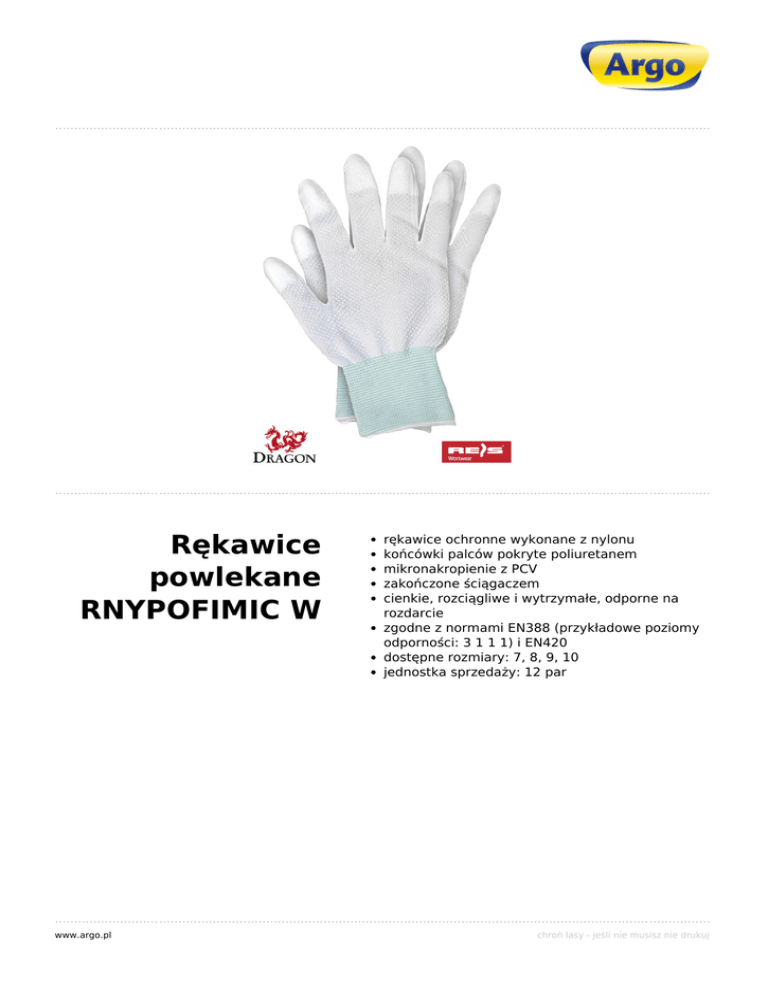 Rękawice powlekane RNYPOFIMIC W www.argo.pl Powered by TCPDF (www.tcpdf.org) rękawice ochronne wykonane z nylonu końcówki palców pokryte poliuretanem mikronakropienie z PCV zakończone ściągaczem cienkie, rozciągliwe i wytrzymałe, odporne na rozdarcie zgodne z normami EN388 (przykładowe poziomy odporności: 3 1 1 1) i EN420 dostępne rozmiary: 7, 8, 9, 10 jednostka sprzedaży: 12 par chroń lasy - jeśli nie musisz nie drukuj
