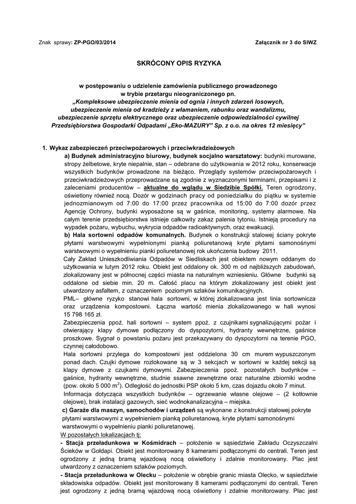 Znak sprawy: ZP-PGO/03/2014 Załącznik nr 3 do SIWZ SKRÓCONY OPIS RYZYKA w postępowaniu o udzielenie zamówienia publicznego prowadzonego w trybie przetargu nieograniczonego pn. „Kompleksowe ubezpieczenie mienia od ognia i innych zdarzeń losowych, ubezpieczenie mienia od kradzieży z włamaniem, rabunku oraz wandalizmu, ubezpieczenie sprzętu elektrycznego oraz ubezpieczenie odpowiedzialności cywilnej Przedsiębiorstwa Gospodarki Odpadami „Eko-MAZURY” Sp. z o.o. na okres 12 miesięcy” 1. Wykaz zabezpieczeń przeciwpożarowych i przeciwkradzieżowych a) Budynek administracyjno biurowy, budynek socjalno warsztatowy: budynki murowane, stropy żelbetowe, kryte niepalnie, stan – odebrane do użytkowania w 2012 roku, konserwacje wszystkich budynków prowadzone na bieżąco. Przeglądy systemów przeciwpożarowych i przeciwkradzieżowych przeprowadzane są zgodnie z wyznaczonymi terminami, przepisami i z zaleceniami producentów – aktualne do wglądu w Siedzibie Spółki. Teren ogrodzony, oświetlony również nocą. Dozór w godzinach pracy od poniedziałku do piątku w systemie jednozmianowym od 7:00 do 17:00 przez pracownika od 15:00 do 7:00 dozór przez Agencję Ochrony, budynki wyposażone są w gaśnice, monitoring, systemy alarmowe. Na całym terenie przedsiębiorstwa istnieje całkowity zakaz palenia tytoniu. Istnieją procedury na wypadek pożaru, wybuchu, wykrycia odpadów radioaktywnych, oraz ewakuacji. b) Hala sortowni odpadów komunalnych. Budynek o konstrukcji stalowej ściany pokryte płytami warstwowymi wypełnionymi pianką poliuretanową kryte płytami samonośnymi warstwowymi o wypełnieniu pianki poliuretanowej rok ukończenia budowy 2011. Cały Zakład Unieszkodliwiania Odpadów w Siedliskach jest obiektem nowym oddanym do użytkowania w lutym 2012 roku. Obiekt jest oddalony ok. 300 m od najbliższych zabudowań, zlokalizowany jest w północnej części miasta na naturalnym wzniesieniu. Główne budynki są oddalone od siebie min. 20 m. Całość placu na którym zlokalizowany jest obiekt jest utwardzony asfaltem, z oznaczeniem poziomym szlaków komunikacyjnych. PML– główne ryzyko stanowi hala sortowni, w której zlokalizowana jest linia sortownicza oraz urządzenia kompostowni. Łączna wartość mienia zlokalizowanego w hali wynosi 15 798 165 zł. Zabezpieczenia ppoż. hali sortowni – system ppoż. z czujnikami sygnalizującymi pożar i otwierający klapy dymowe podłączony do dyspozytorni, hydranty wewnętrzne, gaśnice proszkowe. Sygnał o powstaniu pożaru jest przekazywany do dyspozytorni na terenie PGO, czynnej całodobowo. Hala sortowni przylega do kompostowni jest oddzielona 30 cm murem wypuszczonym ponad dach. Czujki dymowe rozlokowane są w 3 sekcjach w sortowni w każdej sekcji są klapy dymowe z czujkami dymowymi. Zabezpieczenia ppoż. pozostałych budynków – gaśnice, hydranty wewnętrzne, studnie ssawne zewnętrzne oraz naturalne zbiorniki wodne 2 (pow. około 5 000 m ). Odległość do jednostki PSP około 5 km, czas dojazdu około 7 minut. Informacja dotycząca wszystkich budynków – ogrzewanie własne olejowe – (2 kotłownie olejowe), brak instalacji gazowych, sieć wodnokanalizacyjna – miejska. c) Garaże dla maszyn, samochodów i urządzeń są wykonane z konstrukcji stalowej pokryte płytami warstwowymi z wypełnieniem pianką poliuretanową, kryte płytami samonośnymi warstwowymi o wypełnieniu pianki poliuretanowej. W pozostałych lokalizacjach tj: - Stacja przeładunkowa w Kośmidrach – położenie w sąsiedztwie Zakładu Oczyszczalni Ścieków w Gołdapi. Obiekt jest monitorowany 8 kamerami podłączonymi do centrali. Teren jest ogrodzony z jedną bramą wjazdową nocą oświetlony i zdalnie monitorowany. Plac jest utwardzony z oznaczeniem szlaków poziomych. - Stacja przeładunkowa w Olecku – położenie w obrębie granic miasta Olecko, w sąsiedztwie składowiska odpadów. Obiekt jest monitorowany 8 kamerami podłączonymi do centrali. Teren jest ogrodzony z jedną bramą wjazdową nocą oświetlony i zdalnie monitorowany. Plac jest utwardzony z oznaczeniem szlaków poziomych. - Stacja przeładunkowa w Białej Piskiej – położenie w obrębie granic miasta Biała Piska w okolicach parku miejskiego. Obiekt jest monitorowany 8 kamerami podłączonymi do centrali. Teren jest ogrodzony z jedną bramą wjazdową nocą oświetlony i monitorowany przez pracownika ochrony. Plac jest utwardzony z oznaczeniem szlaków poziomych. Do ubezpieczenia ujęto budynki wagowe, wraz zadaszeniem, wykonane w 2011 roku, oddane do użytkowania w kwietniu 2012 roku. Konstrukcja stalowa (rodzaj kontenera) pokrytego płytami warstwowymi z wypełnieniem styropianem. Zadaszenie o konstrukcji stalowej kryte pleksą przezroczystą. Zabezpieczenie przeciwpożarowe: gaśnice i hydranty. Zabezpieczenie przeciw kradzieżowe: monitoring. 2. Informacje dodatkowe do ryzyka OC Przyczyny szkód związane z prowadzoną działalnością są zróżnicowane. Większość może być związana z zimowym utrzymaniem ciągów pieszych oraz jezdni na własnym terenie. Z pracami związanymi z załadunkiem i rozładunkiem zarówno odpadów komunalnych jak i gotowych do sprzedaży surowców wtórnych. Wykonanie prac oczyszczania jezdni i ciągów pieszych w własnym zakresie.