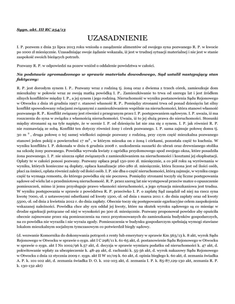 Sygn. akt. III RC 254/13 UZASADNIENIE I. P. pozwem z dnia 31 lipca 2013 roku wniosła o zasądzenie alimentów od swojego syna pozwanego R. P. w kwocie po 1000 zł miesięcznie. Uzasadniając swoje żądanie wskazała, iż jest w trudnej sytuacji materialnej i nie jest w stanie zaspokoić swoich bieżących potrzeb. Pozwany R. P. w odpowiedzi na pozew wniósł o oddalenie powództwa w całości. Na podstawie zgromadzonego w sprawie materiału dowodowego, Sąd ustalił następujący stan faktyczny: R. P. jest dorosłym synem I. P.. Pozwany wraz z rodziną tj. żoną oraz z dwiema z trzech córek, zamieszkuje dom mieszkalny w połowie wraz ze swoją matką powódką I. P.. Zamieszkiwanie to trwa od szeregu lat i jest źródłem silnych konfliktów między I. P., a jej synem i jego rodziną. Nieruchomość w wyniku postanowienia Sądu Rejonowego w Otwocku z dnia 16 grudnia 1997 r. stanowi własność R. P.. Pomiędzy stronami trwa od ponad dziesięciu lat silny konflikt spowodowany relacjami związanymi z zamieszkiwaniem wspólnie na nieruchomości, która stanowi własność pozwanego R. P.. Konflikt związany jest również z przegranym przez I. P. postępowaniem sądowym. I. P. uważa, iż ma roszczenia do syna w związku z własnością nieruchomości. Uważa, iż to jej służą prawa do nieruchomości. Stosunki między stronami są na tyle napięte, że w ocenie I. P. od dziesięciu lat nie zna się z synem. I. P. jak również R. P. nie rozmawiają ze sobą. Konflikt ten dotyczy również żony i córek pozwanego. I. P. sama zajmuje połowę domu tj. 30 m 2 , druga połowę o tej samej wielkości zajmuje pozwany z rodziną, przy czym część mieszkalna pozwanego stanowi jeden pokój o powierzchni 17 m2 , w którym mieszka on z żoną i córkami, pozostała część to kuchnia. W wyniku konfliktu I. P. dokonała w dniu 6 grudnia 2008 r. uszkodzenia suszarki do ubrań oraz drewnianego stolika na szkodę żony pozwanego. Powódka wyrwała kwiaty z ogródka przydomowego spod swojego okna, które posadziła żona pozwanego. I. P. nie uiszcza opłat związanych z zamieszkiwaniem na nieruchomości i kosztami jej eksploatacji. Opłaty te w całości ponosi pozwany. Pozwany opłaca prąd 150-200 zł. miesięcznie, a co pół roku są wyrównania w wyniku, których konieczne są dopłaty, opłaca kanalizacje 260-280 zł. miesięcznie, która liczona jest od ilości osób, płaci za śmieci, opłata również zależy od ilości osób. I. P. nie dba o część nieruchomości, którą zajmuje, w wyniku czego część ta wymaga remontu, do którego powódka się nie poczuwa. Pomiędzy stronami toczyły się liczne postępowania sądowe od wielu lat o przedmiotową nieruchomość. R. P. przez szereg lat nie występował przeciw matce o opuszczenie pomieszczeń, mimo iż jemu przysługuje prawo własności nieruchomości, a jego sytuacja mieszkaniowa jest trudna. W wyniku postępowania w sprawie z powództwa R. P. przeciwko I. P. o zapłatę Sąd zasądził od niej na rzecz syna kwotę 7000,-zł. z ustawowymi odsetkami od kwoty 1500,-zł. od dnia 1 marca 2011 r. do dnia zapłaty oraz od kwoty 5500,-zł. od dnia 2 kwietnia 2012 r. do dnia zapłaty. Obecnie toczy się postępowanie egzekucyjne celem zaspokojenia wskazanej należności. Powódka chce aby syn oddał jej kwoty, które na skutek wyroku sądowego są co miesiąc w drodze egzekucji potrącane od niej w wysokości po 300 zł. miesięcznie. Pozwany proponował powódce aby opuściła obecnie zajmowane przez nią pomieszczenia na rzecz przystosowanych do zamieszkania budynków gospodarczych, na co powódka nie wyraziła i nie wyraża zgody. Pomieszczenia w budynku gospodarczym spełniają wymogi stawiane lokalom mieszkalnym socjalnym tymczasowym co potwierdził biegły sądowy. (d. wezwanie Komornika do dokonywania potrąceń z renty lub emerytury w sprawie Km 563/13 k. 8 akt, wyrok Sądu Rejonowego w Otwocku w sprawie o sygn. akt I C 298/11 k. 61-65 akt, d. postanowienie Sądu Rejonowego w Otwocku w sprawie o sygn. akt I Ns 1002/96 k.57 akt, d. decyzja w sprawie wymiaru podatku od nieruchomości k. 47 akt, d. pokwitowanie wpłaty za ubezpieczenie k. 48-49 akt, d. rachunki k. 55-56 akt, d. wyrok nakazowy Sądu Rejonowego w Otwocku z dnia 12 stycznia 2009 r. sygn. akt II W 10/09 k. 60 akt, d. opinia biegłego k. 60 akt, d. zeznania świadka A. P. k. 101-102 akt, d. zeznania świadka D. O. k. 102-103 akt, d. zeznania I. P. k. 85-87,129-130 akt, zeznania R. P. k. 130-132 akt) I. P. otrzymuje emeryturę w kwocie netto 960, 08 zł, z czego dokonywane są potrącenia komornicze. Nadto powódce przysługuje dodatek pielęgnacyjny w kwocie 206, 76 zł. Powódka wydaje na wyżywienie, leki. Dużo czasu spełnia poza domem, odwiedza swoje pozostałe dzieci, koleżanki. (d. potwierdzenie wypłaty k. 4 akt, zeznania I. P. k. 85-87, 129-130 akt, d. zaświadczenie z ZUS k. 119 akt) Oprócz pozwanego R. P., powódka posiada jeszcze dwójkę dorosłych dzieci które prowadzą oddzielne gospodarstwa domowe i mają swoje rodziny. I. P. ma dobre relacje z pozostałymi dziećmi córką E. R. i synem B. P.. E. R. pracuje w sklepie, jej mąż jest listonoszem, a syn pracuje. Jej warunki mieszkaniowe są porównywalne do warunków brata R. P.. B. P. pracuje w warsztacie blacharskim, ma mieszkanie. I. P. nie występuje z roszczeniami wobec swoich dzieci E. R. i B. P.. (d. zeznania I. P. k. 85-87,129-130 akt, zeznania E. R. k.128-129 akt). R. P. zatrudniony był jako listonosz Poczty Polskiej. Pozwany doznał wypadku w pracy. W wyniku wypadku przeszedł dwie operację na kręgosłup i został zaliczony do lekkiego stopnia niepełnosprawności na okres do dnia 30 listopada 2017 r.. Pozwany nadal wymaga leczenia i rehabilitacji z czym związane jest ponoszenie ich kosztów. Z uwagi na długi czas oczekiwania na zabiegi rehabilitacyjne, konieczne są wizyty odpłatne, których koszt jednorazowy to około 100 zł. na co pozwanego nie stać. R. P. z uwagi na stan kręgos