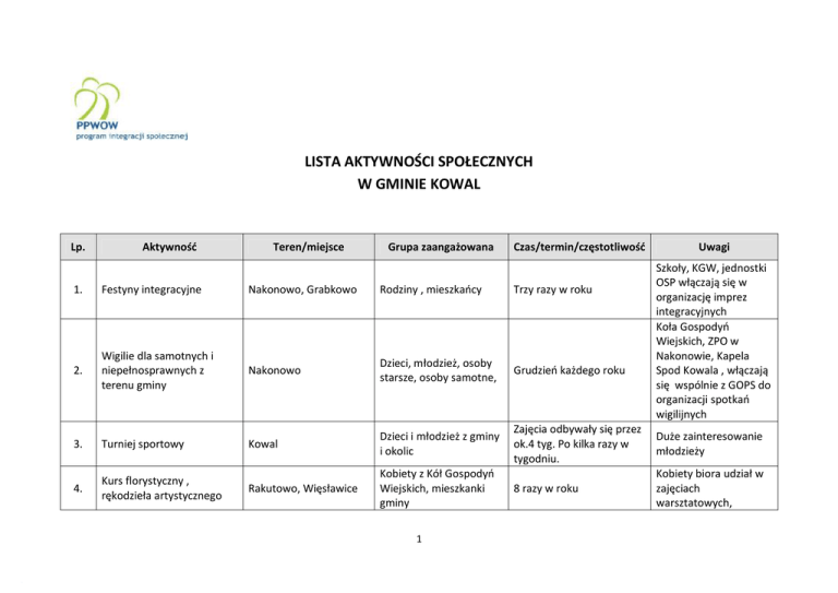 LISTA AKTYWNOŚCI SPOŁECZNYCH W GMINIE KOWAL Lp. Aktywność Teren/miejsce Grupa zaangażowana Czas/termin/częstotliwość Uwagi Szkoły, KGW, jednostki OSP włączają się w organizację imprez integracyjnych Koła Gospodyń Wiejskich, ZPO w Nakonowie, Kapela Spod Kowala , włączają się wspólnie z GOPS do organizacji spotkań wigilijnych 1. Festyny integracyjne Nakonowo, Grabkowo Rodziny , mieszkańcy Trzy razy w roku 2. Wigilie dla samotnych i niepełnosprawnych z terenu gminy Nakonowo Dzieci, młodzież, osoby starsze, osoby samotne, Grudzień każdego roku Kowal Dzieci i młodzież z gminy i okolic Zajęcia odbywały się przez ok.4 tyg. Po kilka razy w tygodniu. Duże zainteresowanie młodzieży Rakutowo, Więsławice Kobiety z Kół Gospodyń Wiejskich, mieszkanki gminy 8 razy w roku Kobiety biora udział w zajęciach warsztatowych, 3. Turniej sportowy 4. Kurs florystyczny , rękodzieła artystycznego 1 5. Organizacja wypoczynku zimowego dla dzieci Nakonowo Dzieci i młodzież Luty 2009 6. Poznajemy kulturę regionu Grabkowo Dzieci, rodziny Luty 2009 7. Zajęcia integracyjne – Baw się z nami podczas ferii Więsławice Dzieci, rodziny Luty 2009 8. Zajęcia sportowo – rekreacyjne Grabkowo Dzieci i młodzież Luty 2009 2 aktywnie uczestniczą w kursie. Dzieci i młodzież ze szkoły w Nakonowie aktywnie uczestniczyły w zajęciach zorganizowanych podczas ferii zimowych w szkole Dzieci wraz z rodzinami uczestniczyli w zajęciach organizowanych podczas ferii w Grabkowie Zajęcia organizowane w SP Więsławice cieszyły się ogromnym zainteresowaniem. W ramach zajęć odbyła się również wycieczka dla dzieci. Zajęcia odbywały się w Gimnazjum Publicznym w Grabkowie, dzieci i młodzież codziennie przygotowywała się do turniejów sportowych które odbyły się na zakończenie ferii 9. Zajęcia socjoterapeutyczne dla rodzin dysfunkcyjnych z terenu gminy Kowal UG Kowal Osoby uzależnione i współuzależnione 10. Zajęcia dla dzieci pod hasłem wyrównujemy szanse SP Grabkowo Dzieci, młodzież, rodziny 11. Kultura i sztuka łączy pokolenia ZPO w Nakonowie Dzieci, rodziny, osoby starsze 3 Osoby uzależnione i współuzaleznione z terenu gminy Kowal spotykały się na rozmowach Raz w tygodniu przez 8 indywidualnych ze miesięcy specjalistami. Spotkania były otwarte dla wszystkich osób wykazujących w nich chęć udziału. W SP w Grabkowie odbywały się zajęcia pozalekcyjne dla dzieci, wycieczki, spotkania integracyjne, obozy, rajdy rowerowe. Kilka razy w tygodniu przez Zajęcia będą ok. 2 miesiące kontynuowane od nowego roku 2010 Nauczyciele biorący udział w zajęciach pracowali jako wolontariusze. W ramach zajęć pozalekcyjnych dzieci Zajęcia odbywały się w miały organizowane miesiącu czerwcu, kilka wycieczki, spotkania z razy w tygodniu ciekawymi osobowościami. 12. Akademia Harcerska Gimnazjum Grabkowo Młodzież i dzieci czerwiec 13. Wakacje w Jarosławcu Jarosławiec Dzieci i młodzież z rodzin potrzebujących wsparcia lipiec 14. Jesteśmy razem w Gminie Kowal Teren gminy Kowal Usługa jest realizowana od Dzieci, młodzież, rodziny, lipca 2009, średnio raz w osoby starsze miesiącu 4 Zajęcia będą kontynuowane od początku roku 2010 Organizowane były wyjazdy grup harcerskich, biwaki. Zajęcia będą kontynuowane w 2010 roku Dzieci z rodzin objętych pomocą społeczną miały szansę wyjechać na dwu tygodniowe wakacje do Jarosławca. Podczas kolonii oprócz zabaw i wycieczek, dzieci miały również zajęcia ze specjalistami którzy rozmawiali z nimi na temat przemocy w rodzinie i problemów z uzależnieniami Zadanie to polega na integracji między pokoleniowej. GOPS integrując się ze społecznością lokalną organizuje szereg spotkań, w których udział biorą kobiety z KGW, członkowie OSP, osoby starsze jak również dzieci. Organizowane są nauki gotowania dla dzieci, przygotowywane są tradycyjne potrawy kujawskie, które degustowane są np. podczas festynów. Kobiety szyją stroje kujawskie itp. 15. Popularyzacja dorobku orkiestry dętej z Grabkowa Grabkowo, Trójmiasto Członkowie orkiestry dętej 5 Lipiec 2009 W remizie OSP Grabkowo odbywały się wieczorki muzyczne. Miało to na celu zachęcenie dzieci i młodzieży do nauki grania na instrumentach dętych. Dla członków orkiestry została zorganizowana wycieczka do Trójmiasta