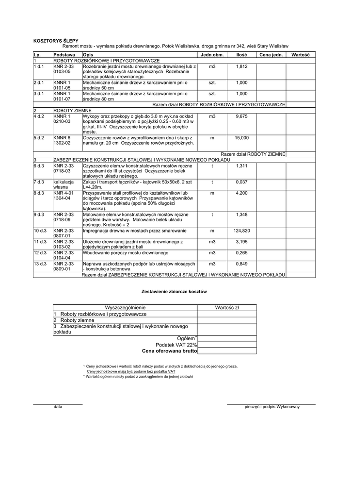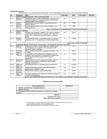 KOSZTORYS ŚLEPY Remont mostu - wymiana pokładu drewnianego. Potok Wielisławka, droga gminna nr 342, wieś Stary Wielisław Lp. 1 1 d.1 2 d.1 3 d.1 2 4 d.2 5 d.2 3 6 d.3 7 d.3 8 d.3 9 d.3 10 d.3 11 d.3 12 d.3 13 d.3 Podstawa Opis Jedn.obm. Ilość Cena jedn. ROBOTY ROZBIÓRKOWE I PRZYGOTOWAWCZE KNR 2-33 Rozebranie jezdni mostu drewnianego drewnianej lub z m3 1,812 0103-05 pokładów kolejowych staroużytecznych Rozebranie starego pokładu drewnianego. KNNR 1 Mechaniczne ścinanie drzew z karczowaniem pni o szt. 1,000 0101-05 średnicy 50 cm KNNR 1 Mechaniczne ścinanie drzew z karczowaniem pni o szt. 1,000 0101-07 średnicy 80 cm Razem dział ROBOTY ROZBIÓRKOWE I PRZYGOTOWAWCZE ROBOTY ZIEMNE KNNR 1 Wykopy oraz przekopy o głęb.do 3.0 m wyk.na odkład m3 9,675 0210-03 koparkami podsiębiernymi o poj.łyżki 0.25 - 0.60 m3 w gr.kat. III-IV Oczyszczenie koryta potoku w obrębie mostu. KNNR 6 Oczyszczenie rowów z wyprofilowaniem dna i skarp z m 15,000 1302-02 namułu gr. 20 cm Oczyszczenie rowów przydrożnych. Wartość Razem dział ROBOTY ZIEMNE ZABEZPIECZENIE KONSTRUKCJI STALOWEJ I WYKONANIE NOWEGO POKŁADU KNR 2-33 Czyszczenie elem.w konstr.stalowych mostów ręczne t 1,311 0718-03 szczotkami do III st.czystości Oczyszczenie belek stalowych układu nośnego. kalkulacja Zakup i transport łączników - kątownik 50x50x6, 2 szt t 0,037 własna L=4,20m. KNR 4-01 Przyspawanie stali profilowej do kształtownikow lub m 4,200 1304-04 ściągów i tarcz oporowych Przyspawanie kątowników do mocowania pokładu (spoina 50% długości kątownika). KNR 2-33 Malowanie elem.w konstr.stalowych mostów ręczne t 1,348 0718-09 pędzlem dwie warstwy. Malowanie belek układu nośnego. Krotność = 2 KNR 2-33 Impregnacja drewna w mostach przez smarowanie m 124,820 0807-01 KNR 2-33 Ułożenie drewnianej jezdni mostu drewnianego z m3 3,195 0103-02 pojedyńczym pokładem z bali KNR 2-33 Wbudowanie poręczy mostu drewnianego m3 0,265 0104-04 KNR 2-33 Naprawa uszkodzonych podpór lub ustrojów niosących m3 0,849 0809-01 - konstrukcja betonowa Razem dział ZABEZPIECZENIE KONSTRUKCJI STALOWEJ I WYKONANIE NOWEGO POKŁADU Zestawienie zbiorcze kosztów Wyszczególnienie 1 Roboty rozbiórkowe i przygotowawcze 2 Roboty ziemne 3 Zabezpieczenie konstrukcji stalowej i wykonanie nowego pokładu Ogółem** Podatek VAT 22% Cena oferowana brutto Wartość zł Ceny jednostkowe i wartość robót należy podać w złotych z dokładnością do jednego grosza. Ceny jednostkowe mają być podane bez podatku VAT **) Wartość ogółem należy podać z zaokrągleniem do jednej złotówki *) data pieczęć i podpis Wykonawcy