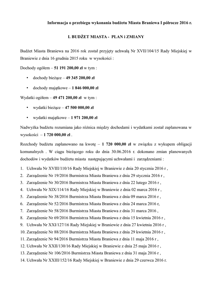 Informacja o przebiegu wykonania budżetu Miasta Braniewa I półrocze 2016 r. I. BUDŻET MIASTA - PLAN i ZMIANY Budżet Miasta Braniewa na 2016 rok został przyjęty uchwałą Nr XVII/104/15 Rady Miejskiej w Braniewie z dnia 16 grudnia 2015 roku w wysokości : Dochody ogółem – 51 191 200,00 zł w tym : • dochody bieżące – 49 345 200,00 zł • dochody majątkowe – 1 846 000,00 zł Wydatki ogółem – 49 471 200,00 zł w tym : • wydatki bieżące – 47 500 000,00 zł • wydatki majątkowe – 1 971 200,00 zł Nadwyżka budżetu rozumiana jako różnica między dochodami i wydatkami został zaplanowana w wysokości – 1 720 000,00 zł . Rozchody budżetu zaplanowano na kwotę – 1 720 000,00 zł w związku z wykupem obligacji komunalnych . W ciągu bieżącego roku do dnia 30.06.2016 r. dokonano zmian planowanych dochodów i wydatków budżetu miasta następującymi uchwałami i zarządzeniami : 1. Uchwała Nr XVIII/110/16 Rady Miejskiej w Braniewie z dnia 20 stycznia 2016 r , 2. Zarządzenie Nr 19/2016 Burmistrza Miasta Braniewa z dnia 29 stycznia 2016 r , 3. Zarządzenie Nr 30/2016 Burmistrza Miasta Braniewa z dnia 22 lutego 2016 r , 4. Uchwała Nr XIX/114/16 Rady Miejskiej w Braniewie z dnia 02 marca 2016 r , 5. Zarządzenie Nr 38/2016 Burmistrza Miasta Braniewa z dnia 09 marca 2016 r , 6. Zarządzenie Nr 52/2016 Burmistrza Miasta Braniewa z dnia 24 marca 2016 r, 7. Zarządzenie Nr 58/2016 Burmistrza Miasta Braniewa z dnia 31 marca 2016 , 8. Zarządzenie Nr 69/2016 Burmistrza Miasta Braniewa z dnia 15 kwietnia 2016 r , 9. Uchwała Nr XXI/127/16 Rady Miejskiej w Braniewie z dnia 27 kwietnia 2016 r , 10. Zarządzenie Nr 88/2016 Burmistrza Miasta Braniewa z dnia 29 kwietnia 2016 r , 11. Zarządzenie Nr 94/2016 Burmistrza Miasta Braniewa z dnia 11 maja 2016 r , 12. Uchwała Nr XXII/130/16 Rady Miejskiej w Braniewie z dnia 25 maja 2016 r , 13. Zarządzenie Nr 106/2016 Burmistrza Miasta Braniewa z dnia 31 maja 2016 r , 14. Uchwała Nr XXIII/152/16 Rady Miejskiej w Braniewie z dnia 29 czerwca 2016 r. Łącznie do dnia 30.06.2016 r. dokonano zmian w dochodach oraz wydatkach polegających na : Dochody • zmniejszenia na kwotę 8 227 005,00 zł , • zwiększenia na kwotę 15 559 332,05 zł . Wydatki • zmniejszenia na kwotę 9 640 824,00 zł , • zwiększenia na kwotę 19 873 151,05 zł . W wyniku dokonanych zmian plan budżetu Miasta Braniewa na dzień 30 czerwiec 2016 r. przedstawiał się następująco : Dochody ogółem – 58 523 527,05 zł w tym: • dochody bieżące – 56 503 291,05 zł • dochody majątkowe – 2 020 236,00 zł Wydatki ogółem – 59 703 527,05 zł w tym: • wydatki bieżące – 54 930 591,05 zł • wydatki majątkowe – 4 772 936,00 zł Deficyt budżetu w kwocie 1 180 000,00 zł , który zostanie sfinansowany przychodami pochodzącymi z wolnych środków , jako nadwyżki środków pieniężnych na rachunku bieżącym budżetu gminy , wynikających z rozliczeń wyemitowanych papierów wartościowych , kredytów i pożyczek . Przychody budżetu w wysokości 2 900 000,00 zł z tytułu wolnych środków , jako nadwyżki środków pieniężnych na rachunku bieżącym budżetu gminy , wynikających z rozliczeń wyemitowanych papierów wartościowych , kredytów i pożyczek . Zmiany planu w poszczególnych działach klasyfikacji budżetowej przedstawiają poniższe tabele: Zmiany wielkości planu dochodów budżetu według działów do dnia 30.06.12016 r. (w złotych ) Dział Nazwa 010 Rolnictwo i łowiectwo 0,00 6 669,48 6 669,48 600 Transport i Łącznosć 0,00 5 406,53 5 406,53 700 Gospodarka mieszkaniowa 2 725 818,00 2 725 818,00 0,00 710 Działalność usługowa 0,00 18 000,00 18 000,00 750 Administracja publiczna 250 187,00 249 187,00 -1 000,00 3 424,00 14 848,00 11 424,00 751 Urzędy naczelnych organów władzy państwowej, kontroli i ochrony prawa oraz sądownictwa 754 Bezpieczeństwo publiczne i ochrona przeciwpożarowa 18 000,00 2 500,00 -15 500,00 Dochody od osób prawnych, od osób fizycznych i od innych jednostek nie posiadających osobowości prawnej oraz wydatki związane z ich poborem 20 751 299,00 20 816 714,00 65 415,00 758 Różne rozliczenia 15 590 317,00 15 184 046,00 -406 271,00 801 Oświata i wychowanie 1 391 946,00 1 634 403,04 242 457,04 852 Pomoc społeczna 7 653 442,00 14 783 355,00 7 129 913,00 853 Pozostałe zadania w zakresie polityki społecznej 0,00 186 167,00 186 167,00 854 Edukacyjna opieka wychowawcza 0,00 61 946,00 61 946,00 900 Gospodarka komunalna i ochrona środowiska 2 156 000,00 2 173 700,00 17 700,00 921 Kultura i ochrona dziedzictwa narodowego 0,00 10 000,00 10 000,00 925 Ogrody botaniczne i zoologiczne oraz naturalne obszary i obiekty chronionej przyrody 9 500,00 9 500,00 0,00 926 Kultura fizyczna 641 267,00 641 267,00 0,00 51 191 200,00 58 523 527,05 756 Razem Plan według uchwały budżetowej Plan budżetu na Zmiana 30.06.2016 r. +/- 7 332 327,05 Zmiany wielkości planu wydatków budżetu według działów do dnia 30.06.2016 r. ( w złotych ) Dział Nazwa 010 Rolnictwo i łowiectwo 600 Transport i łączność 630 Turystyka 700 Gospodarka mieszkaniowa 710 Działalność usługowa 750 Administracja publiczna 751 Urzędy naczelnych organów władzy państwowej, kontroli i ochrony prawa oraz sądownictwa 754 Plan według uchwały budżetowej Plan budżetu na 30.06.2016 r. Zmiana +/- 447,00 7 116,48 6 669,48 497 540,00 3 329 540,00 2 832 000,00 37 900,00 37 900,00 0,00 577 369,33 863 869,33 286 500,00 97 578,40 122 578,40 25 000,00 4 751 511,98 4 808 691,98 57 180,00 3 424,00 14 848,00 11 424,00 Bezpieczeństwo publiczne i ochrona przeciwpożarowa 404 979,00 229 206,00 -175 773,00 757 Obsługa długu publicznego 495 000,00 495 000,00 0,00 758 Różne rozliczenia 370 000,00 232 700,00 -137 300,00 801 Oświata i wychowanie 20 550 733,00 20 514 033,04 -36 699,96 851 Ochrona zdrowia 265 000,00 265 000,00 0,00 852 Pomoc społeczna 11 862 356,00 18 992 269,00 7 129 913,00 853 Pozostałe zadania w zakresie polit