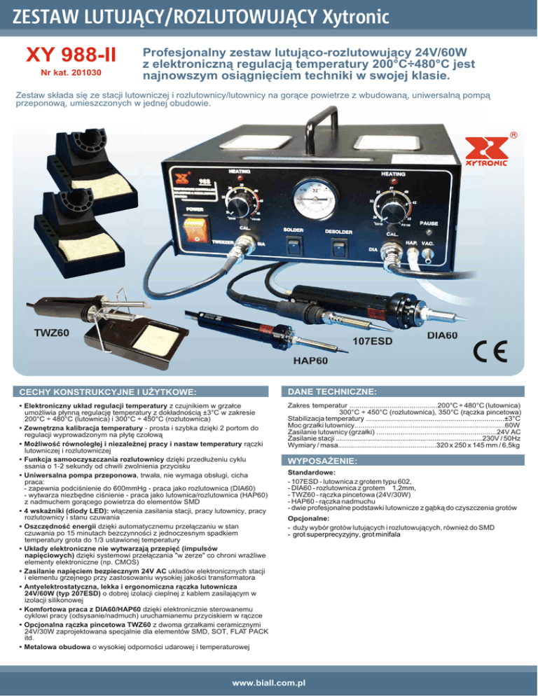 ZESTAW LUTUJ¥CY/ROZLUTOWUJ¥CY Xytronic XY 988-II Nr kat. 201030 Profesjonalny zestaw lutuj¹co-rozlutowuj¹cy 24V/60W z elektroniczn¹ regulacj¹ temperatury 200°C÷480°C jest najnowszym osi¹gniêciem techniki w swojej klasie. Zestaw sk³ada siê ze stacji lutowniczej i rozlutownicy/lutownicy na gor¹ce powietrze z wbudowan¹, uniwersaln¹ pomp¹ przeponow¹, umieszczonych w jednej obudowie. R TWZ60 107ESD DIA60 HAP60 CECHY KONSTRUKCYJNE I U¯YTKOWE: DANE TECHNICZNE: • Elektroniczny uk³ad regulacji temperatury z czujnikiem w grza³ce umo¿liwia p³ynn¹ regulacjê temperatury z dok³adnoœci¹ ±3°C w zakresie 200°C ÷ 480°C (lutownica) i 300°C ÷ 450°C (rozlutownica) • Zewnêtrzna kalibracja temperatury - prosta i szybka dziêki 2 portom do regulacji wyprowadzonym na p³ytê czo³ow¹ • Mo¿liwoœæ równoleg³ej i niezale¿nej pracy i nastaw temperatury r¹czki lutowniczej i rozlutowniczej • Funkcja samooczyszczania rozlutownicy dziêki przed³u¿eniu cyklu ssania o 1-2 sekundy od chwili zwolnienia przycisku • Uniwersalna pompa przeponowa, trwa³a, nie wymaga obs³ugi, cicha praca: - zapewnia podciœnienie do 600mmHg - praca jako rozlutownica (DIA60) - wytwarza niezbêdne ciœnienie - praca jako lutownica/rozlutownica (HAP60) z nadmuchem gor¹cego powietrza do elementów SMD • 4 wskaŸniki (diody LED): w³¹czenia zasilania stacji, pracy lutownicy, pracy rozlutownicy i stanu czuwania • Oszczêdnoœæ energii dziêki automatycznemu prze³¹czaniu w stan czuwania po 15 minutach bezczynnoœci z jednoczesnym spadkiem temperatury grota do 1/3 ustawionej temperatury • Uk³ady elektroniczne nie wytwarzaj¹ przepiêæ (impulsów napiêciowych) dziêki systemowi prze³¹czania "w zerze" co chroni wra¿liwe elementy elektroniczne (np. CMOS) • Zasilanie napiêciem bezpiecznym 24V AC uk³adów elektronicznych stacji i elementu grzejnego przy zastosowaniu wysokiej jakoœci transformatora • Antyelektrostatyczna, lekka i ergonomiczna r¹czka lutownicza 24V/60W (typ 207ESD) o dobrej izolacji cieplnej z kablem zasilaj¹cym w izolacji silikonowej • Komfortowa praca z DIA60/HAP60 dziêki elektronicznie sterowanemu cyklowi pracy (odsysanie/nadmuch) uruchamianemu przyciskiem w r¹czce • Opcjonalna r¹czka pincetowa TWZ60 z dwoma grza³kami ceramicznymi 24V/30W zaprojektowana specjalnie dla elementów SMD, SOT, FLAT PACK itd. • Metalowa obudowa o wysokiej odpornoœci udarowej i temperaturowej Zakres temperatur ............................................200°C ÷ 480°C (lutownica) 300°C ÷ 450°C (rozlutownica), 350°C (r¹czka pincetowa) Stabilizacja temperatury .....................................................................±3°C Moc grza³ki lutownicy...........................................................................60W Zasilanie lutownicy (grza³ki) ............................................................24V AC Zasilanie stacji .........................................................................230V / 50Hz Wymiary / masa.................................................320 x 250 x 145 mm / 6,5kg WYPOSA¯ENIE: Standardowe: - 107ESD - lutownica z grotem typu 602, - DIA60 - rozlutownica z grotem Æ1,2mm, - TWZ60 - r¹czka pincetowa (24V/30W) - HAP60 - r¹czka nadmuchu - dwie profesjonalne podstawki lutownicze z g¹bk¹ do czyszczenia grotów Opcjonalne: - du¿y wybór grotów lutuj¹cych i rozlutowuj¹cych, równie¿ do SMD - grot superprecyzyjny, grot minifala www.biall.com.pl