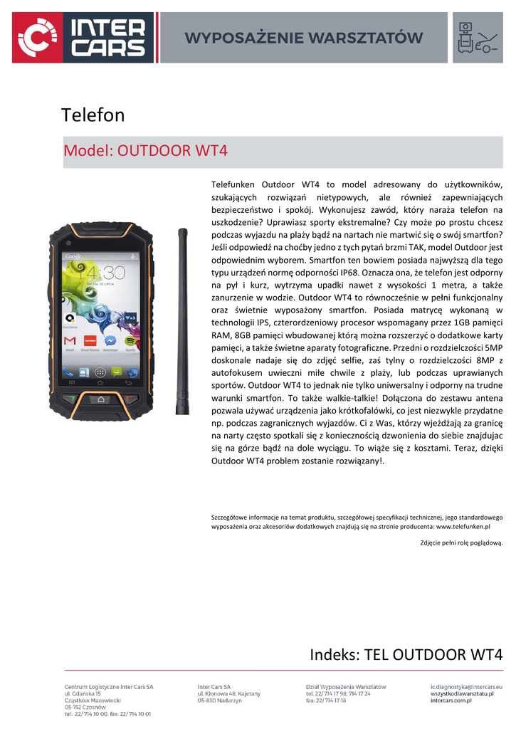 Telefon Model: OUTDOOR WT4 Telefunken Outdoor WT4 to model adresowany do użytkowników, szukających rozwiązań nietypowych, ale również zapewniających bezpieczeństwo i spokój. Wykonujesz zawód, który naraża telefon na uszkodzenie? Uprawiasz sporty ekstremalne? Czy może po prostu chcesz podczas wyjazdu na plaży bądź na nartach nie martwić się o swój smartfon? Jeśli odpowiedź na choćby jedno z tych pytań brzmi TAK, model Outdoor jest odpowiednim wyborem. Smartfon ten bowiem posiada najwyższą dla tego typu urządzeń normę odporności IP68. Oznacza ona, że telefon jest odporny na pył i kurz, wytrzyma upadki nawet z wysokości 1 metra, a także zanurzenie w wodzie. Outdoor WT4 to równocześnie w pełni funkcjonalny oraz świetnie wyposażony smartfon. Posiada matrycę wykonaną w technologii IPS, czterordzeniowy procesor wspomagany przez 1GB pamięci RAM, 8GB pamięci wbudowanej którą można rozszerzyć o dodatkowe karty pamięci, a także świetne aparaty fotograficzne. Przedni o rozdzielczości 5MP doskonale nadaje się do zdjęć selfie, zaś tylny o rozdzielczości 8MP z autofokusem uwieczni miłe chwile z plaży, lub podczas uprawianych sportów. Outdoor WT4 to jednak nie tylko uniwersalny i odporny na trudne warunki smartfon. To także walkie-talkie! Dołączona do zestawu antena pozwala używać urządzenia jako krótkofalówki, co jest niezwykle przydatne np. podczas zagranicznych wyjazdów. Ci z Was, którzy wjeżdżają za granicę na narty często spotkali się z koniecznością dzwonienia do siebie znajdujac się na górze bądź na dole wyciągu. To wiąże się z kosztami. Teraz, dzięki Outdoor WT4 problem zostanie rozwiązany!. Szczegółowe informacje na temat produktu, szczegółowej specyfikacji technicznej, jego standardowego wyposażenia oraz akcesoriów dodatkowych znajdują się na stronie producenta: www.telefunken.pl Zdjęcie pełni rolę poglądową. Indeks: TEL OUTDOOR WT2 Indeks: TEL OUTDOOR WT4 Cechy produktu Model: OUTDOOR WT4 Indeks: TEL OUTDOOR WT4 Rodzaj urządzenia: Telefon GSM Wymiary [mm]: 19,2x71,3x138 Waga z baterią [g]: 235 Waga samo urządzenie [g]: 181 Sieć: WCDMA+GSM : WCDMA (850/900/1800/1900 MHz), GSM 900//2100 MHz Obsługa SIM: Dual SIM; Dual Standby System operacyjny: Android 4.4.2 Procesor: MTK6582A, 1.2GHz Quad Core GPS: Tak, AGPS Radio FM: Tak Bluetooth: TAk, 4.0 Aparat tylny: 8 Mpx Aparat przedni: 5 Mpx Wyświetlacz: 4’’ WVGA (800x480) Pamięć ROM: 8 Gb Pamięć RAM: 1 Gb Sensor ruchu: Tak Funkcja krótkofalówki: Tak, 420/480Mhz, może współpracować z innymi urządzeniami Dodatkowa antena do krótkofalówki: Tak, dokręcana Bateria [mAh]: 3000 Li-ion Pamięć zewnętrzna: Złącze na MicroSD (do 32 GB) Stopień ochrony: IP68 Informacje dodatkowe: Urządzenie odporne na na wilgoć, zanurzenie w wodzie, upadki, uderzenia i wstrząsy, błoto, kurz i pył.