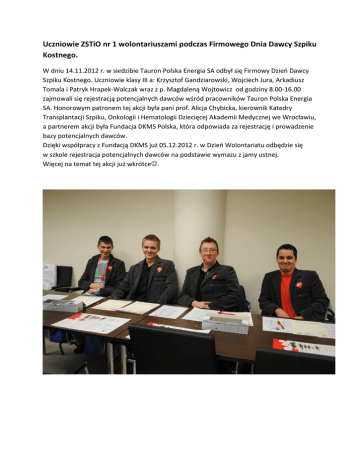 Uczniowie ZSTiO nr 1 wolontariuszami podczas Firmowego Dnia Dawcy Szpiku Kostnego. W dniu 14.11.2012 r. w siedzibie Tauron Polska Energia SA odbył się Firmowy Dzień Dawcy Szpiku Kostnego. Uczniowie klasy III a: Krzysztof Gandziarowski, Wojciech Jura, Arkadiusz Tomala i Patryk Hrapek-Walczak wraz z p. Magdaleną Wojtowicz od godziny 8.00-16.00 zajmowali się rejestracją potencjalnych dawców wśród pracowników Tauron Polska Energia SA. Honorowym patronem tej akcji była pani prof. Alicja Chybicka, kierownik Katedry Transplantacji Szpiku, Onkologii i Hematologii Dziecięcej Akademii Medycznej we Wrocławiu, a partnerem akcji była Fundacja DKMS Polska, która odpowiada za rejestrację i prowadzenie bazy potencjalnych dawców. Dzięki współpracy z Fundacją DKMS już 05.12.2012 r. w Dzień Wolontariatu odbędzie się w szkole rejestracja potencjalnych dawców na podstawie wymazu z jamy ustnej. Więcej na temat tej akcji już wkrótce.