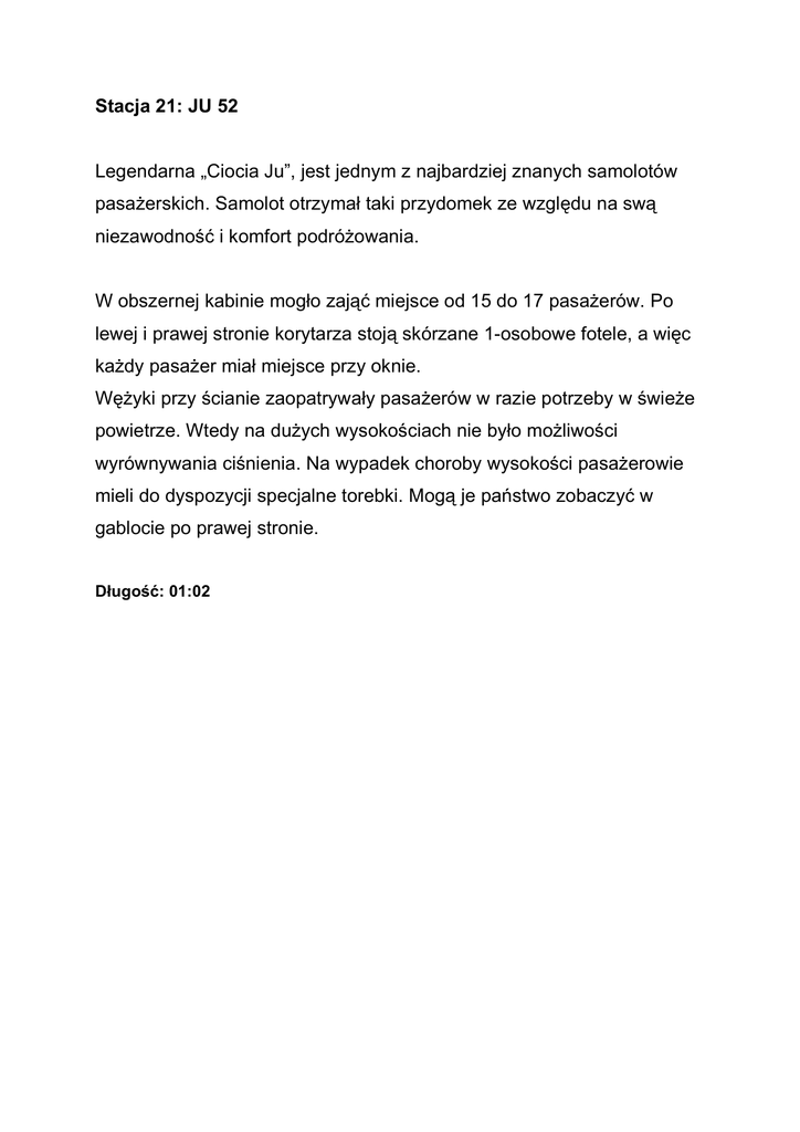 Stacja 21: JU 52 Legendarna „Ciocia Ju”, jest jednym z najbardziej znanych samolotów pasażerskich. Samolot otrzymał taki przydomek ze względu na swą niezawodność i komfort podróżowania. W obszernej kabinie mogło zająć miejsce od 15 do 17 pasażerów. Po lewej i prawej stronie korytarza stoją skórzane 1-osobowe fotele, a więc każdy pasażer miał miejsce przy oknie. Wężyki przy ścianie zaopatrywały pasażerów w razie potrzeby w świeże powietrze. Wtedy na dużych wysokościach nie było możliwości wyrównywania ciśnienia. Na wypadek choroby wysokości pasażerowie mieli do dyspozycji specjalne torebki. Mogą je państwo zobaczyć w gablocie po prawej stronie. Długość: 01:02