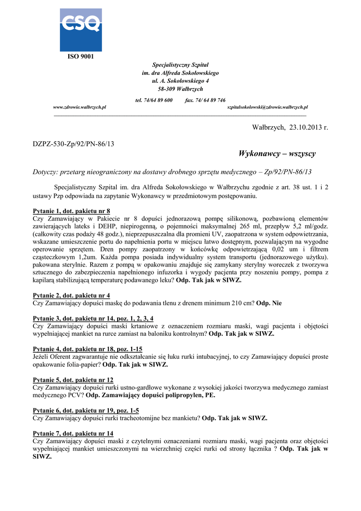 ISO 9001 Specjalistyczny Szpital im. dra Alfreda Sokołowskiego ul. A. Sokołowskiego 4 58-309 Wałbrzych tel. 74/64 89 600 fax. 74/ 64 89 746 www.zdrowie.walbrzych.pl [email protected] ________________________________________________________________________________________________________ Wałbrzych, 23.10.2013 r. DZPZ-530-Zp/92/PN-86/13 Wykonawcy – wszyscy Dotyczy: przetarg nieograniczony na dostawy drobnego sprzętu medycznego – Zp/92/PN-86/13 Specjalistyczny Szpital im. dra Alfreda Sokołowskiego w Wałbrzychu zgodnie z art. 38 ust. 1 i 2 ustawy Pzp odpowiada na zapytanie Wykonawcy w przedmiotowym postępowaniu. Pytanie 1, dot. pakietu nr 8 Czy Zamawiający w Pakiecie nr 8 dopuści jednorazową pompę silikonową, pozbawioną elementów zawierających lateks i DEHP, niepirogenną, o pojemności maksymalnej 265 ml, przepływ 5,2 ml/godz. (całkowity czas podaŜy 48 godz.), nieprzepuszczalna dla promieni UV, zaopatrzona w system odpowietrzania, wskazane umieszczenie portu do napełnienia portu w miejscu łatwo dostępnym, pozwalającym na wygodne operowanie sprzętem. Dren pompy zaopatrzony w końcówkę odpowietrzającą 0,02 um i filtrem cząsteczkowym 1,2um. KaŜda pompa posiada indywidualny system transportu (jednorazowego uŜytku). pakowana sterylnie. Razem z pompą w opakowaniu znajduje się zamykany sterylny woreczek z tworzywa sztucznego do zabezpieczenia napełnionego infuzorka i wygody pacjenta przy noszeniu pompy, pompa z kapilarą stabilizującą temperaturę podawanego leku? Odp. Tak jak w SIWZ. Pytanie 2, dot. pakietu nr 4 Czy Zamawiający dopuści maskę do podawania tlenu z drenem minimum 210 cm? Odp. Nie Pytanie 3, dot. pakietu nr 14, poz. 1, 2, 3, 4 Czy Zamawiający dopuści maski krtaniowe z oznaczeniem rozmiaru maski, wagi pacjenta i objętości wypełniającej mankiet na rurce zamiast na baloniku kontrolnym? Odp. Tak jak w SIWZ. Pytanie 4, dot. pakietu nr 18, poz. 1-15 JeŜeli Oferent zagwarantuje nie odkształcanie się łuku rurki intubacyjnej, to czy Zamawiający dopuści proste opakowanie folia-papier? Odp. Tak jak w SIWZ. Pytanie 5, dot. pakietu nr 12 Czy Zamawiający dopuści rurki ustno-gardłowe wykonane z wysokiej jakości tworzywa medycznego zamiast medycznego PCV? Odp. Zamawiający dopuści polipropylen, PE. Pytanie 6, dot. pakietu nr 19, poz. 1-5 Czy Zamawiający dopuści rurki tracheotomijne bez mankietu? Odp. Tak jak w SIWZ. Pytanie 7, dot. pakietu nr 14 Czy Zamawiający dopuści maski z czytelnymi oznaczeniami rozmiaru maski, wagi pacjenta oraz objętości wypełniającej mankiet umieszczonymi na wierzchniej części rurki od strony łącznika ? Odp. Tak jak w SIWZ. Pytanie 8, dot. pakietu nr 9 Czy Zamawiający dopuści zestaw okulistyczny sterylny, posiadający zintegrowanym zbiornik z folią, torebka na płyny 22x29 cm, pozostałe parametry bez zmian? Odp. Zgodnie z SIWZ. Ze względu na konieczność uruchomienia produkcji zestawów operacyjnych przez producenta Czy Zamawiający wyrazi zgodę na wydłuŜenie czasu realizacji pierwszej dostawy do 6 tygodni od daty złoŜenia zamówienia? Odp. Nie Pytanie 9, dot. pakietu nr 4 Zwracamy się z uprzejmą prośbą do Zamawiającego o dopuszczenie w Pakiecie nr 4 masek do podawania tlenu dla dorosłych, biologicznie czystych o długości 2,1m . Odp. Nie Pytanie 10, dot. pakietu nr 6 Zwracamy się z uprzejmą prośbą do Zamawiającego o dopuszczenie w Pakiecie nr 6 cewników do podawania tlenu, biologicznie czystych o długości 2,1m . Odp. Nie Pytanie 11, dot. pakietu nr 1 Prosimy o dopuszczenie nakłuwaczy automatycznych w opakowaniu a’100szt z przeliczeniem podanych ilości. Odp. Tak Pytanie 12, dot. pakietu nr 4 Prosimy o dopuszczenie maski do podawania tlenu z drenem o długości 2,1metra, spełniającej pozostałe wymagania SIWZ. Odp. Nie Pytanie 13, dot. pakietu nr 6 Prosimy o dopuszczenie cewnika do podawania tlenu (wąsy tlenowe) o długości 3m i 5m. Odp. Tak Czy Zamawiający wymagając cewnika do podawania tlenu z regulacją ma na myśli regulację końcówek nosowych czy regulację mocowania (drenu). Prosimy o dopuszczenie regulacji mocowania (drenu). Odp. Zamawiający dopuszcza. Pytanie 14, dot. pakietu nr 9 Czy Zamawiający dopuści serwetę okulistyczną 120x170cm z folią operacyjną i 2 kieszeniami na płyny. Serweta wykonana z włókniny, okienko z folią operacyjną o wym. 10x10cm. Posiada 2-wie kieszenie na płyny o wym. 20x25 cm, z usztynieniem/kształtką metalową w górnej części kieszeni. 1 usztywnienie/ kształtka metalowa o dług. 40cm, do ufiksowania całej serwety. Posiada informację o dacie waŜności i nr serii w postaci 2 naklejek typu TAG do wklejenia w karcie pacjenta. Produkt jest bezpiecznie pakowany do transportu i magazynowania - opakowanie typu FOLIA-PAPIER. Odp. Zgodnie z SIWZ. Pytanie 15, dot. pakietu nr 10 Czy Zamawiający dopuści zestawy do infuzji z zagiętą igłą Hubera i z przedłuŜaczem o parametrach: wskazane do podawania roztworów leków i do pobierania krwi przez podskórny wszczepiony port dostępu; igła Huber ze skrzydełkami do mocowania umoŜliwia dobre przyleganie do skóry; zacisk; łącznik końcowy Luer-Lock; nie zawierają lateksu, niepirogenne; sterylne; jednorazowego uŜytku; okres przydatności: 5lat; Odp. Tak jak w SIWZ. Pytanie 16, dot. pakietu nr 12 Czy Zamawiający dopuści rurkę ustno-gardłową wykonaną z PE, spełniającą pozostałe wymagania SIWZ? Odp. Tak Zamawiający dopuszcza. Pytanie 17, dot. pakietu nr 14 Czy Zamawiający dopuści maski krtaniowe z pełnym oznaczeniem na korpusie rurki (rozmiar, pojemność mankietu, przedział wagowy), spełniające pozostałe wymagania SIWZ? Odp. Tak jak w SIWZ. Pytanie 18, dot. pakietu nr 15 Czy Zamawiający dopuści worki oddechowe silikonowe, spełniające pozostałe wymagania SIWZ? Odp. Tak, dopuści. Pytanie 19, dot. pakietu nr 18 Czy Zamawiający dopuści rurki intubacyjne w opakowaniu folia-papier bez profilu ułatwiającego zachowanie pamięci kształtu rurki. Pragniemy 