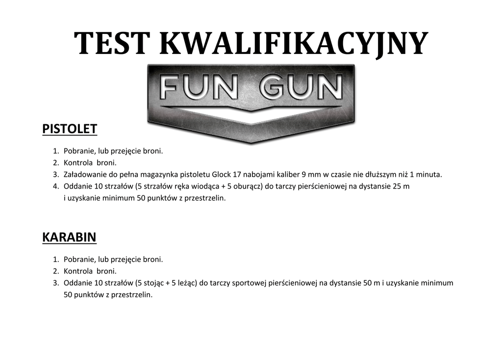 TEST KWALIFIKACYJNY PISTOLET 1. 2. 3. 4. Pobranie, lub przejęcie broni. Kontrola broni. Załadowanie do pełna magazynka pistoletu Glock 17 nabojami kaliber 9 mm w czasie nie dłuższym niż 1 minuta. Oddanie 10 strzałów (5 strzałów ręka wiodąca + 5 oburącz) do tarczy pierścieniowej na dystansie 25 m i uzyskanie minimum 50 punktów z przestrzelin. KARABIN 1. Pobranie, lub przejęcie broni. 2. Kontrola broni. 3. Oddanie 10 strzałów (5 stojąc + 5 leżąc) do tarczy sportowej pierścieniowej na dystansie 50 m i uzyskanie minimum 50 punktów z przestrzelin.