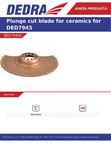 Plunge cut blade for ceramics for DED7945 DED79452 DED79452 DED79452 Dedra-Exim Sp. z o.o. | ul. 3 Maja 8, 05-800 Pruszków | tel.: +48 22 738 37 77 | e-mail: [email protected] | dedra.pl | pansam.pl | desconpolska.pl