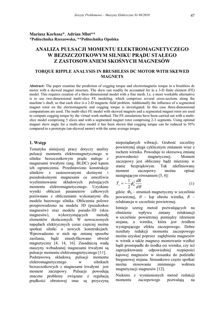 Zeszyty Problemowe – Maszyny Elektryczne Nr 88/2010 47 Mariusz Korkosz*, Adrian Młot** *Politechnika Rzeszowska, **Politechnika Opolska ANALIZA PULSACJI MOMENTU ELEKTROMAGNETYCZEGO W BEZSZCZOTKOWYM SILNIKU PRĄDU STAŁEGO Z ZASTOSOWANIEM SKOŚNYCH MAGNESÓW TORQUE RIPPLE ANALYSIS IN BRUSHLESS DC MOTOR WITH SKEWED MAGNETS Abstract: The paper examine the prediction of cogging torque and electromagnetic torque in a brushless dc motor with a skewed magnet structure. The skew can readily be accounted for in a 3-D finite element (FE) model. This requires creation of a three-dimensional model with a fine mesh. I.e. a more workable alternative is to use two-dimensional multi-slice FE modeling, which comprises several cross-sections along the machine’s shaft, so that each slice is a 2-D magnetic field problem. Additionally the influence of a segmented magnet rotor on the electromagnetic and cogging torque is investigated. In this case three-dimensional computations are used. The multi-slice FE model with skewed magnets and a segmented magnet rotor are used to compute cogging torque by the virtual work method. The FE simulations have been carried out with a multislice model comprising 5 slices and with a segmented magnet rotor comprising 2-3 segments. Using optimal magnet skew angle for a multi-slice model it has been shown that cogging torque can be reduced to 95% compared to a prototype (un-skewed motor) with the same average torque. 1. Wstęp Tematyka niniejszej pracy dotyczy analizy pulsacji momentu elektromagnetycznego w silniku bezszczotkowym prądu stałego z magnesami trwałymi (ang. BLDC) pod kątem ich ograniczenia. Przedstawiono konstrukcje silników z zastosowanymi skośnymi i pseudoskośnymi magnesami co umoŜliwia wyeliminowanie składowych pulsujących momentu elektromagnetycznego. Uzyskane wyniki obliczeń parametrów całkowych porównano z obliczeniami wykonanymi dla modelu bazowego silnika. Obliczenia polowe przeprowadzono na modelu 3D (pseudoskos magnesów) oraz modelu pseudo-3D (skos magnesów), wykorzystujących metodę elementów skończonych. W nowoczesnych napędach elektrycznych coraz częściej moŜna spotkać silniki o nowych konstrukcjach. Wprowadzono w nich np. zmianę sposobu zasilania, bądź zmodyfikowano obwód magnetyczny [4, 14, 16]. Zasadniczą wadą maszyny wzbudzanej magnesami trwałymi są pulsacje momentu elektromagnetycznego [11]. Podstawową składową pulsacji momentu elektromagnetycznego w silnikach bezszczotkowych z magnesami trwałymi jest moment zaczepowy. Pulsacje powodują znaczne problemy związane z regulacją prędkości obrotowej oraz są przyczyną niepoŜądanych wibracji. Grubość szczeliny powietrznej ulega cyklicznym zmianom wraz z ruchem wirnika. Powoduje to okresową zmianę przewodności magnetycznej. Moment zaczepowy jest obliczany bądź mierzony w stanie bezprądowym. Tak zdefiniowany moment zaczepowy moŜna opisać następującym równaniem [5, 6]: 1 dR Tz = − φm2 (1) 2 dθ gdzie: Φm – strumień magnetyczny w szczelinie powietrznej, θ – kąt obrotu wirnika, R – reluktancja w szczelinie powietrznej. Istnieje szereg metod pozwalających na obniŜenie wpływu zmiany reluktancji w szczelinie powietrznej pomiędzy rdzeniem stojana, a wirnika, która jest źródłem występującego efektu zaczepowego. Dobre rezultaty redukcji momentu zaczepowego moŜna uzyskać poprzez zagłębienie magnesów w wirnik a takŜe magnesy montowanie wzdłuŜ bądź prostopadle do środka osi wirnika, czy teŜ zaprojektowanie odpowiedniej rozpiętości kątowej magnesów w stosunku do podziałki biegunowej stojana. Stosunkowo często spotkać moŜna stosowanie zmiennego wektora magnetyzacji magnesów [12]. Niektóre z wymienionych metod redukcji momentu zaczepowego pozwalają na 48 Zeszyty Problemowe – Maszyny Elektryczne Nr 88/2010 zmniejszenie momentu zaczepowego w porównaniu z konwencjonalnym silnikiem do 65% [2, 3, 7, 10, 12]. Niemniej jednak takie rozwiązania nie pozwalają na całkowitą redukcję momentu zaczepowego. Konstrukcja silnika ze stojanem mostowym umoŜliwia wyeliminowanie niemal całkowicie zjawiska zmiennej reluktancji, występującego w silnikach z otwartymi Ŝłobkami [14]. Z uwagi na problemy technologiczne jest ona trudna do zastosowania praktycznego. Większość niedogodności z zastosowaniem odpowiedniej metody redukcji pulsacji pod względem prostoty konstrukcji moŜna uniknąć przy zastosowaniu skosu magnesów bądź pseudoskosu magnesów [1, 8, 9, 13, 15]. 2. Konstrukcja obwodu magnetycznego silnika BLDC Na rysunku 1 pokazano prototyp silnika BLDC o prostych magnesach trwałych, na podstawie którego dokonano budowy modeli obliczeniowych poddanych modyfikacji. Do zasadniczych wad analizowanego silnika naleŜą duŜe pulsacje momentu elektromagnetycznego Te (76%). Moment zaczepowy Tz wynosił 0.67 N·m przy średnim momencie elektromagnetycznym Teav wynoszącym 3.41 N·m. Podstawową składową dominującą w pulsacjach momentu elektromagnetycznego badanego silnika jest moment zaczepowy zwany równieŜ momentem od zębów. Rys.1. Konstrukcja badanego silnika BLDC W stojanie silnika umieszczono trójpasmowe uzwojenie dwuwarstwowe. Wirnik wykonano z litego materiału ferromagnetycznego na powierzchni którego naklejono magnesy trwałe wykonane z pierwiastków ziem rzadkich (NdFeB). Pakietowane elementy rdzenia wykonano ze stali typu EP 600-50A. Podstawowe parametry silnika BLDC z magnesami trwałymi przedstawiono w tabeli 1. Tabela 1 Parametry badanego silnika BLDC Napięcie pasmowe Prąd obciąŜenia Prędkość obrotowa Liczba Ŝłobków Liczba biegunów Grubość szczeliny powietrznej Rozpiętość kątowa magnesów Wysokość magnesów Indukcja remanentu magnesów NatęŜenie koercji Gęstość energii Liczba zwojów w jednej cewce Liczba Ŝłobków na biegun i fazę Długość pakietu Ŝelaza stojana UN = 45 V IN = 10 A nN = 1500 min-1 Ŝ = 36 2p = 6 δg = 1.5 mm γm = 47o h = 3 mm Br = 1.21 T Hc = 892 kA/m 