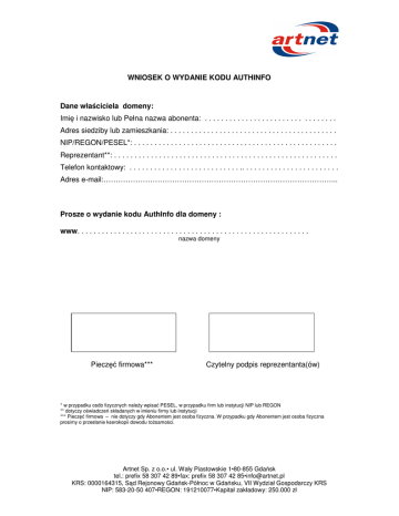 WNIOSEK O WYDANIE KODU AUTHINFO Dane właściciela domeny: Imię i nazwisko lub Pełna nazwa abonenta: . . . . . . . . . . . . . . . . . . . . . . . . . . . . . . . . Adres siedziby lub zamieszkania: . . . . . . . . . . . . . . . . . . . . . . . . . . . . . . . . . . . . . . . . . NIP/REGON/PESEL*: . . . . . . . . . . . . . . . . . . . . . . . . . . . . . . . . . . . . . . . . . . . . . . . . . . Reprezentant**: . . . . . . . . . . . . . . . . . . . . . . . . . . . . . . . . . . . . . . . . . . . . . . . . . . . . . . . Telefon kontaktowy: . . . . . . . . . . . . . . . . . . . . . . . . . . . .. . . . . . . . . . . . . . . . . . . . . . . . Adres e-mail:…………………………………………………………………………………... Prosze o wydanie kodu AuthInfo dla domeny : www. . . . . . . . . . . . . . . . . . . . . . . . . . . . . . . . . . . . . . . . . . . . . . . . . . . . . . . . . nazwa domeny Pieczęć firmowa*** Czytelny podpis reprezentanta(ów) * w przypadku osób fizycznych należy wpisać PESEL, w przypadku firm lub instytucji NIP lub REGON ** dotyczy oświadczeń składanych w imieniu firmy lub instytucji *** Pieczęć firmowa – nie dotyczy gdy Abonentem jest osoba fizyczna. W przypadku gdy Abonentem jest osoba fizyczna prosimy o przesłanie kserokopii dowodu tożsamości. Artnet Sp. z o.o.• ul. Wały Piastowskie 1•80-855 Gdańsk tel.: prefix 58 307 42 89•fax: prefix 58 307 42 85•[email protected] KRS: 0000164315, Sąd Rejonowy Gdańsk-Północ w Gdańsku, VII Wydział Gospodarczy KRS NIP: 583-20-50 407•REGON: 191210077•Kapitał zakładowy: 250.000 zł