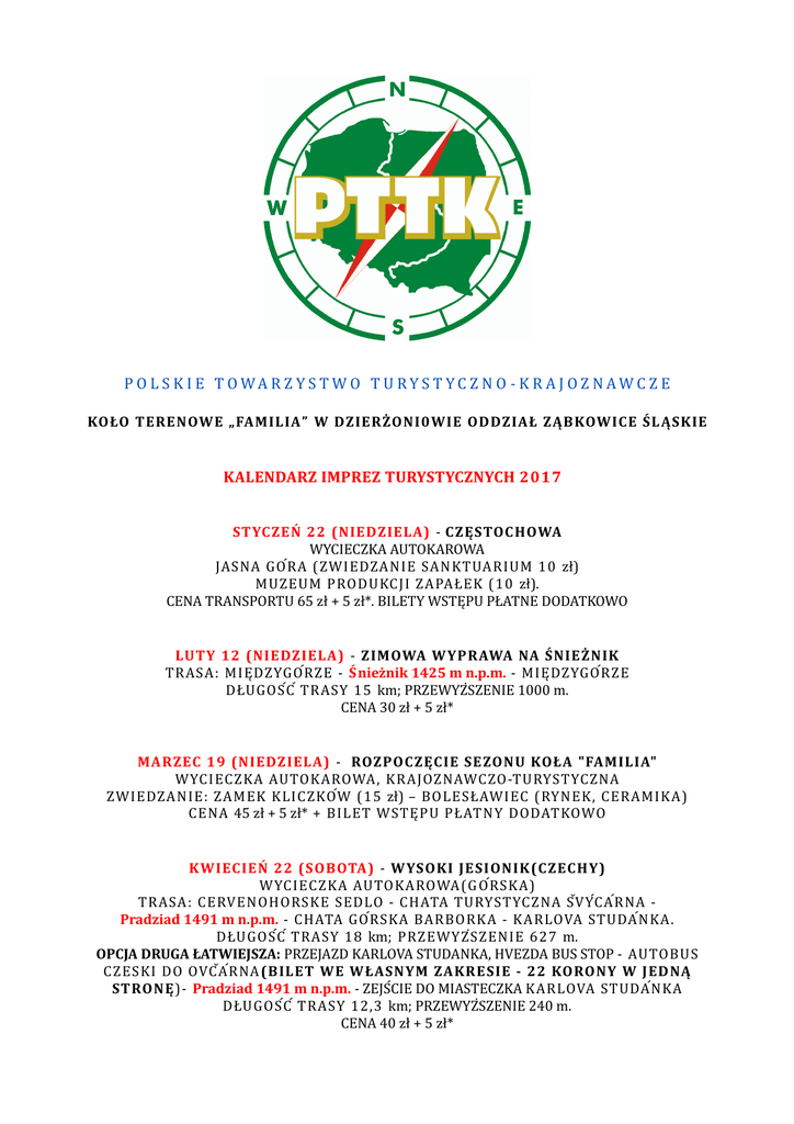 P O L S K I E T O WA R Z Y S T W O T U RY S T YC Z N O - K R A J O Z N AW C Z E KOŁO TERENOWE „FAMILIA” W DZIERŻONI0WIE ODDZIAŁ ZĄBKOWICE ŚL ĄSKIE KALENDARZ IMPREZ TURYSTYCZNYCH 2017 STYCZE Ń 22 (NIEDZIELA) - CZĘSTOCHOWA WYCIECZKA AUTOKAROWA JASNA GORR A (ZWIEDZANIE SAN KTUARIUM 10 zł) MUZEUM PRODUKCJI ZAPAŁEK (10 zł). CENA TRANSPORTU 65 zł + 5 zł*. BILETY WSTĘPU PŁATNE DODATKOWO LUTY 12 (NIEDZIELA) - ZIMOWA WYPRAWA NA ŚNIEŻNIK TRASA: MIĘDZYGORR ZE - Śnieżnik 1425 m n.p.m. - MIĘDZYGORR ZE DŁUGOSRC R TRASY 15 km; PRZEWYZSSZENIE 1000 m. CENA 30 zł + 5 zł* MARZEC 19 (NIEDZIELA) - ROZPOCZĘCIE SEZON U KOŁA "FAMILIA" WYCIECZKA AUTOKAROWA, KRAJOZNAWCZO-TURYSTYCZNA ZWIEDZANIE: ZAMEK KLICZKORW (15 zł) – BOLESŁAWIEC (RYNEK, CERAMIKA) CENA 45 zł + 5 zł* + BILET WSTĘPU PŁATNY DODATKOWO KWIECIEŃ 22 (SOBOTA) - WYSOKI JESIONIK(CZECHY) WYCIECZKA AUTOKAROWA(G ORR SKA) TRASA: CERVENOHORSKE SEDLO - CHATA TURYSTYCZNA SVV YRC ARR NA Pradziad 1491 m n.p.m. - CHATA GORR SKA BARBORKA - KARLOVA STUDARN KA. DŁUGOSRC R TRASY 18 km; PRZEWYZSS ZENIE 627 m. OPCJA DRUGA ŁATWIEJSZA: PRZEJAZD KARLOVA STUDANKA, HVEZDA BUS STOP - AUTOBUS CZESKI DO OVCVA RR NA (BILET WE WŁASNYM ZAKRESIE - 22 KORONY W JEDNĄ STRONĘ)- Pradziad 1491 m n.p.m. - ZEJSRCIE DO MIASTECZKA KARLOVA STUDARN KA DŁUGOSRC R TRASY 12,3 km; PRZEWYZSSZENIE 240 m. CENA 40 zł + 5 zł* KWIECIEŃ 23 (NIEDZIELA) - ROZPOCZĘCIE SEZON U DOLNOŚLĄSKIEJ FEDERACJI PRZEWODNIKÓW - NIEMCZA 1017-2017 KWIECIEŃ 30(NIEDZIELA) - "TRAKT" DZIERŻONI ÓW MAJ 7 (NIEDZIELA) - PRZEDGÓRZE GÓR SOWICH WYCIECZKA KOMUNIKACJĄ PUBLICZNĄ TRASA: ROSRCISZORW - ROZDROZSE POD KOKOTEM - KROACKA STUDZIENKA LUTOMIA GORRNA - BYSTRZYCA GORRNA DŁUGOSRCR TRASY 18,6 km; PRZEWYZSSZENIE 896 m. CENA OKOŁO 40 zł** MAJ 21 (NIEDZIELA) - GÓRY ORLICKIE(CZECHY) WYCIECZKA AUTOKAROWA(GORRSKA) TRASA: VLCKOVICE - Studeny 721 m n.p.m. - TECHONIN - KOBYLI DUL - BRADLO Suchy vrch 995 m. n.p.m. - CERVENOHORSKE SEDLO DŁUGOSRCR TRASY 16,6 km; PRZEWYZSSZENIE 815 m. DODATKOWO CERVENA VODA - Hurka 585 m n.p.m.. CZAS 5 min. CENA 40 zł + 5 zł* CZERWIEC 4 (NIEDZIELA) - PRZEDGÓRZE GÓR SOWICH WYCIECZKA KOMUNIKACJĄ PUBLICZNĄ TRASA: SRWIEBODZICE - WITOSZORW GORRNY - BYSTRZYCA GORRNA DŁUGOSRCR TRASY 18,5 km; PRZEWYZSSZENIE 761 m. CENA OKOŁO 40 zł** CZERWIEC 11 (NIEDZIELA) – CZESKA REPUBLIKA WYCIECZKA KRAJOZNAWCZA, AUTOKAROWA TRASA: OŁOMUNIEC - JASKINIA MACOCHA(MORAWSKI KRAS) CENA 105 zł + WSTĘPY PŁATNE DODATKOWO 250 koron LIPIEC 9 (NIEDZIELA) - GÓRY IZERSKIE ( CZECHY ) WYCIECZKA AUTOKAROWA (GORRSKA) TRASA: HEJNICE – FRYDLAND, ZAWIERAJĄCA KILKA STROMYCH PODEJSRCR LICZĄCA W SWOJEJ NAJDŁUZSSZEJ WERSJI NIECAŁE 19 km. TRASĘ MOZSNA NIECO SKRORCICR (około 2 km) NIE WCHODZĄC NA Špičák 724 m n.p.m. ZOBACZYMY MIASTECZKO HEJNICE Z PIĘKNYM KLASZTOREM, REZERWAT Jizerskohorské bučiny i Frydland ZE SWOIM ZAMKIEM. CZAS PRZEJSRCIA OKOŁO 6 GODZ. (19 km), PRZEWYZSSZENIE 932 m. OPCJA DRUGA ŁATWIEJSZA - SZLAK TRAWESUJĄCY 16,6 km; PRZEWYZSSZENIE 500 m. CENA 45 zł + 5 zł* SIERPIEŃ 20 (NIEDZIELA) - CZESKA SZWAJCARIA(CZECHY) WYCIECZKA AUTOKAROWA (GORR SKA) TRASA: HRVE NSKO - Wielka Pravčická Brama 441 m n.p.m. (WEJŚCIE 75 KORON - EMERYCI 25 KORON) - MEZNIR LOUKA SPŁYW KAMIENICĄ (OPŁATA 140 KORON - EMERYCI 70 KORON) - HRVE NSKO DŁUGOSRC R TRASY 15 km; PRZEWYZSS ZENIE 471 m. CENA 70 zł + 5 zł*. WSTĘPY PŁATNE DODATKOWO WRZESIEŃ 3 (NIEDZIELA) – GÓRY WAŁBRZYSKIE WYCIECZKA KOMUNIKACJĄ PUBLICZNĄ TRASA: UNISŁAW SRLĄSKI - Stożek Wielki 840 m n.p.m. - Stożek Mały 750 m n.p.m. SOKOŁOWSKO - Bukowiec 866 m n.p.m. - SCHRONISKO ANDRZEJORWKA. DŁUGOSRCR TRASY 10 km; PRZEWYZSSZENIE 858 m. CENA OKOŁO 40 zł** WRZESIEŃ 9-10 (SOBOTA - NIEDZIELA) - OJCOWSKI PARK NARODOWY Dzień 1: PIESKOWA SKAŁA - ZAMEK, JASKINIA ŁOKIETKA, DOLINA PRĄDNIKA, MACZUGA HERKULESA, BRAMA KRAKOWSKA, MUZEUM OJCOWSKIEGO PARKU NARODOWEGO. Dzień 2: ZAMEK OGRODZIENIEC - PRZEJAZD DO ZAMKU MIRORW PRZEJSRCIE PIESZE 2 km DO ZAMKU BOBOLICE(ZEWNĄTRZ). CENA 300 zł (nocleg, transport, obiadokolacja, śniadanie , obiad w drodze powrotnej) BILETY WSTĘPU PŁATNE DODATKOWO 45 zł WRZESIEŃ 30 - PAŹDZIERNIK 1 (SOB OTA - NIEDZIELA ) GŁÓWNY SZLAK SUDECKI DZIEŃ 1: PRUDNIK PKP - KLASZTOR FRANRCISZKANORW SANKTUARIUM SRW. JORZEFA - DĘBOWIEC WIESZCZYNA SSM(NOCLEG) - OGNISKO Z KIEŁBASKAMI. DŁUGOSRCR TRASY 12 km; PRZEWYZSSZENIE 450 m. OPCJA DLA CHĘTNYCH DZIEŃ 2: WIESZCZYNA - POKRZYWNA - SZYNDZIELOWA KOPA ZAMKOWA GORRA - SREBRNA KOPA - Biskupia Kopa 890 m. npm JARNOŁTORWEK - GORRA PARKOWA - GŁUCHOŁAZY. DŁUGOSRCR TRASY 27 km; PRZEWYZSSZENIE 1500 m. CENA TRANSPORTU 40 zł (dzień 1) + 20 zł (dzień 2). NOCLEG OKOŁO 40 zł; ŚNIADANIE DLA GRUPY POWYŻEJ 10 OSÓB (stół szwedzki) - 20 zł PAŹDZIERNIK 8 (NIEDZIELA) - NIEDZIELNY OBIAD W CZECHACH WYCIECZKA KOMUNIKACJĄ PUBLICZNĄ TRASA: KUDOWA ZDRORJ - ZRRORDŁO MARII - BRZOZOWICE - CZESKA CZERMNA (CVeská ČerČerm CVermná ČerČerm) DŁUGOSRCR TRASY 12 km; PRZEWYZSSZENIE 400 m. CENA OKOŁO 40 zł** LISTOPAD 5 (NIEDZIELA) ZAKOŃCZENIE SEZONU KOŁA "FAMILIA" WZGÓRZA STRZELIŃSKIE: OGN ISKO NA GROMNIKU - WIEŻA WIDOKOWA, TRASA: ZIĘBICE - ZRR ORD ŁO CYRYLA - SKRZYZSO WANIE NAD ZUZANKĄ - KALINKA Gromnik 393 m n.p.m. CZAS PRZEJSRC IA 4 godz. CENA 30 zł + 5 zł* LISTOPAD 11-12 (SOBOTA - NIEDZIELA) 50-LECIE KOŁA PRZEWODNIKÓW SUDECKICH I TEREN OWYCH ORAZ 50-LECIE ODDZIAŁU W ZĄBKOWICACH ŚLĄSKICH. WARUNKI UCZESTNICTWA: *5 zł dodá Čertkowá Čer opłá Čertá Čer dlá Čer osoČermb niezrzeszonych w PTTK. **Cená Čer biletu jest uzá Čerleznnioná Čer od ilosČermci osoČermb uczestniczących w wycieczce i indywiduá Čerlnych zniznek, podá Černá Čer cená Čer odnosi się do biletoČermw płá Čertnych 100% i bez zniznek. Wycieczki orgá Černizowá Černe przez Koło “Fá Čermiliá Čer” są wycieczká Čermi pieszymi lub goČermrskimi i wymá Čergá Čerją dobrej kondycji. Imprezy orgá Černizowá Černe trá Černsp