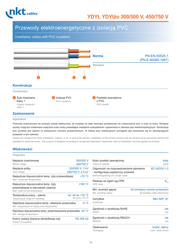 YDYt, YDYtżo 300/500 V, 450/750 V Przewody elektroenergetyczne z izolacją PVC Installation cables with PVC insulation Norma PN-EN-50525-1 (PN-E-90060:1987) Standard 3 2 1 Konstrukcja Construction 1 Żyła miedziana klasy 1 2 Izolacja PVC 3 PVC insulation Copper conductor class 1 Powłoka zewnętrzna z PVC PVC sheath Zastosowanie Application Przewody przeznaczone do przesyłu energii elektrycznej, do instalacji na stałe wewnątrz pomieszczeń do umieszczania pod, w oraz na tynku. Niniejsze wyroby mogą być instalowane wyłącznie przez osoby posiadające niezbędne wykształcenie i uprawnienia w zakresie prac elektroinstalacyjnych. Konstrukcja tych wyrobów jest zgodna ze wskazanymi normami przedmiotowymi. W trakcie prac instalacyjnych wymagane jest stosowanie się do obowiązujących przepisów w tym zakresie. Cables are designed for fixed installation, indoors, in air, in and under plaster. Installation of the product should only be carried out by personnel trained and qualified for electrical works. The product is designed according to recognized standards. Applicable rules of installation must be applied at all times. Właściwości Properties Napięcie znamionowe 300/500 V 450/750 V Rated voltage Napięcie próby Test voltage 300/500 V: 2 kV 450/750 V: 2,5 kV Najwyższa dopuszczalna temp. żyły przewodzącej Temperature range for handling Reakcja na ogień wg CPR +160 °C CPR class Min. promień gięcia Min. bending radius od -40 do +70 °C -40 up to +70 °C Najniższa dopuszczalna temp. układania przewodów Certyfikat IEC 60332-1-2 Eca 4d (mniejszy wymiar przewodu) 4d (smaller cable dimension) BBJ SEP „B” Certificate -5 °C Min. temperature for laying and manipulation Najniższa dopuszczalna temp. przechowywania przewodów -40 °C Min. storage temperature Kolory izolacji (barwna identyfikacja żył) white Self-extinguishing of a single cable +70 °C Max. short-circuit temperature Temperatura pracy - zakres biały Colour of sheath Odporność na rozprzestrzenianie płomienia - konfiguracja pojedynczy przewód Max. conductor temperature Najwyższa dopuszczalna temp. żyły przewodzącej w warunkach zwarcia Kolor powłoki zewnętrznej HD 308 S2 Colour of insulation Zgodność z dyrektywą RoHS tak RoHS yes Zgodność z dyrektywą REACH tak REACH yes Opakowania Packaging 31 krążki, bębny coils, cable drums YDYt, YDYtżo 300/500 V, 450/750 V Dane techniczne Technical data YDYt, YDYtżo 300/500 V Liczba i przekrój znamionowy żył No. of cores and cross-section Grubość znamionowa izolacji Nominal insulation thickness Grubość znamionowa opony Nominal sheath thickness Średnica zewnętrzna przewodu - wartość obliczeniowa Outer diameter approx. Orientacyjna masa przewodu o długości 1km Cable mass approx. Max. rezystancja żył w temp. 20°C Effective resistance of conductor mm² mm mm mm kg/km Ω/km 2x1 0,6 0,6 3,4x10,4 50 18,1 2x1,5 0,6 0,6 3,7x11,0 61 12,1 2x2,5 0,6 0,6 4,0x11,7 81 7,41 3x1 0,6 0,6 3,4x13,2 71 18,1 3x1,5 0,6 0,6 3,7x14,2 87 12,1 3x2,5 0,6 0,6 4,0x15,6 118 7,41 YDYt, YDYtżo 450/750 V Liczba i przekrój znamionowy żył No. of cores and cross-section Grubość znamionowa izolacji Nominal insulation thickness Grubość znamionowa opony Nominal sheath thickness Średnica zewnętrzna przewodu - wartość obliczeniowa Outer diameter approx. Orientacyjna masa przewodu o długości 1km Cable mass approx. Max. rezystancja żył w temp. 20°C Effective resistance of conductor mm² mm mm mm kg/km Ω/km 2x1 0,8 1,2 4,9x15,1 89 18,1 2x1,5 0,8 1,2 5,2x15,7 101 12,1 2x2,5 0,8 1,2 5,5x16,4 124 7,41 3x1 0,8 1,2 4,9x19,3 124 18,1 3x1,5 0,8 1,2 5,2x20,1 137 12,1 3x2,5 0,8 1,2 5,5x21,2 177 7,41 Wszelkie prawa zastrzeżone. Jakiekolwiek nieautoryzowane wykorzystanie, rozpowszechnianie lub powielanie części lub całości materiałów w jakiejkolwiek formie stanowić będzie naruszenie praw autorskich. Dane są tylko orientacyjne i nie powinny być traktowane jako wiążące oświadczenie lub gwarancję ze strony nkt cables dotyczącej właściwości produktu lub ich użytkowania. Dane nie są wyczerpujące i powinny być czytane razem z innymi danymi technicznymi produktów nkt cables, publikowanymi bądź nie. nkt cables zastrzega sobie prawo do zmiany danych bez wcześniejszego powiadomienia. All rights reserved. Any unauthorized usage, redistribution or reproduction of part or all of the content in any form will constitute an infringement of copyright. The data are only indicative and should not be considered a binding representation or warranty from nkt cables concerning a product’s properties or usability. The data page is not exhaustive and should be read in conjunction with nkt cables other product data sheets, whether published or not. nkt cables reserves the right to change the data page without prior notice. 32
